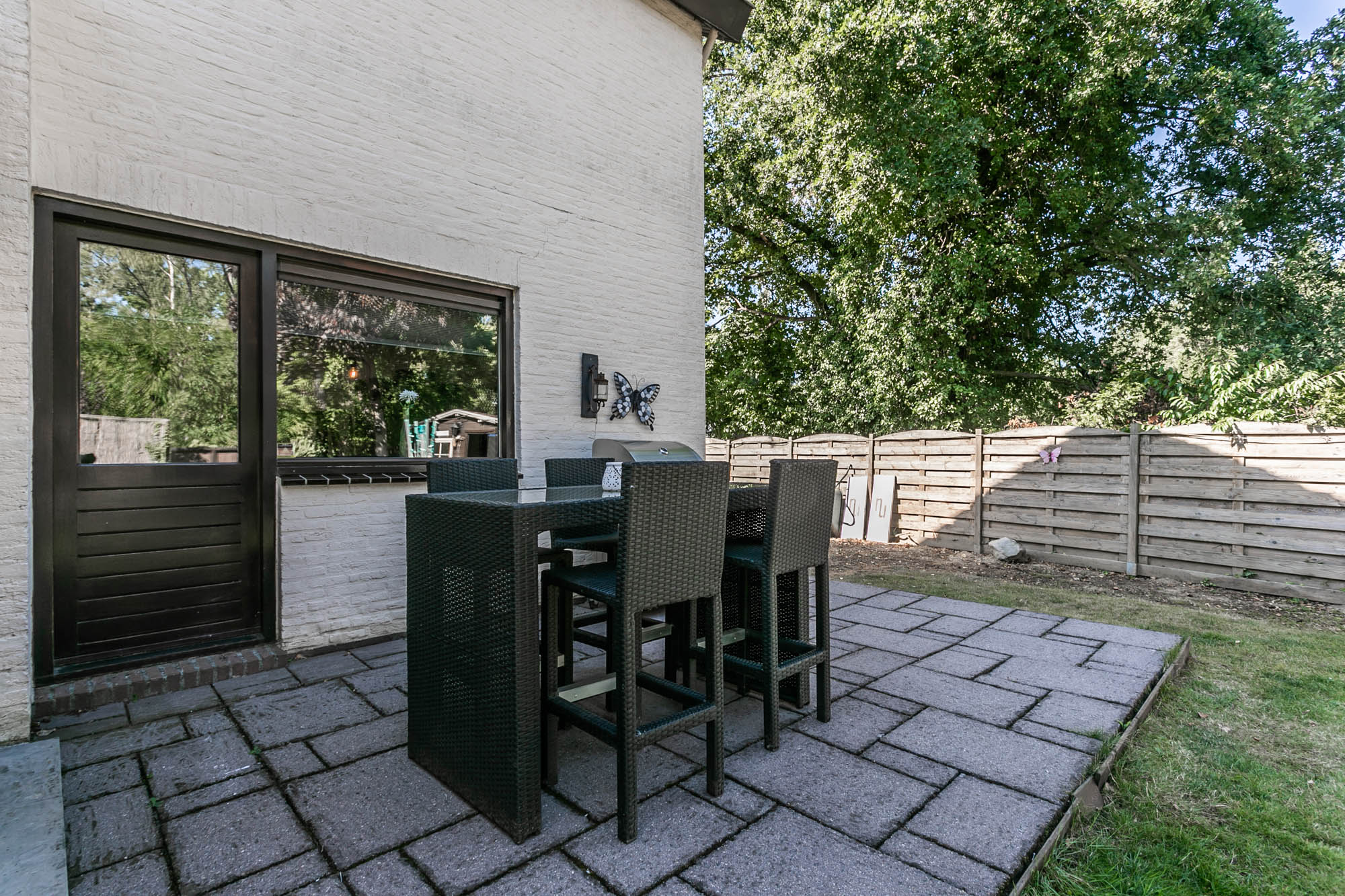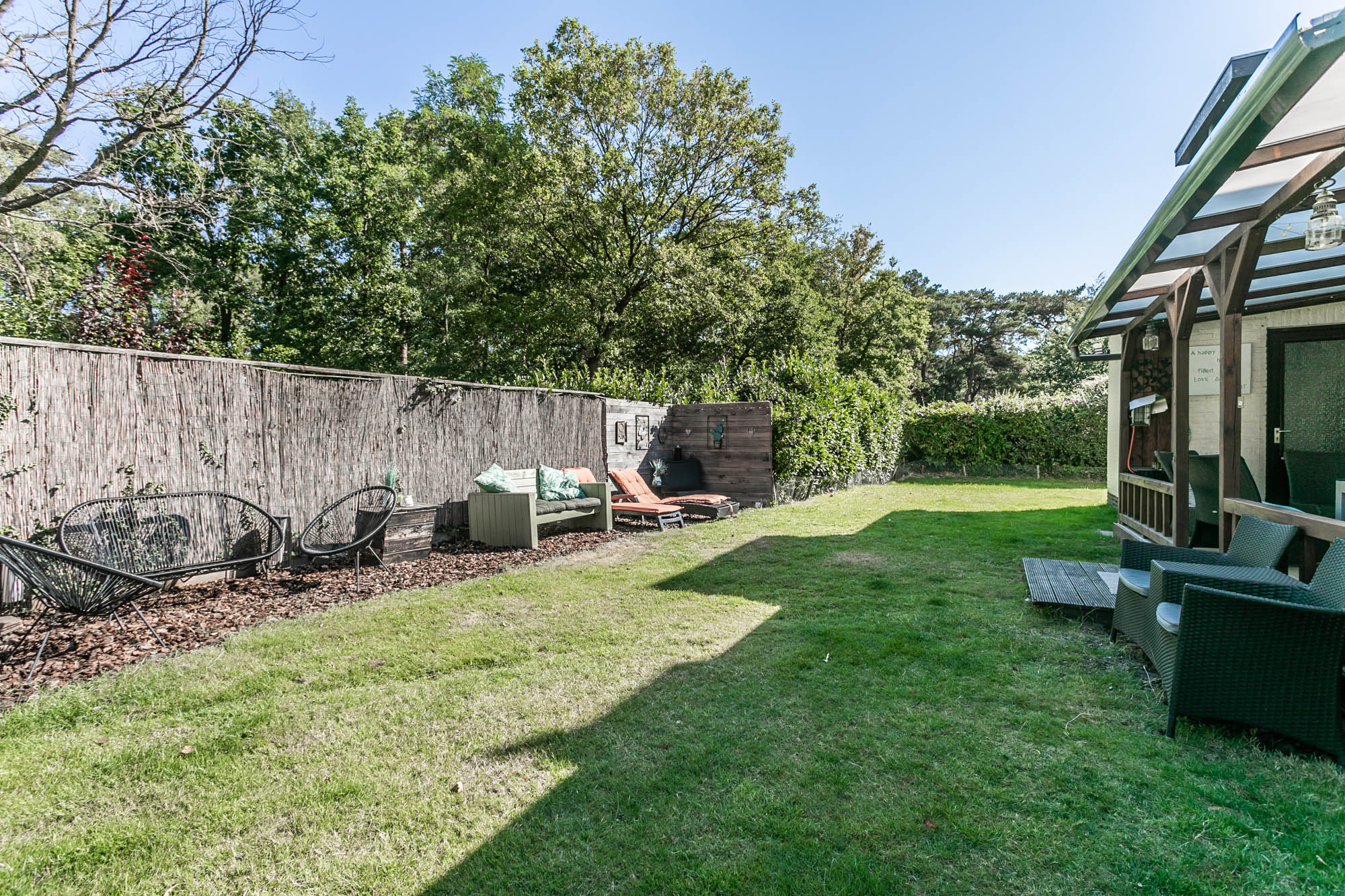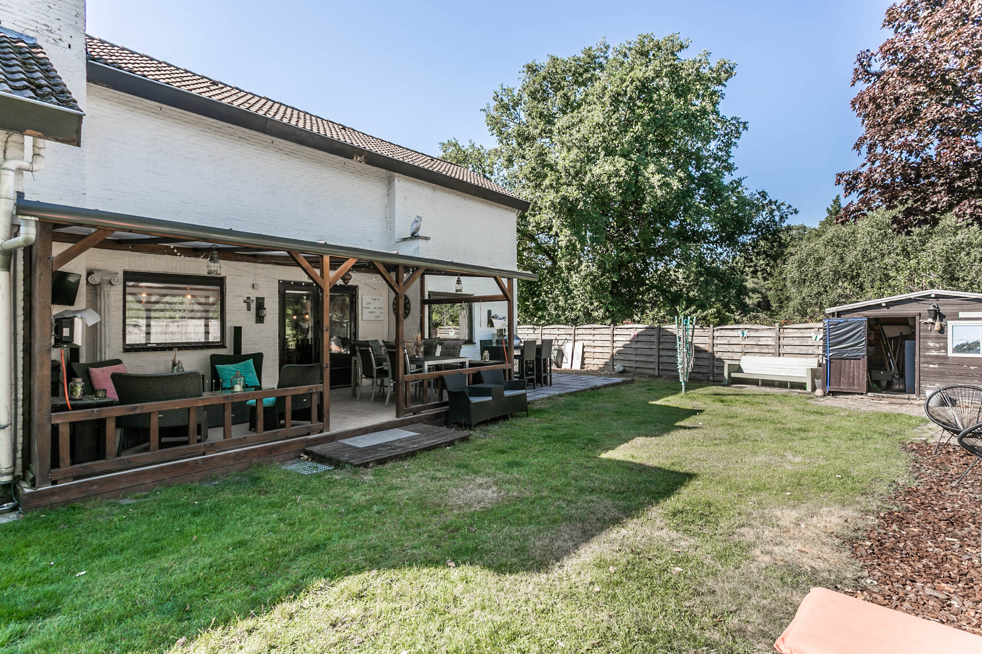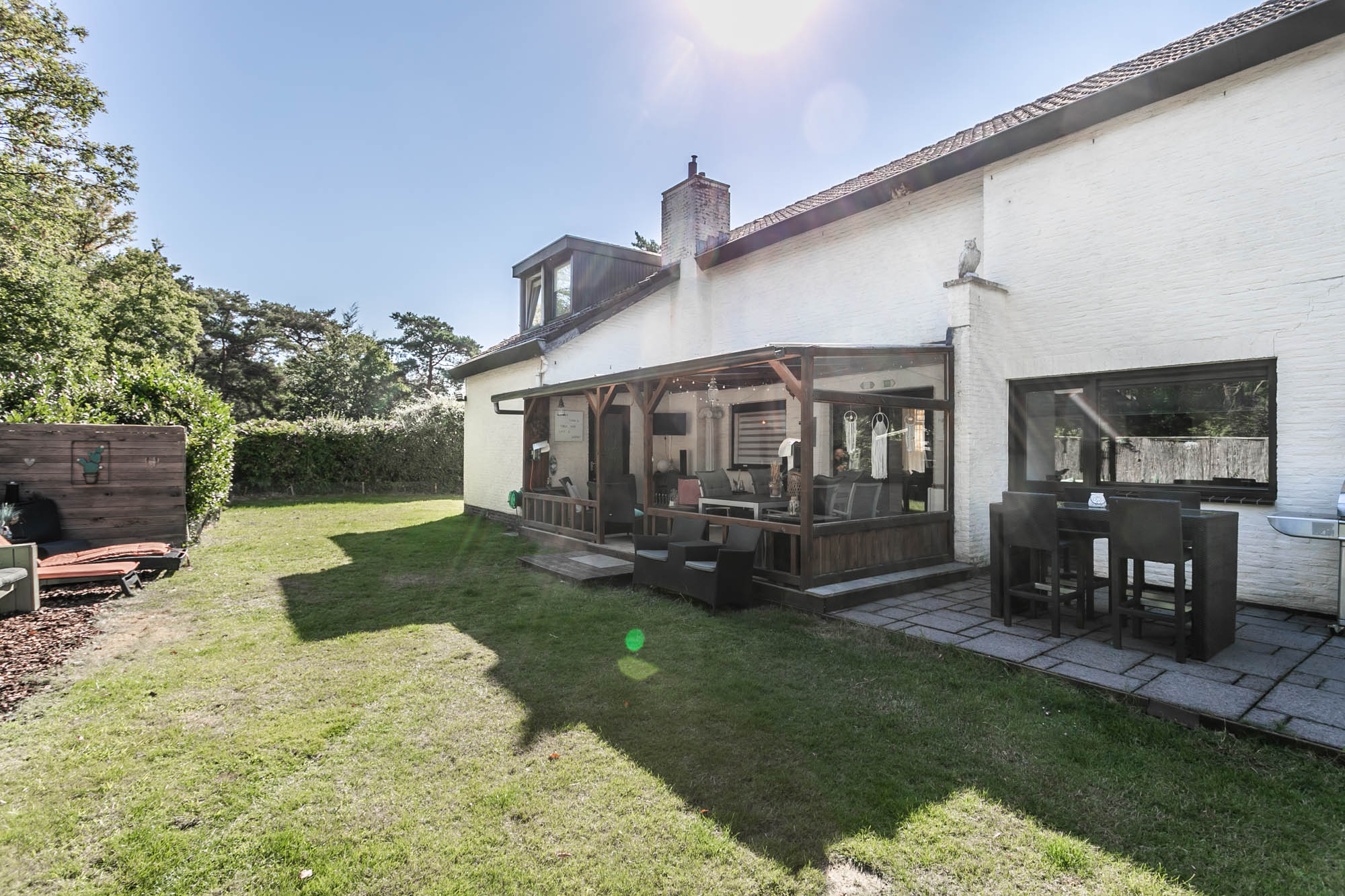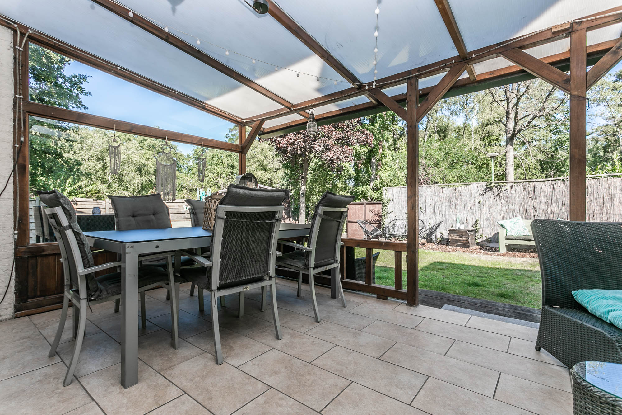 De openslaande deuren leiden naar het overdekte terras, waar u in alle rust geniet van uw tuin.