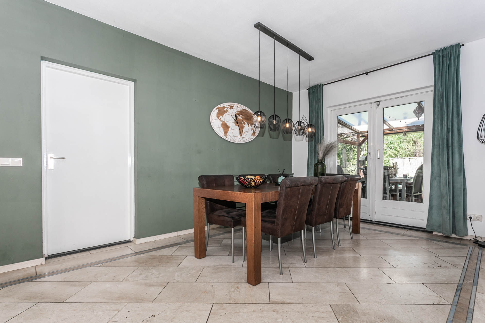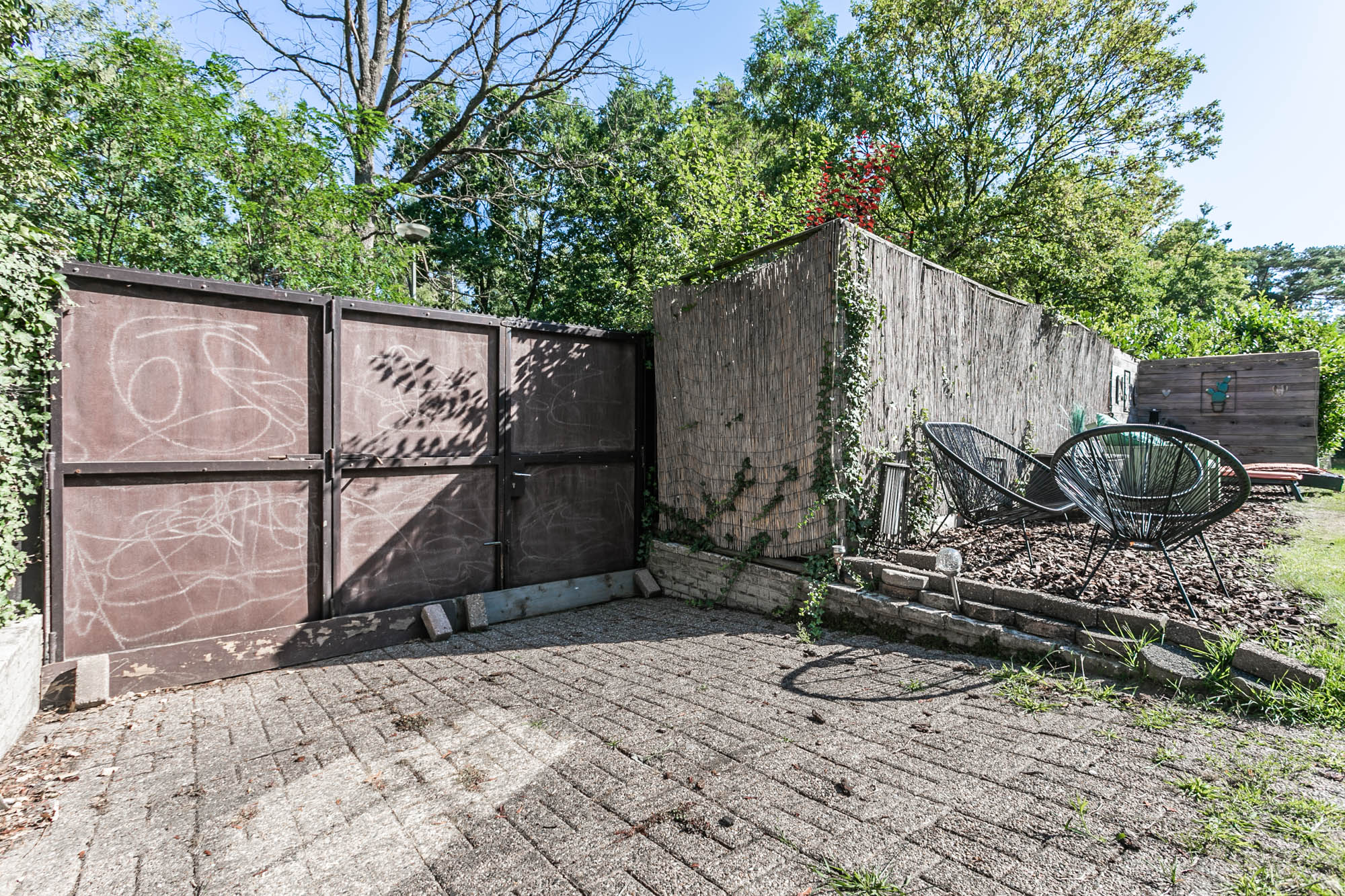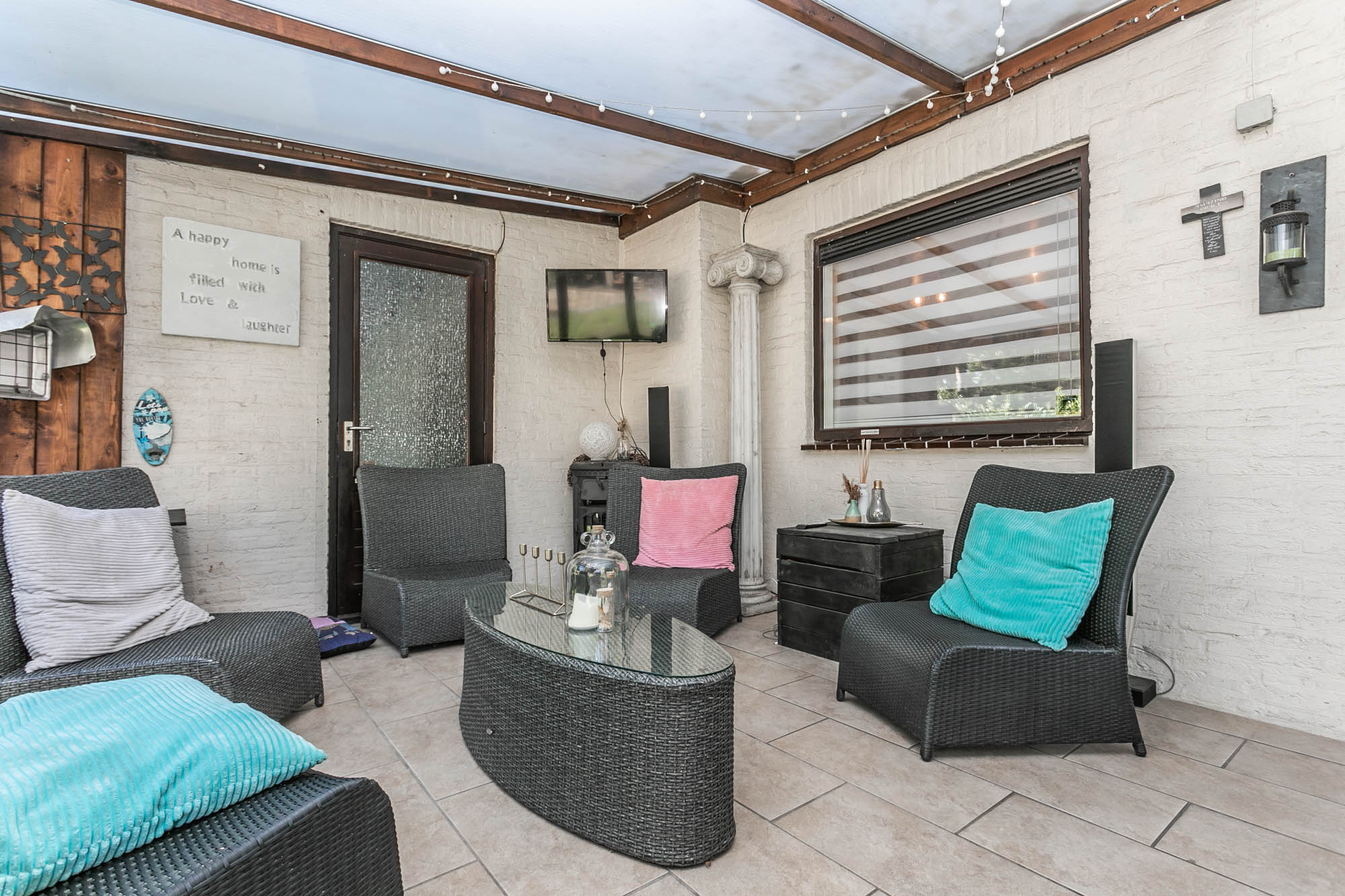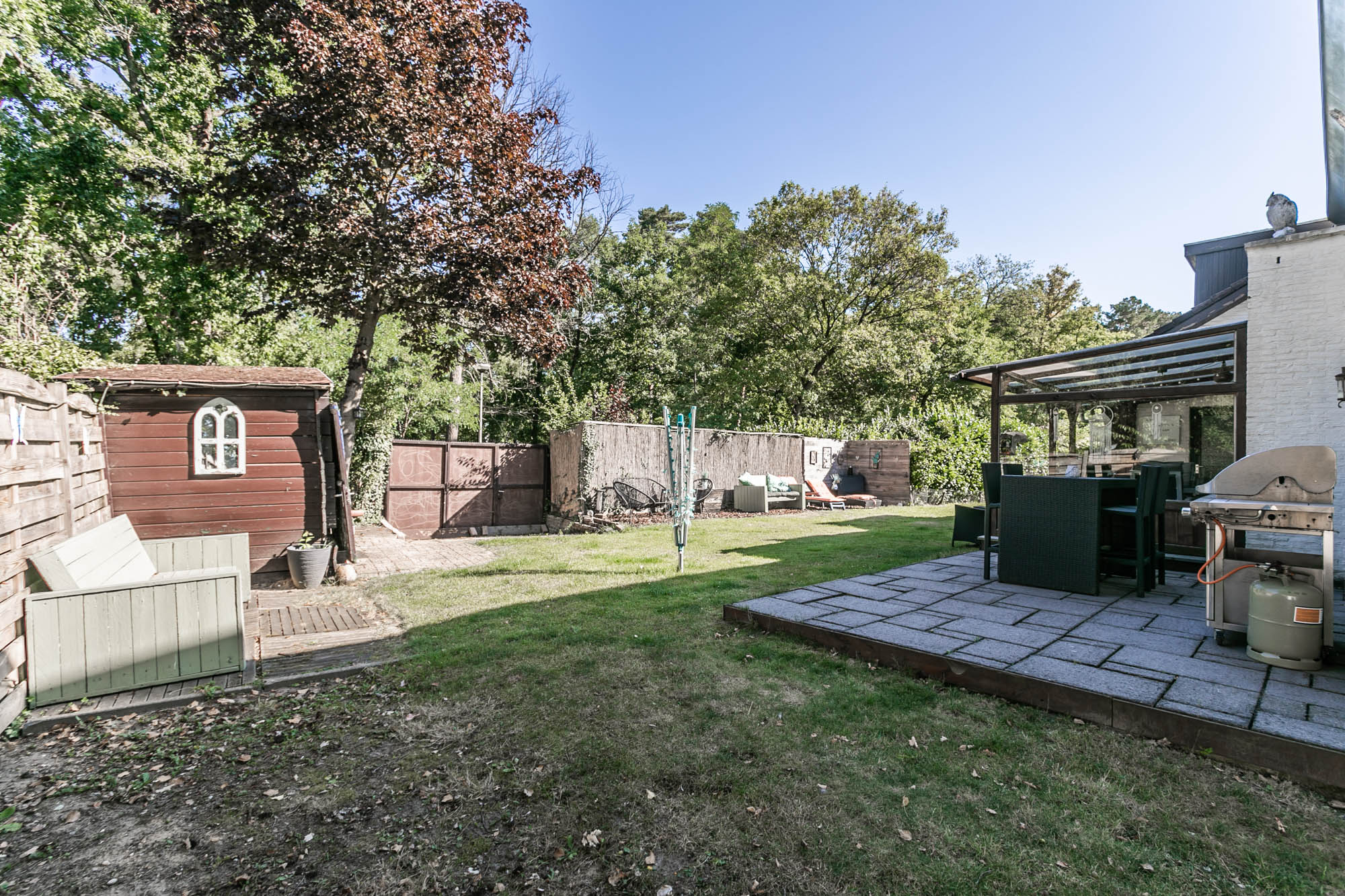 De openslaande deuren leiden naar het overdekte terras, waar u in alle rust geniet van uw tuin.