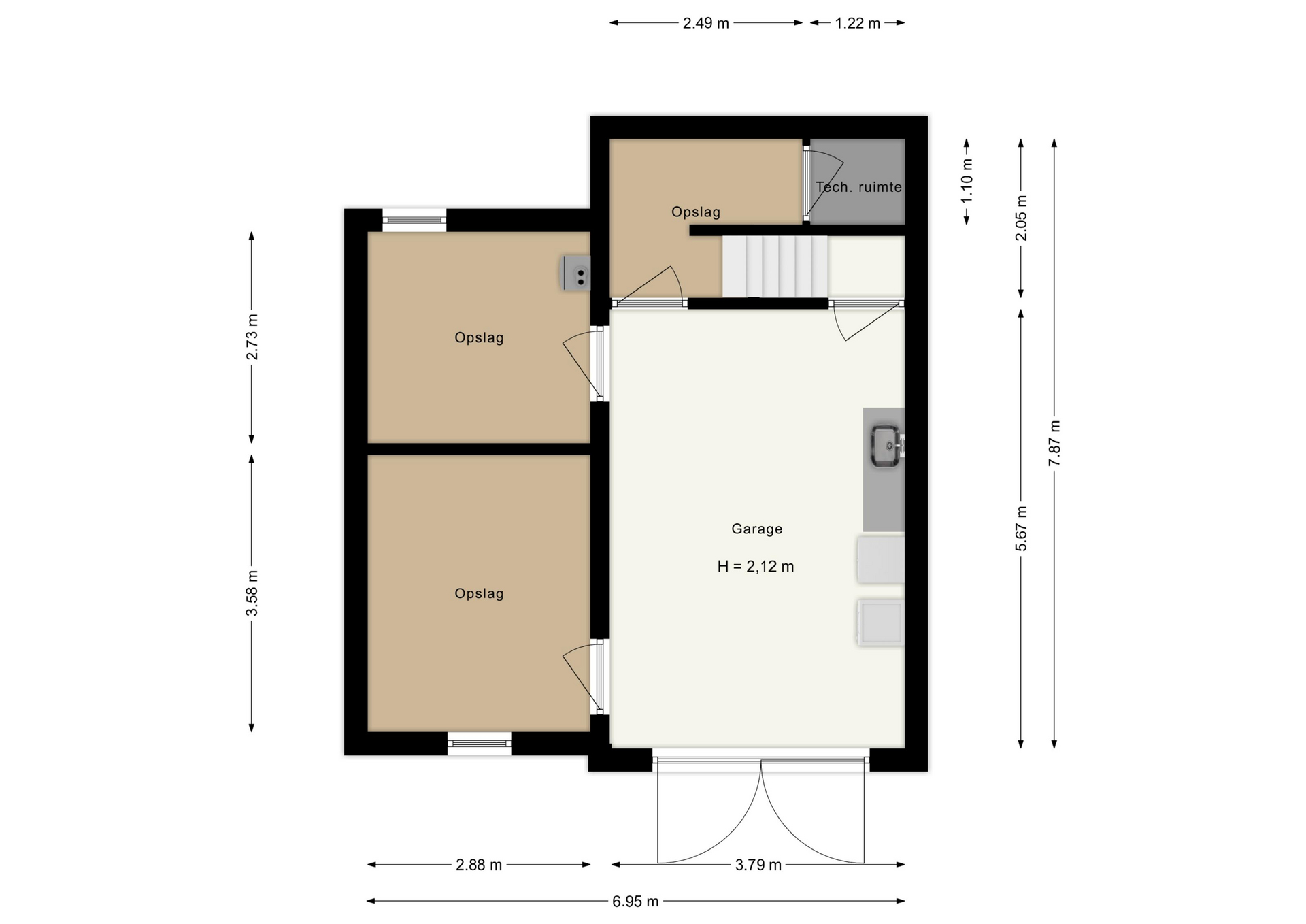 Het souterrain biedt praktische extra ruimtes zoals een voorraadkelder (3.58*2.88m), stookruimte met opslagruimte (2.88*2.73m) en een inpandige garage (5.67*3.79m) .