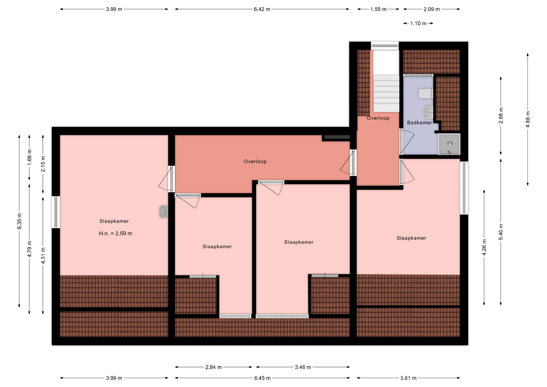 De bovenverdieping herbergt vier ruime slaapkamers (5.40*3.81 en 6.35*3.99 en 4.79*3.46 en 4.31*2.84m), waarvan twee met kunststof dakkapel. Hier bevindt zich tevens een tweede badkamer (2.86*2.09/1.10m) met douche, toilet en wastafel.