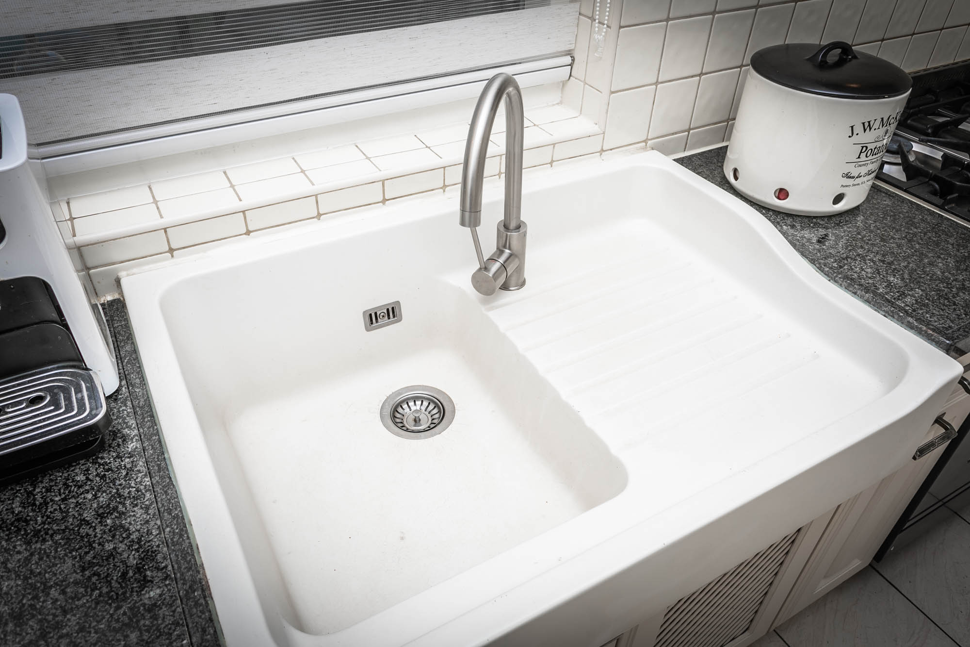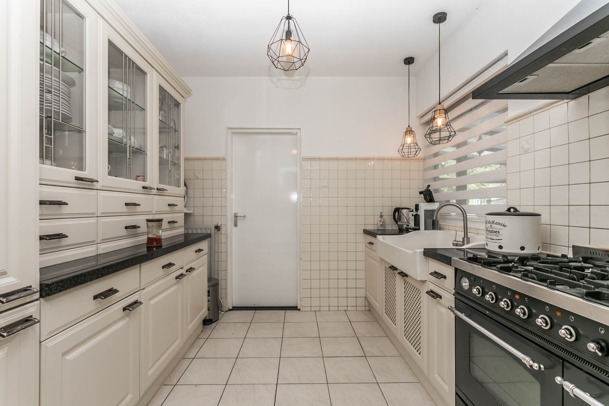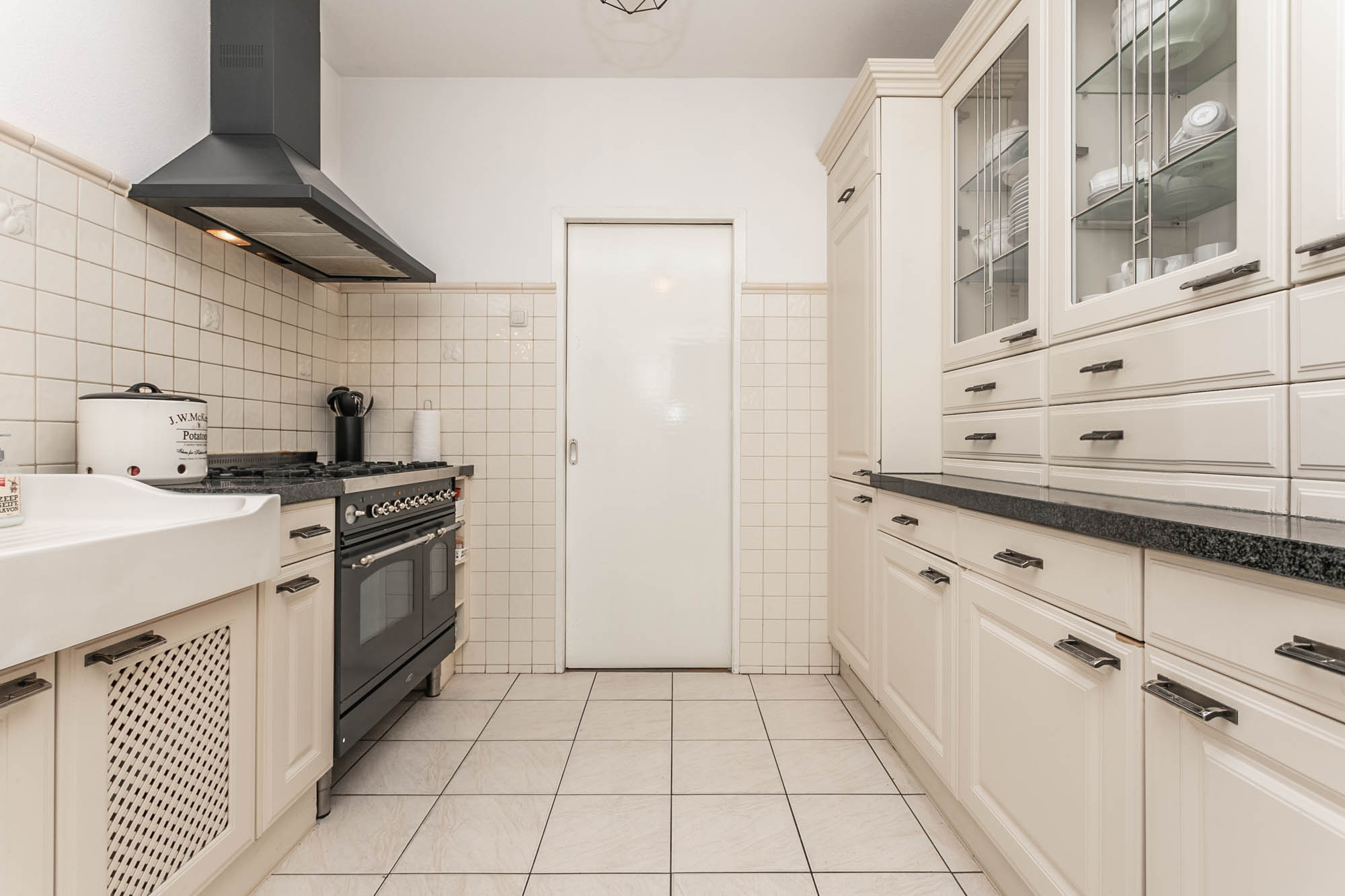 De dichte keuken (2.95*2.74m) is voorzien van een inbouwkeuken met een granieten werkblad en moderne apparatuur (6 pits gascomfort met heteluchtoven, vaatwasser, schouwmodel afzuigkap, koelkast).