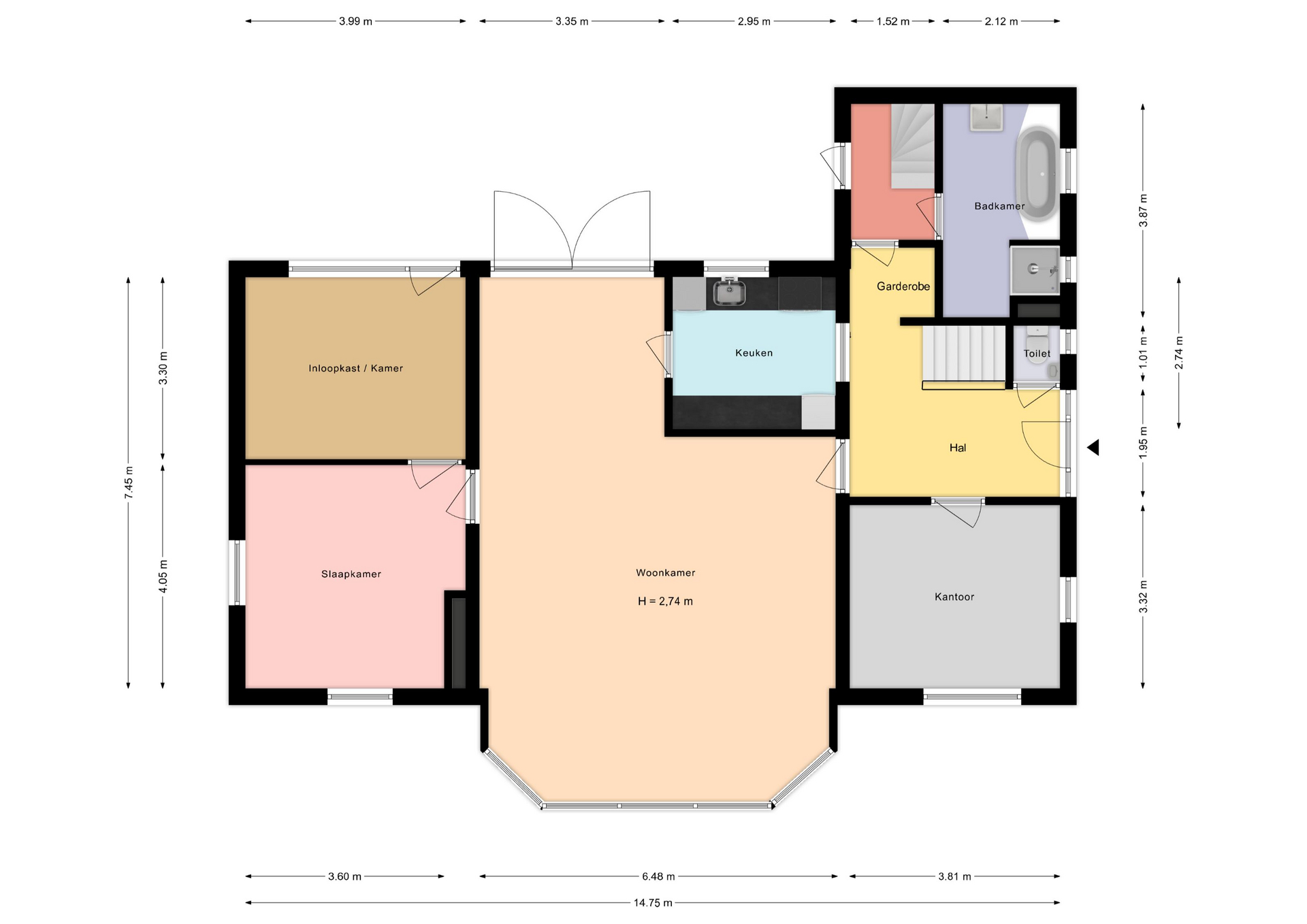 Op deze verdieping is ook nog een ruime kantoorruimte/home office (3.32*3.61m) die ook geschikt is als slaapkamer, gerealiseerd.