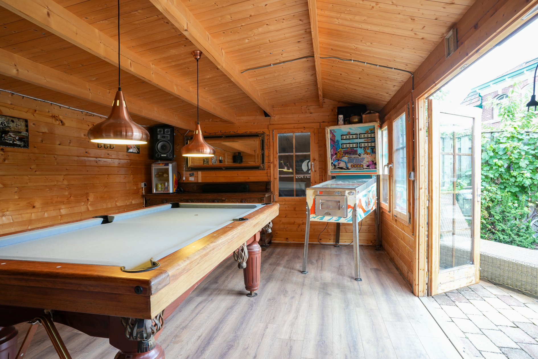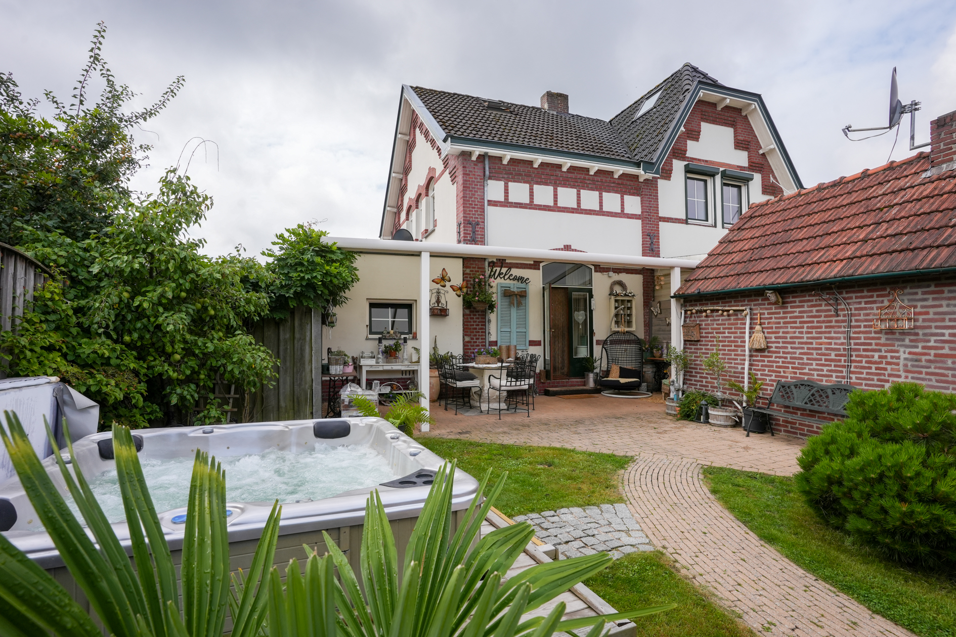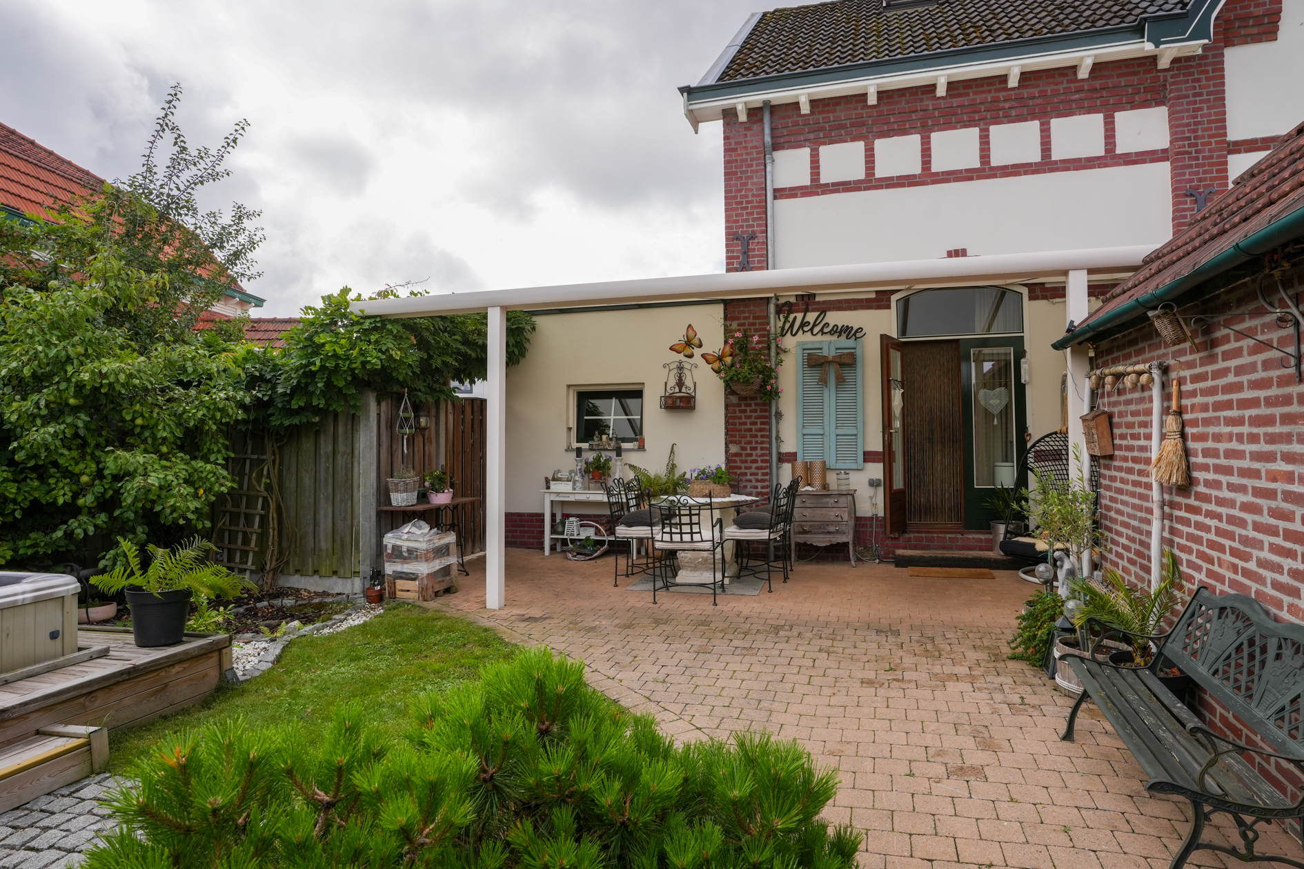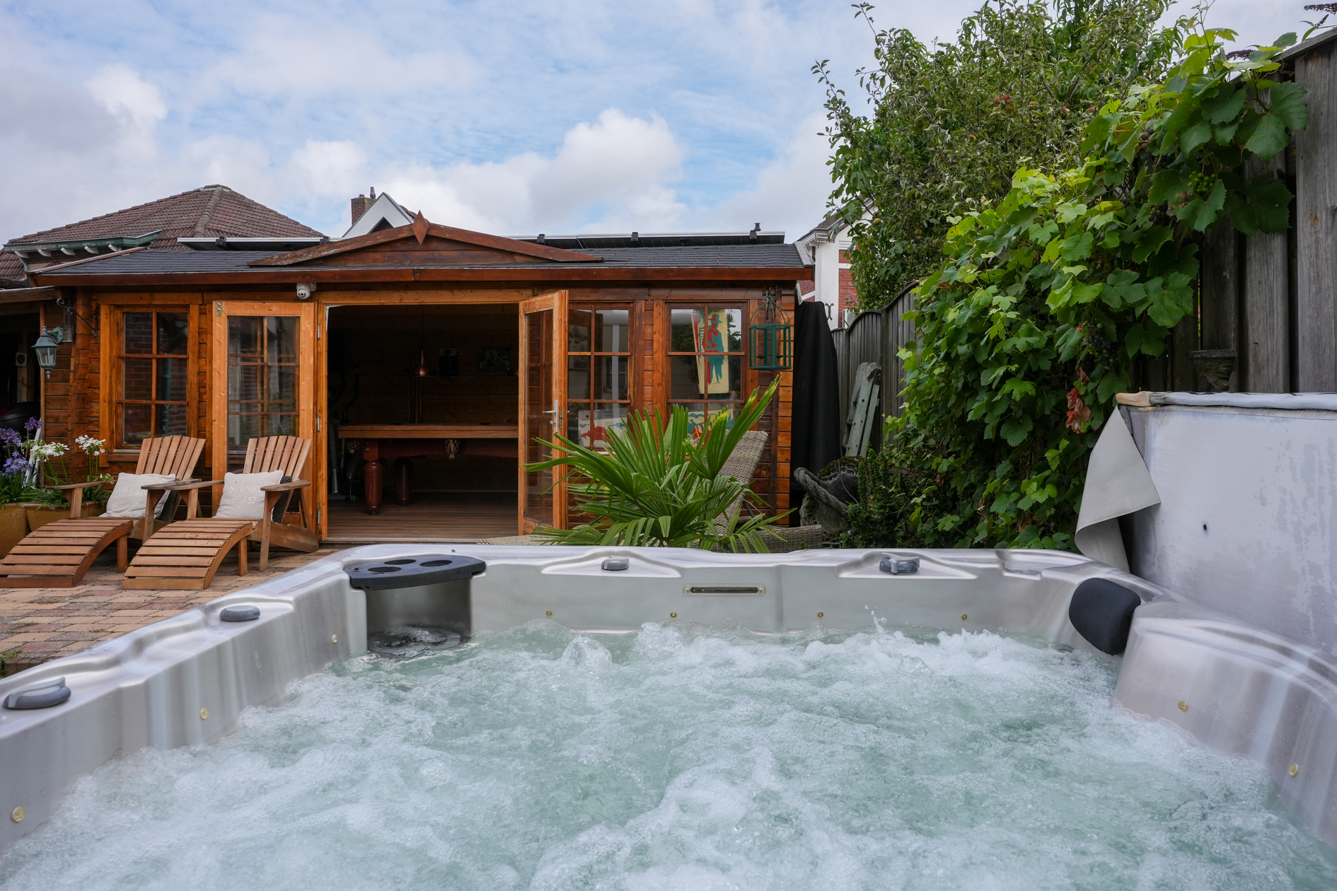 Aan de achtergevel (uitgang keuken) is een overkapping aangebracht. In de tuin bevindt zich een jacuzzi (ter overname) en het tuinhuis is omgetoverd tot een mancave. Ruime berging en fietsenstalling.