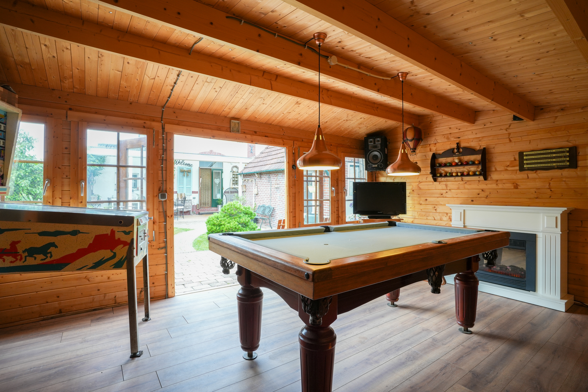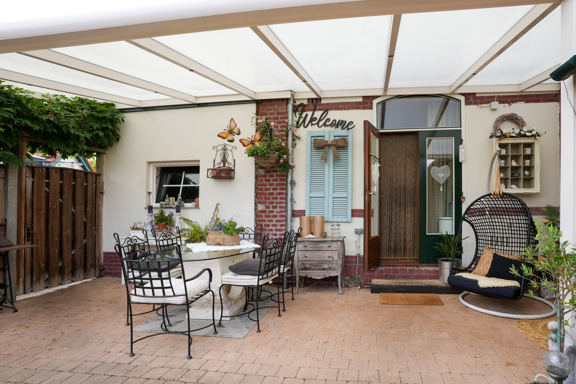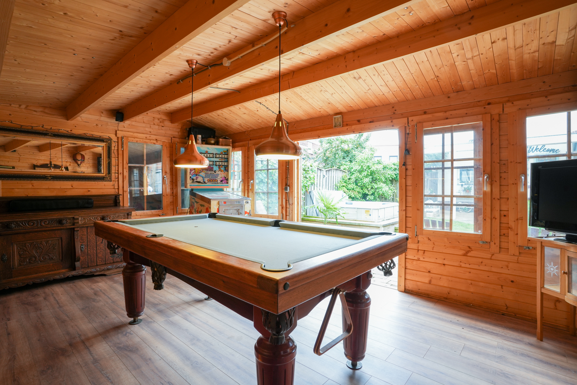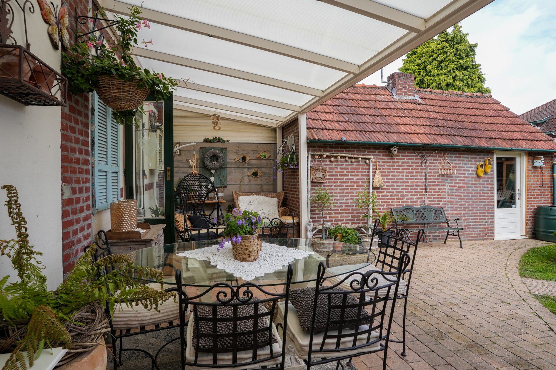 Aan de achtergevel (uitgang keuken) is een overkapping aangebracht. In de tuin bevindt zich een jacuzzi (ter overname) en het tuinhuis is omgetoverd tot een mancave. Ruime berging en fietsenstalling.