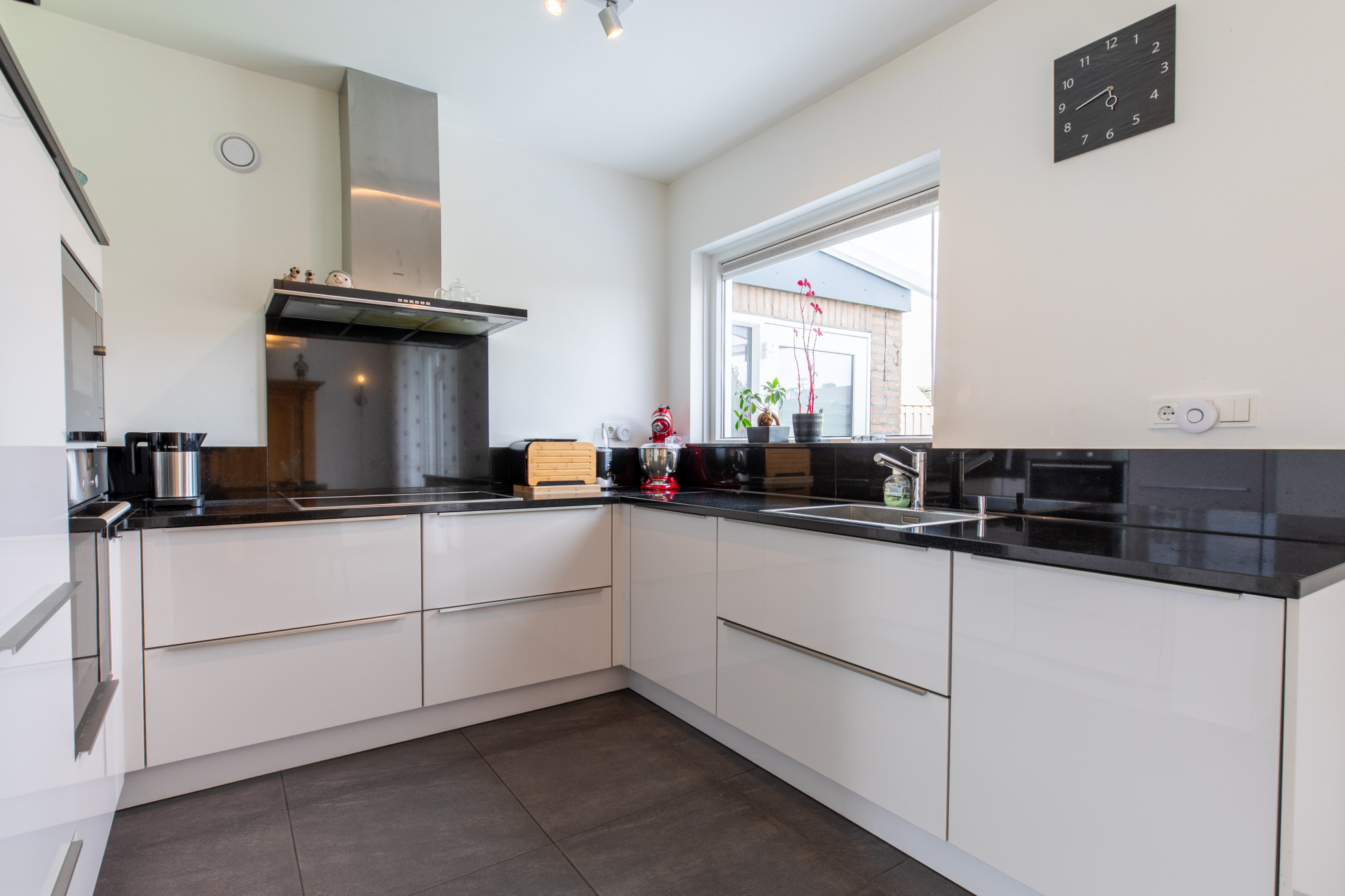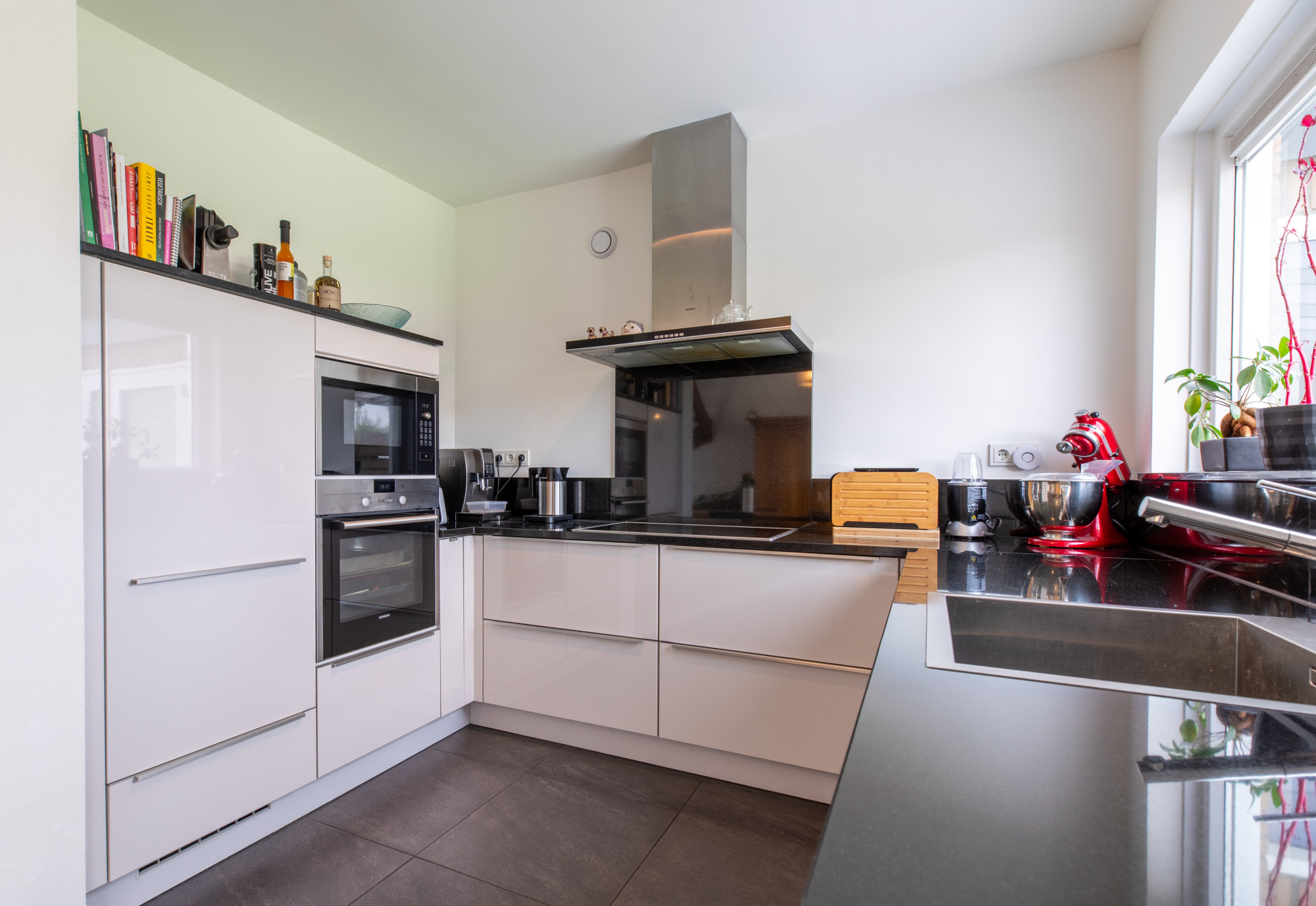 Half open keuken (2.91 x 2.28 m) met keurige keukeninrichting met graniet werkblad en alle apparatuur te weten: inductie kookplaat, afzuigkap, oven, magnetron, koelkast en vaatwasser.