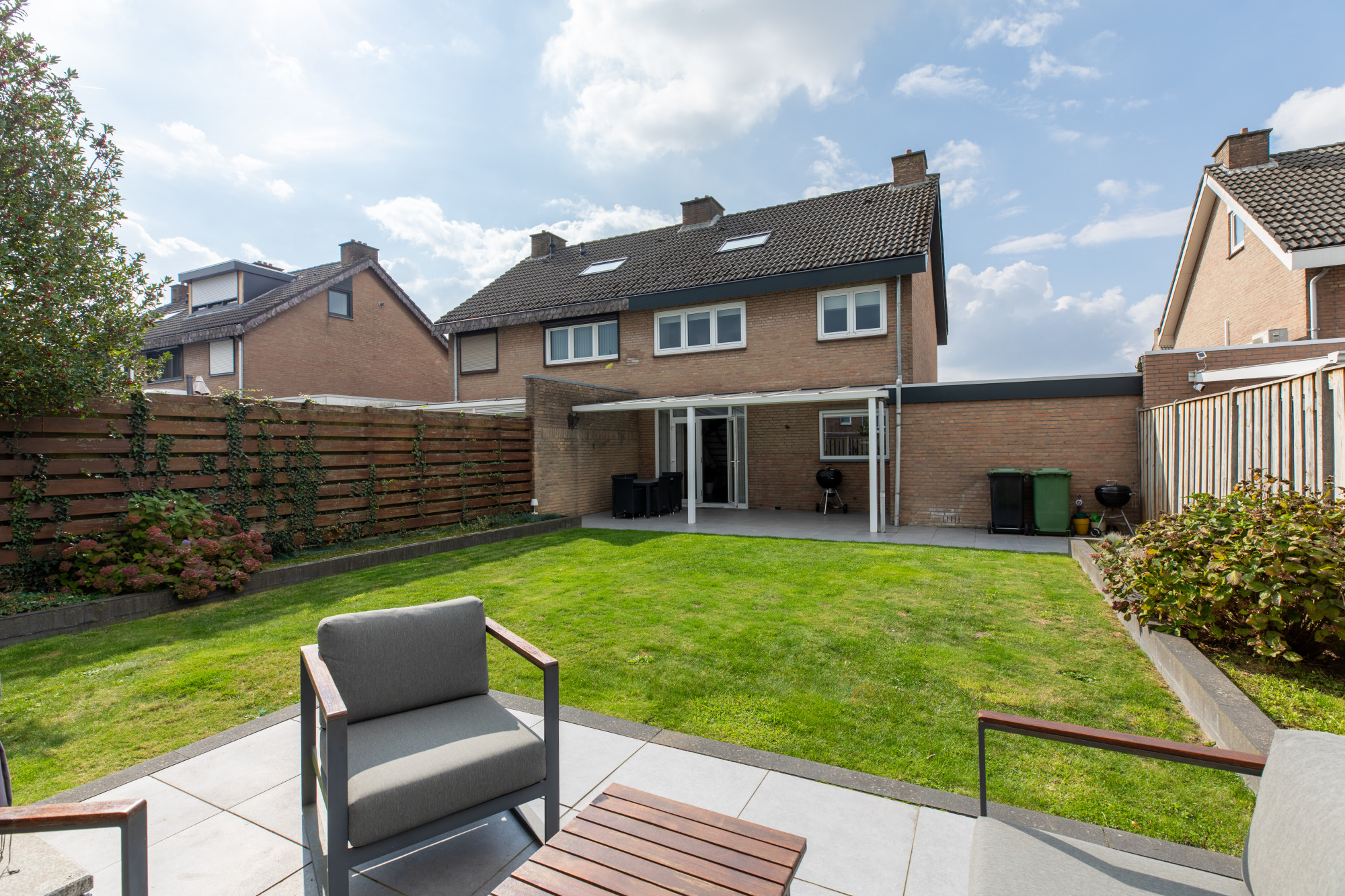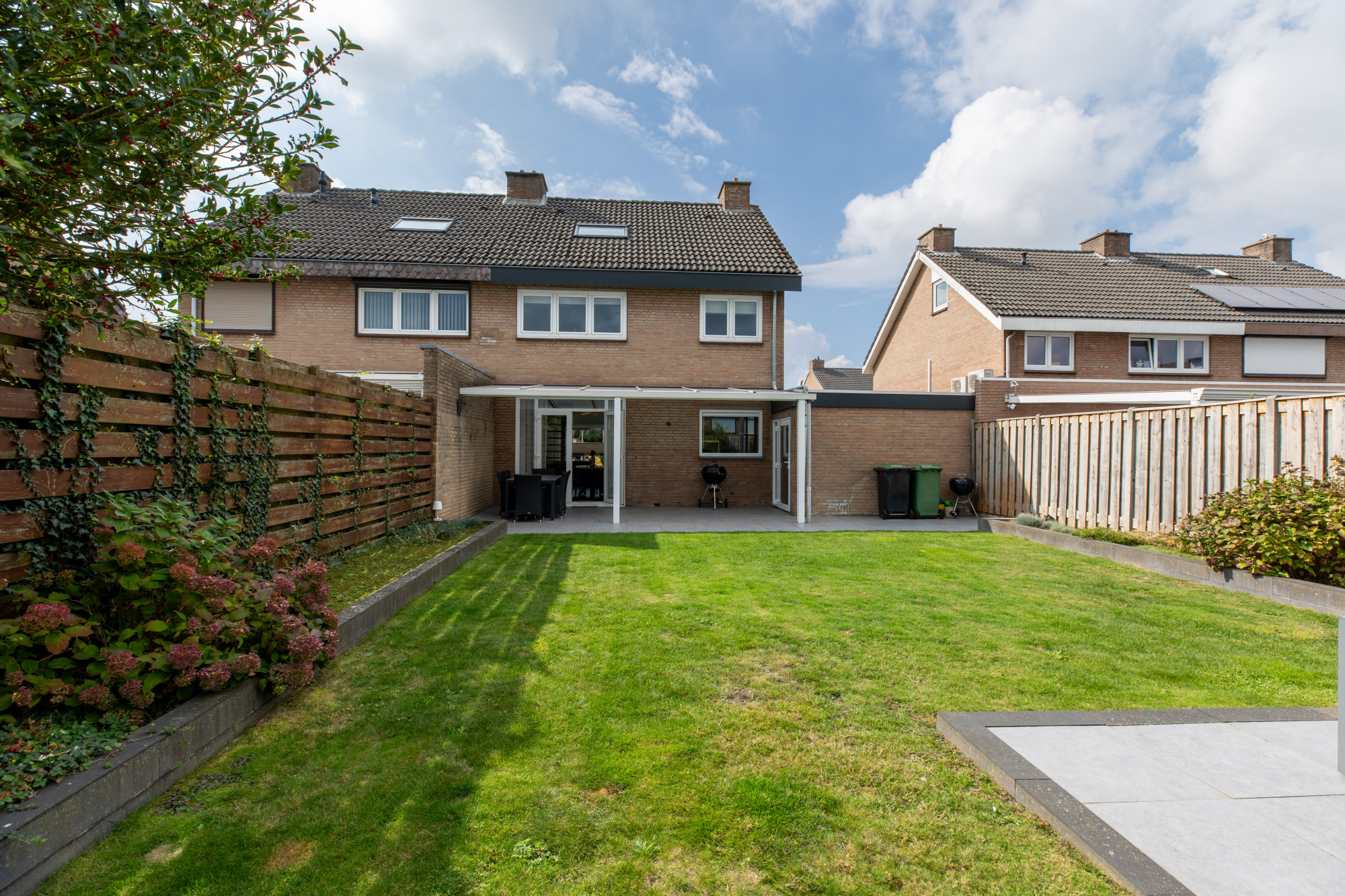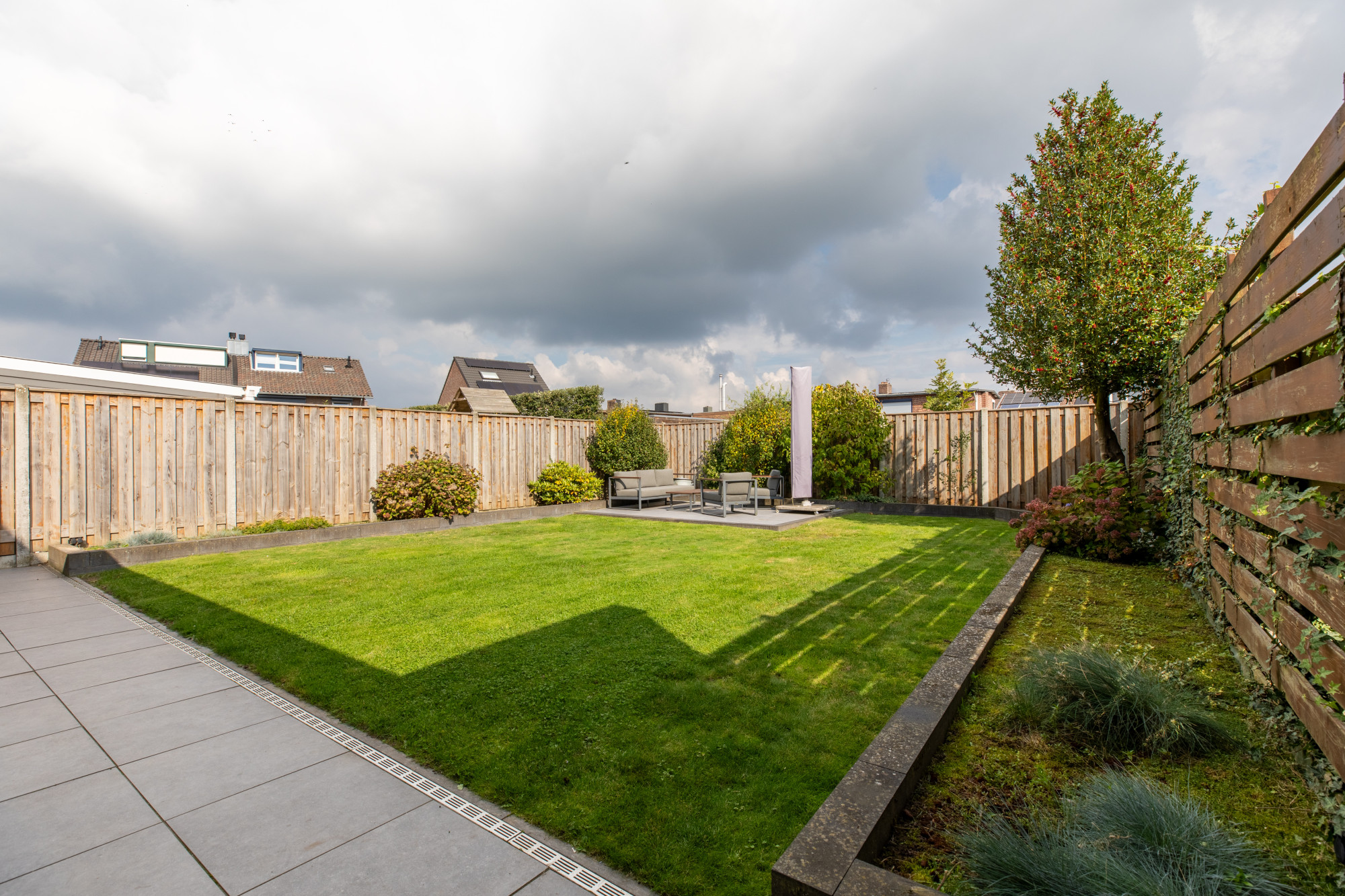 Riante achtertuin met terras, gazon, aanplanting en goede privacy.