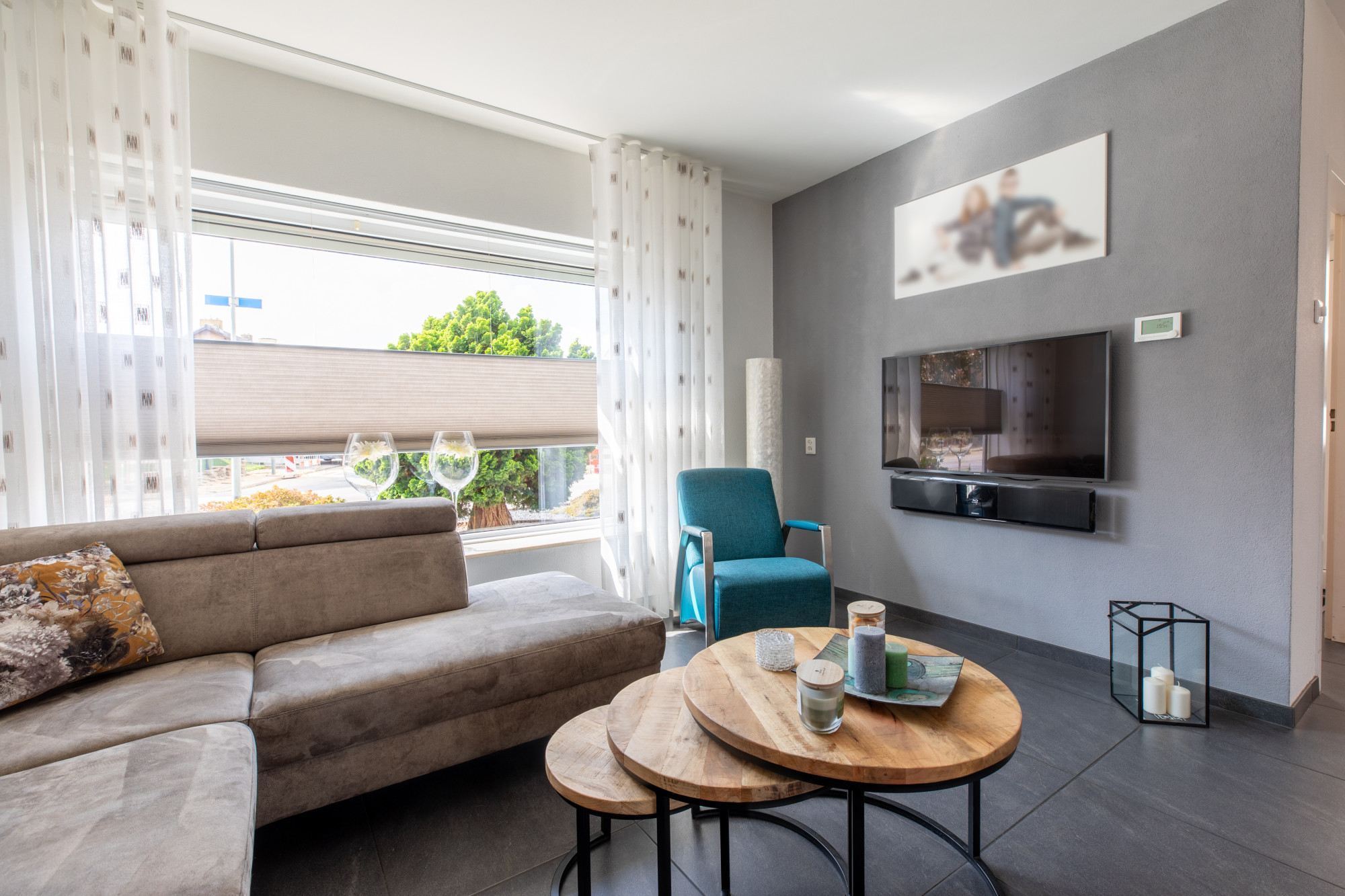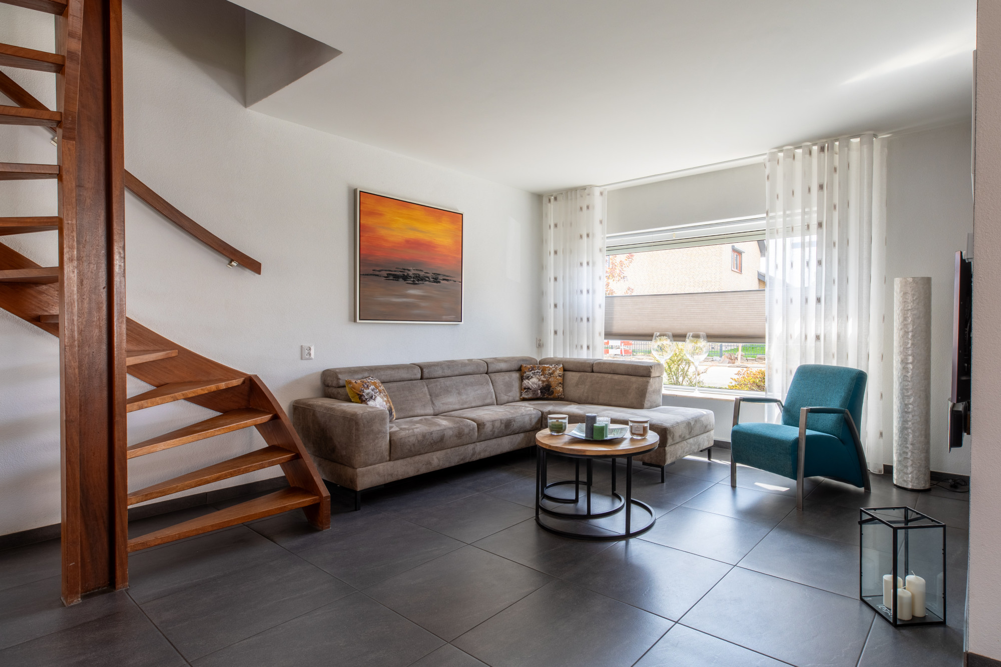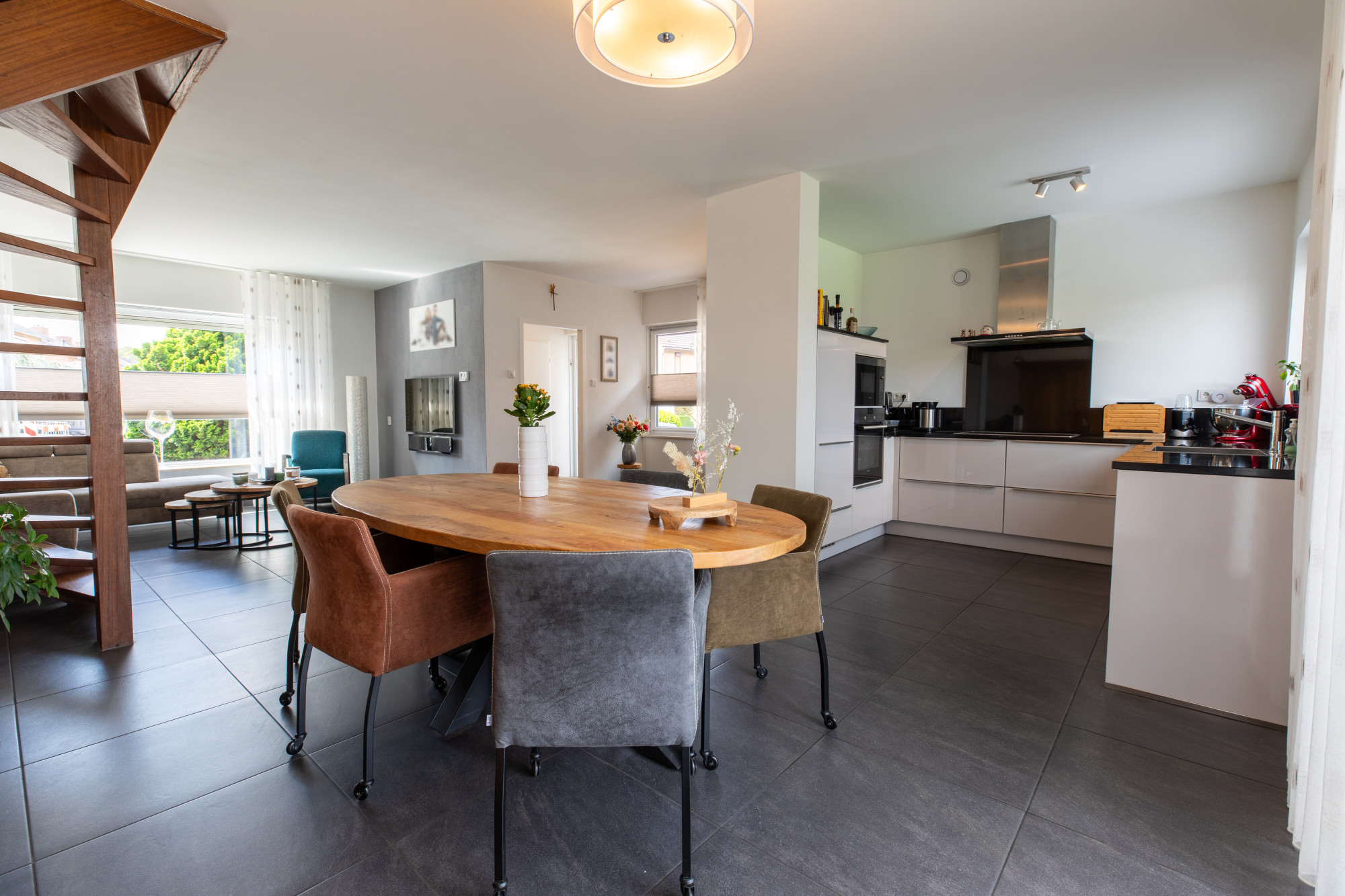 Lichte woonkamer (8.42 x 6.24/3.94 m) voorzien van een mooie tegelvloer en openslaande deuren naar het terras.
