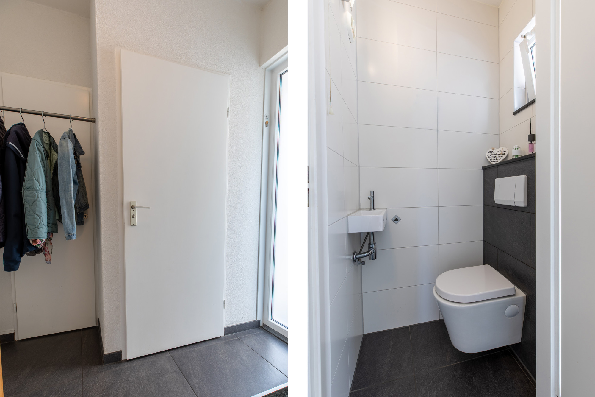 Geheel betegelde modern afgewerkte toiletruimte met wandcloset en fonteintje.
