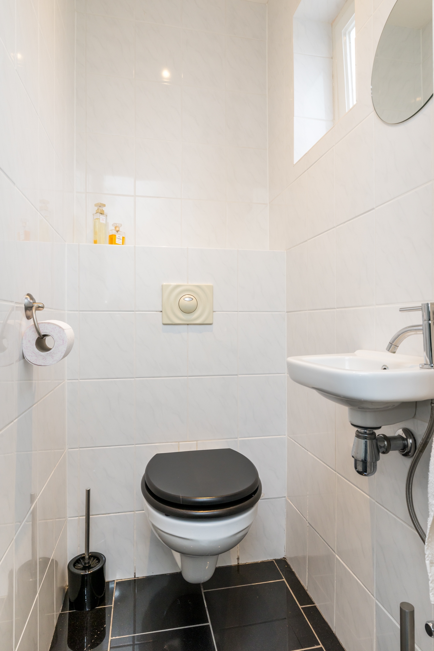 Via oprit naar entree. Hal met plavuizenvloer en geheel betegelde toiletruimte met hangcloset en fonteintje.