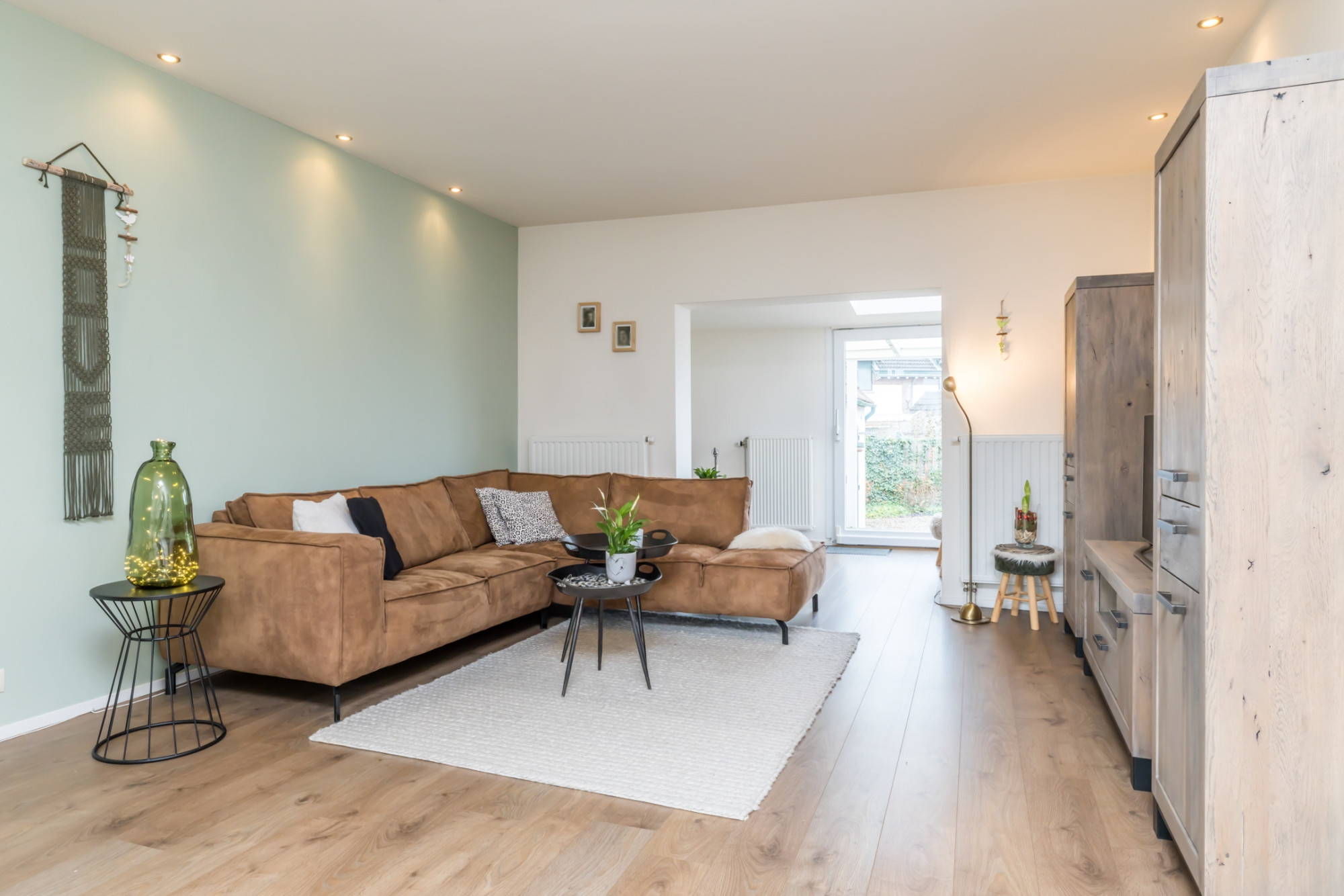 Woonkamer met tuinkamer voorzien van schuifpui met rolhor. (Raam woonkamer en schuifpui/raampartij in de tuinkamer is van kunststof en voorzien van HR++ glas) en geheel voorzien van laminaatvloer.
