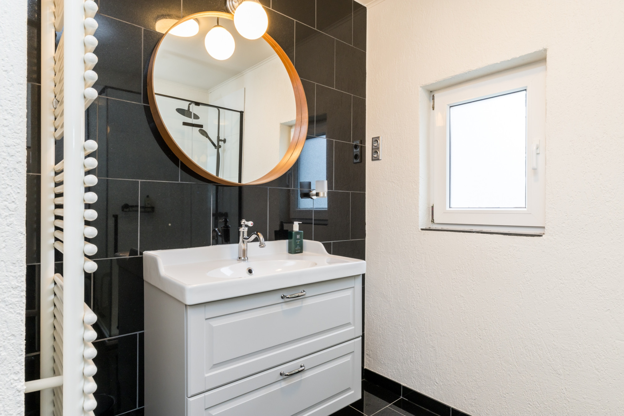 Keuken met keukeninstallatie in hoekopstelling o.a. voorzien van keramische kookplaat, afzuigkap, magnetron, oven, koelkast, diepvries, vaatwasser, apothekerskast en laminaatvloer. Badkamer met plavuizenvloer, doucheruimte (nieuw 2021), spiegel, vaste wastafel met badmeubel en design radiator.