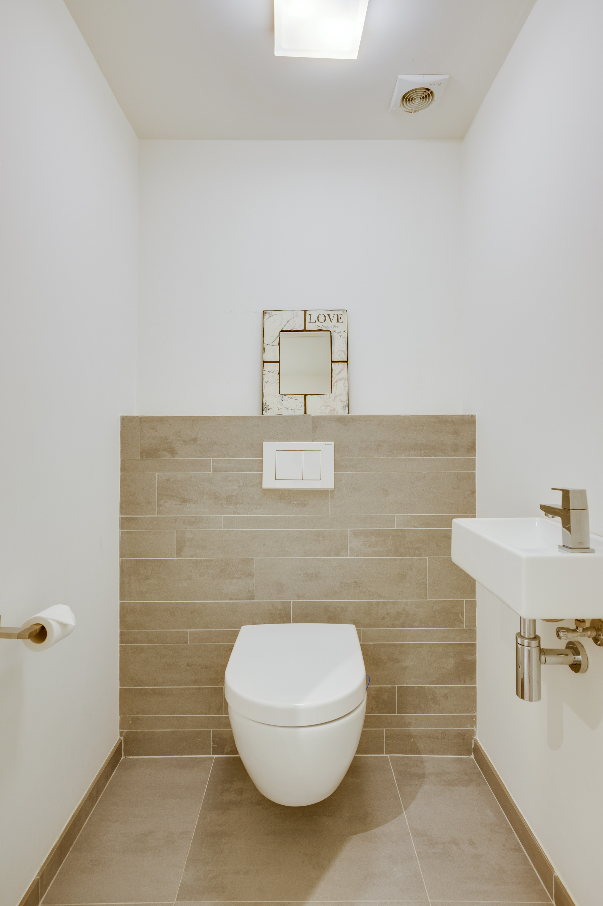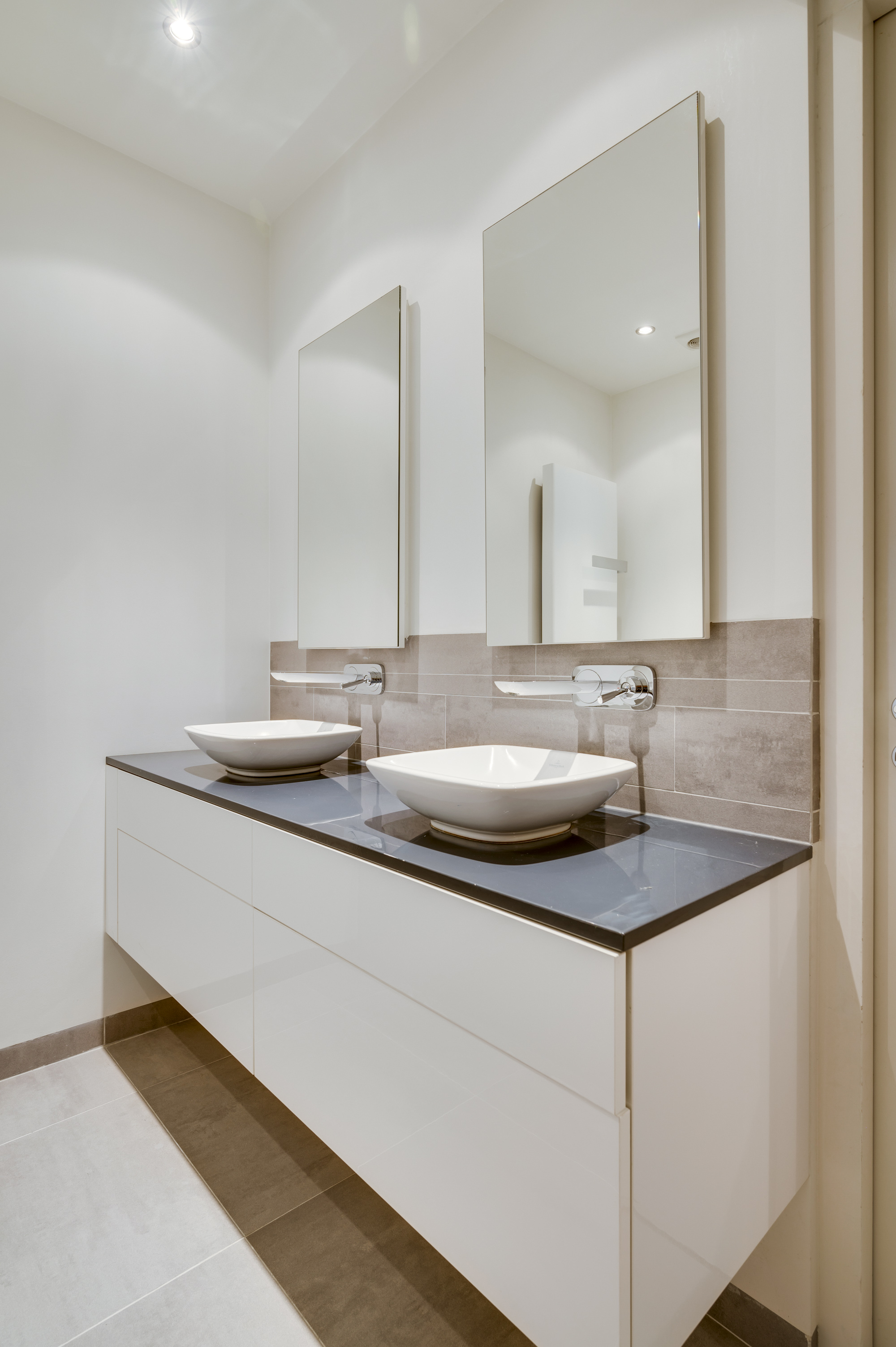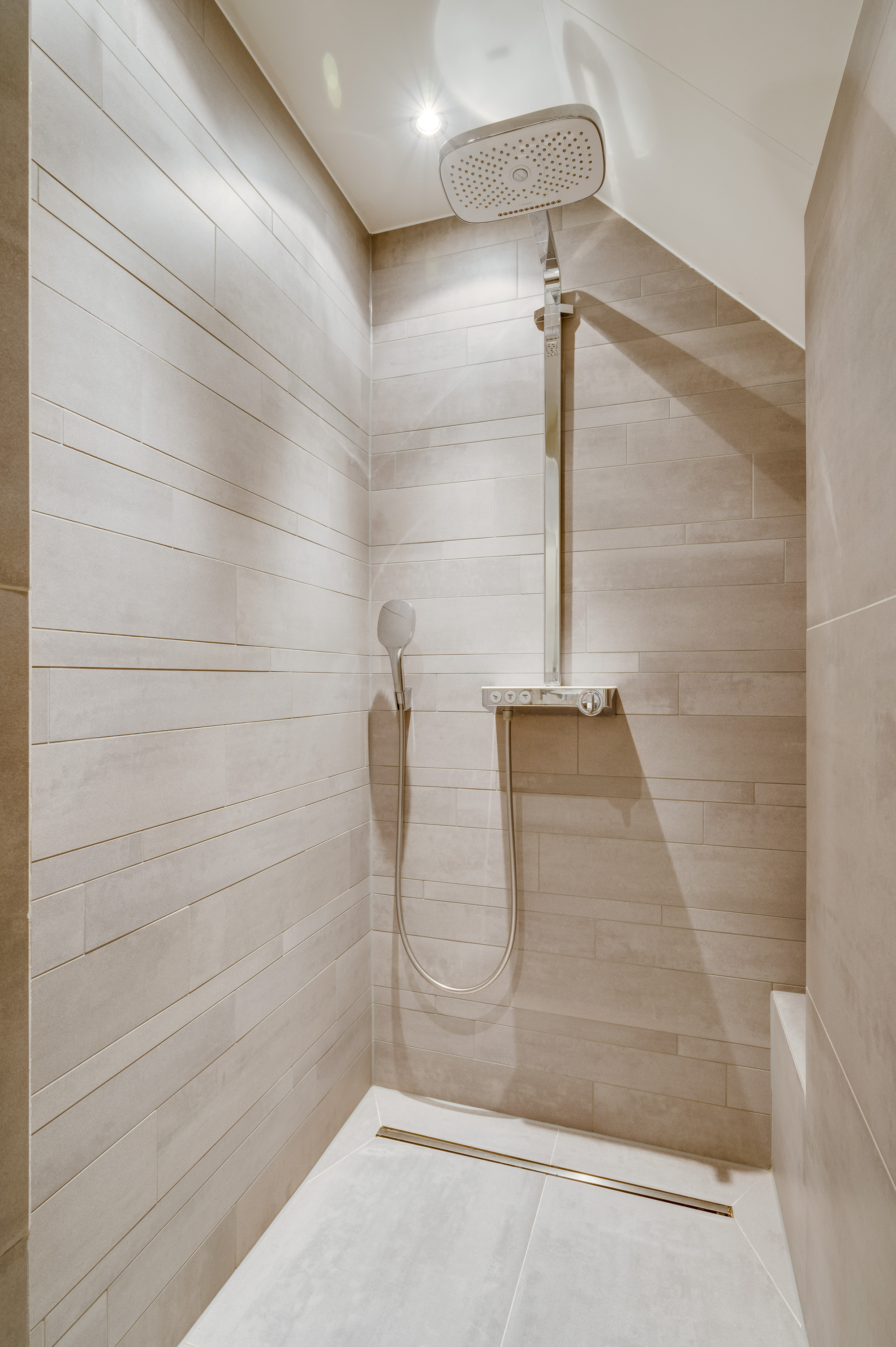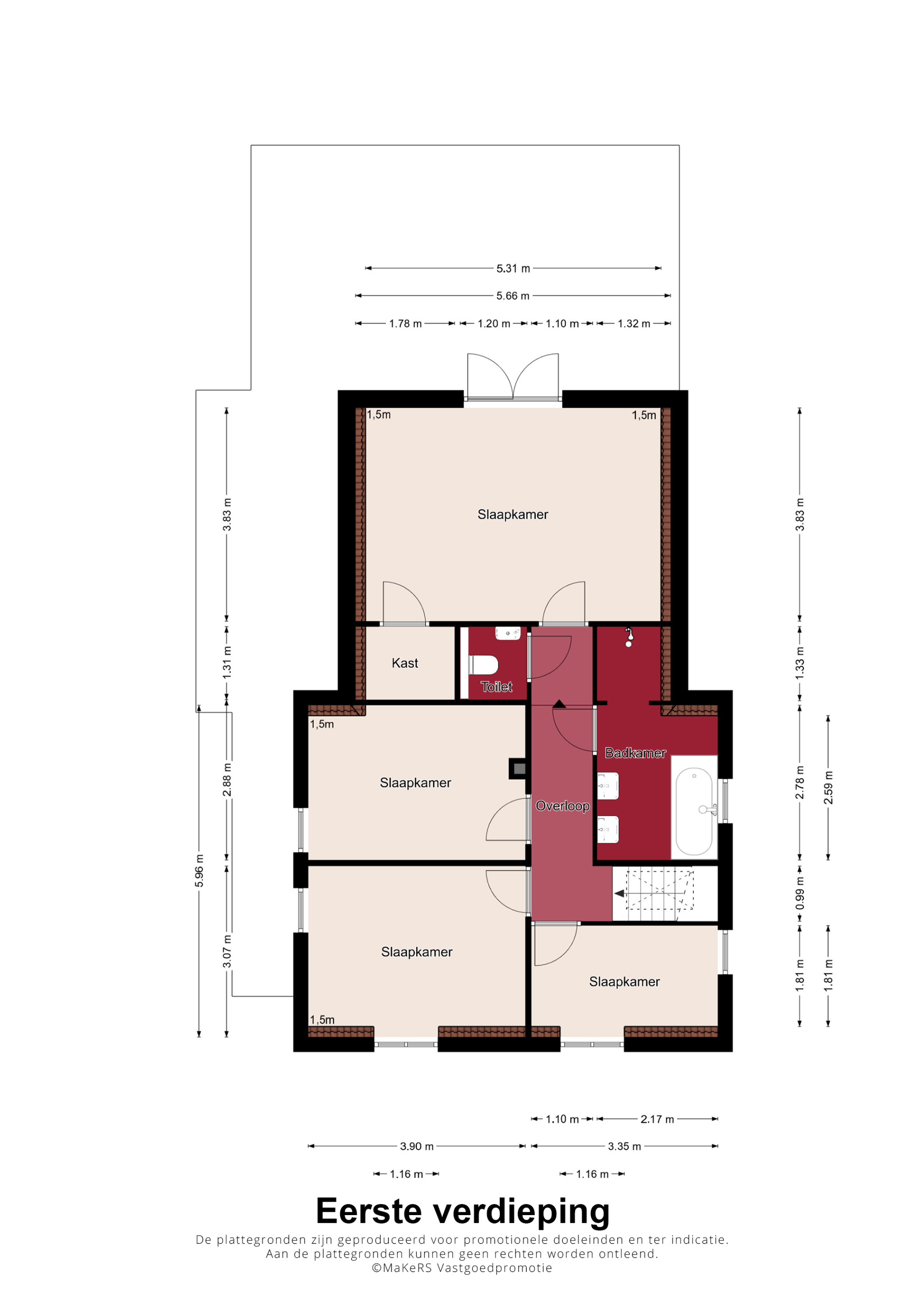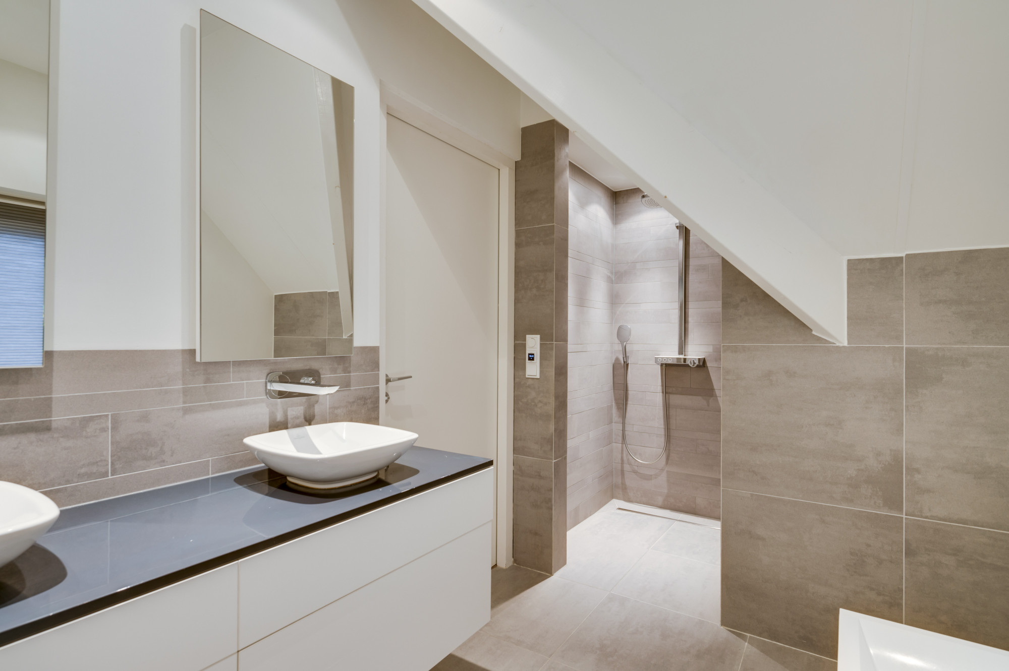 Op de eerste verdieping biedt de overloop toegang tot nog vier slaapkamers, een moderne badkamer en een separate toiletruimte. De badkamer is voorzien van vloerverwarming, een ligbad, inloopdouche en dubbele wastafel met meubel. Een van de slaapkamers beschikt over een praktische muurkast.