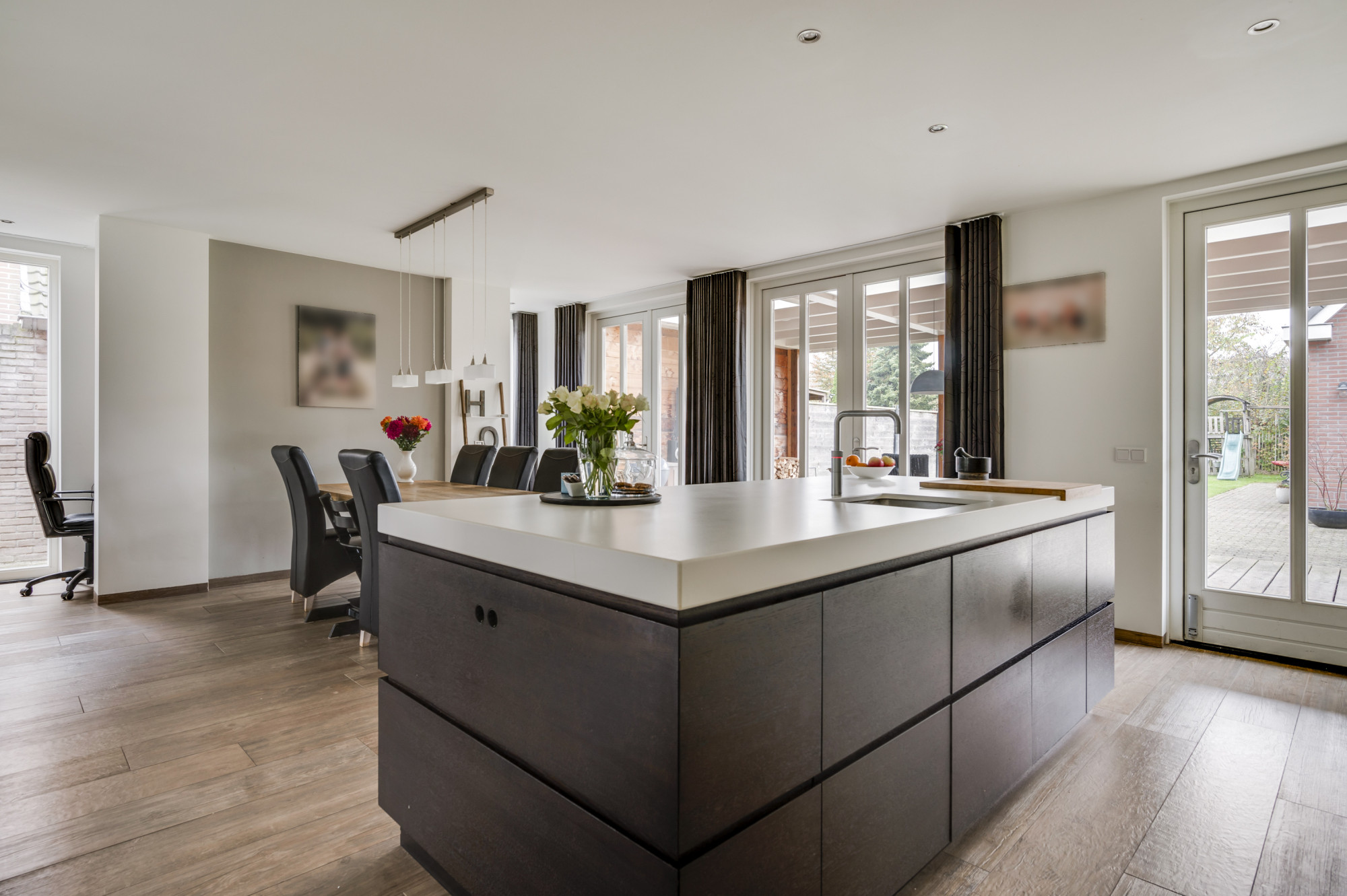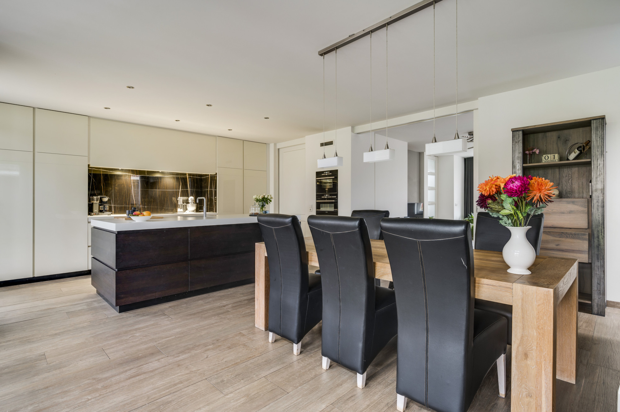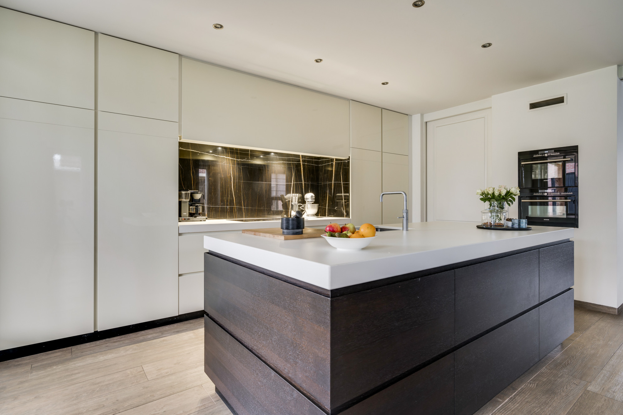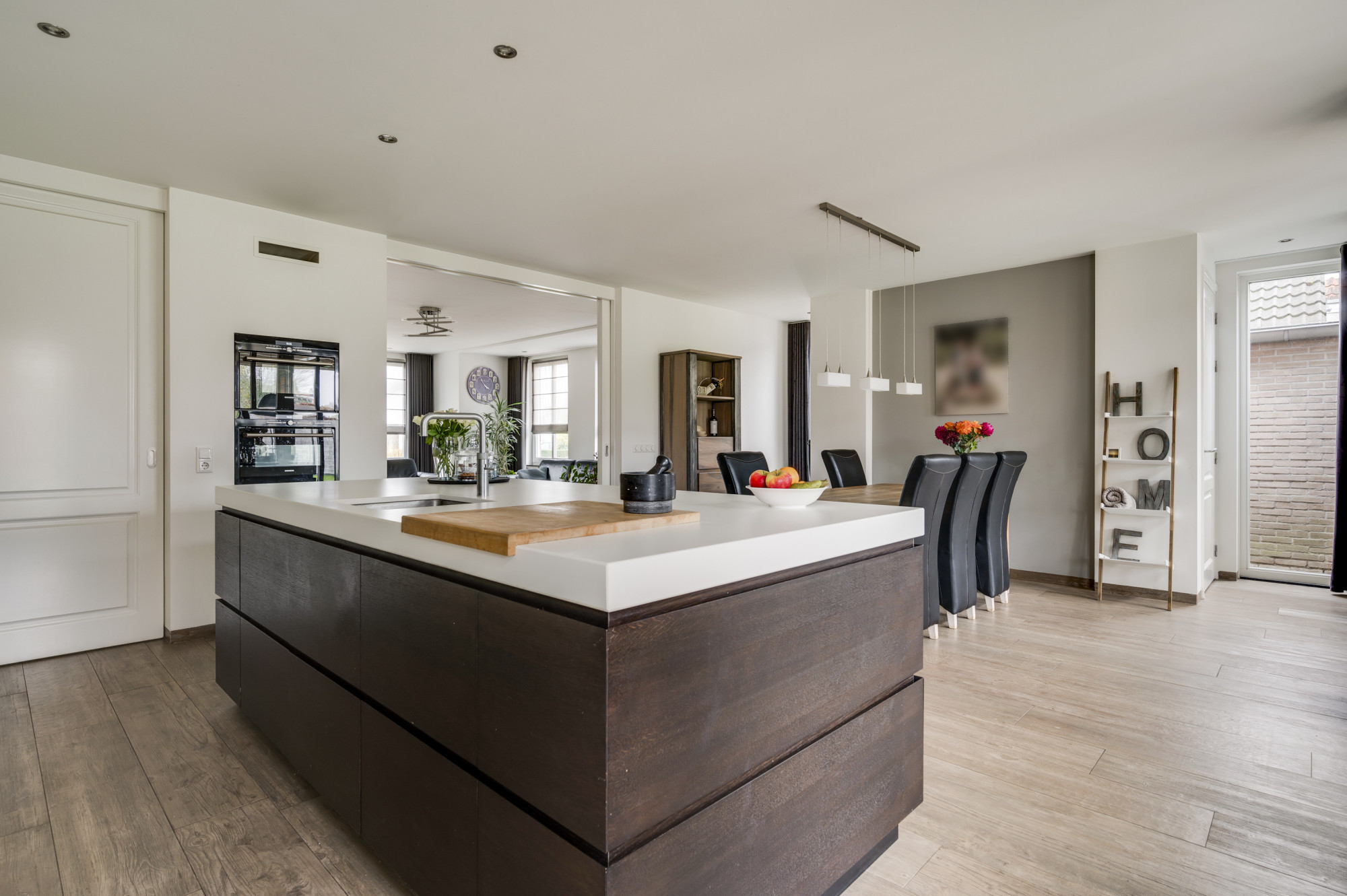 De hal geeft toegang tot de meterkast, trapopgang, een moderne toiletruimte met zwevend toilet en fonteintje, en leidt naar zowel de multifunctionele kamer als de sfeervolle woonkamer. Deze royale woonkamer is licht en beschikt over een schouw met houtkachel. Vanuit de woonkamer is middels en-suite deuren de royale woonkeuken te bereiken met uitstekende lichtinval en tuincontact door dubbele openslaande tuindeuren en een loopdeur. De keuken biedt een luxe combinatie met een composiet werkblad en achter- en zijwanden van het kookgedeelte van Tunesisch marmer. Tevens is er een riant eiland en biedt de keuken hoogwaardige inbouwapparatuur, waaronder een inductiekookplaat, afzuigkap, combi-oven, koelkast, vriezer, combi-stoomoven, Quooker kraan en een vaatwasser. De keuken biedt een leuk studiehoekje en is er ook nog een multifunctionele extra ruimte te bereiken (nu in gebruik als studeerkamer, maar ook als bijkeuken of gelijkvloerse extra kamer te gebruiken). De gehele begane grond is voorzien van een fraaie tegelvloer met vloerverwarming.