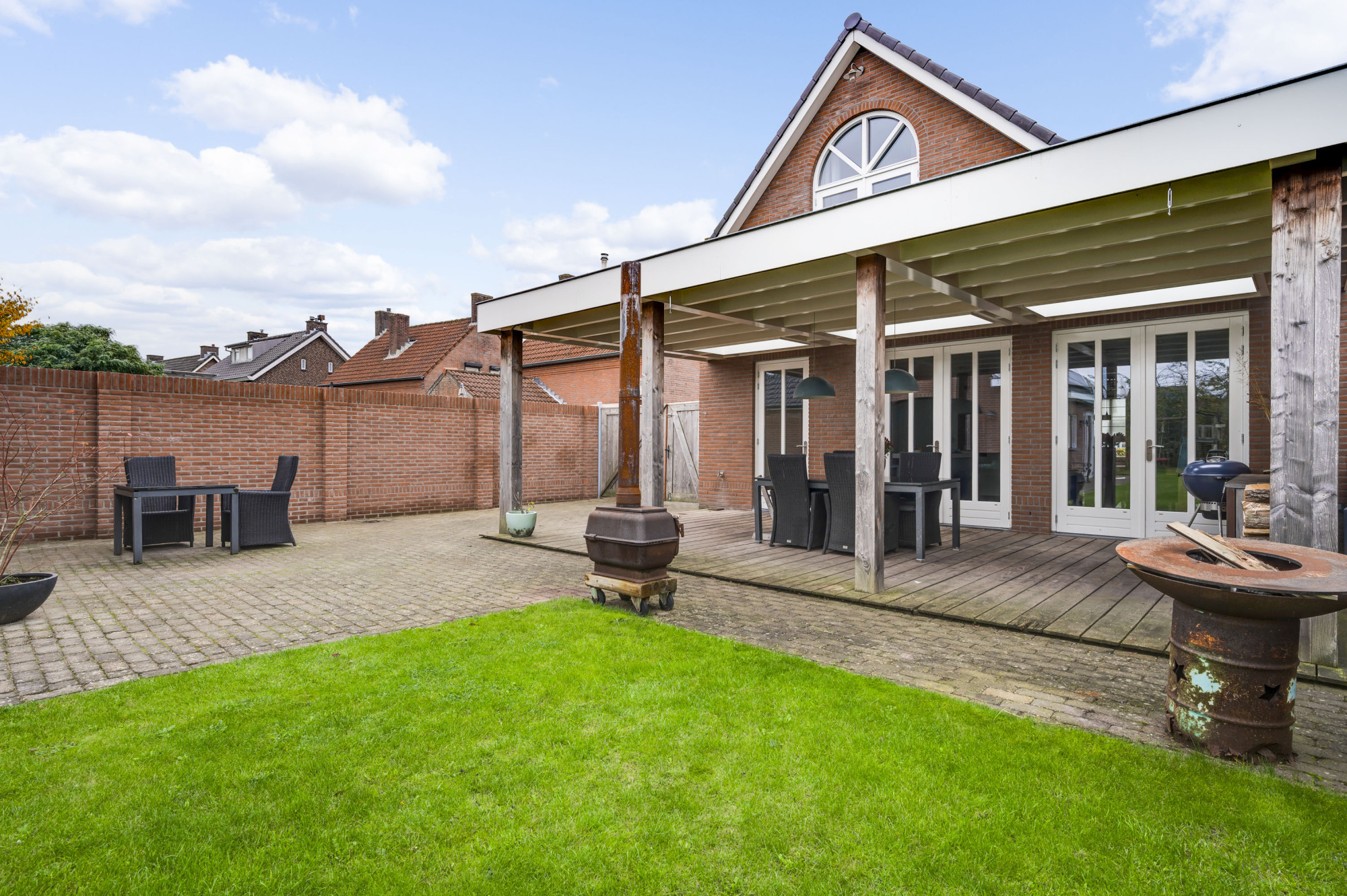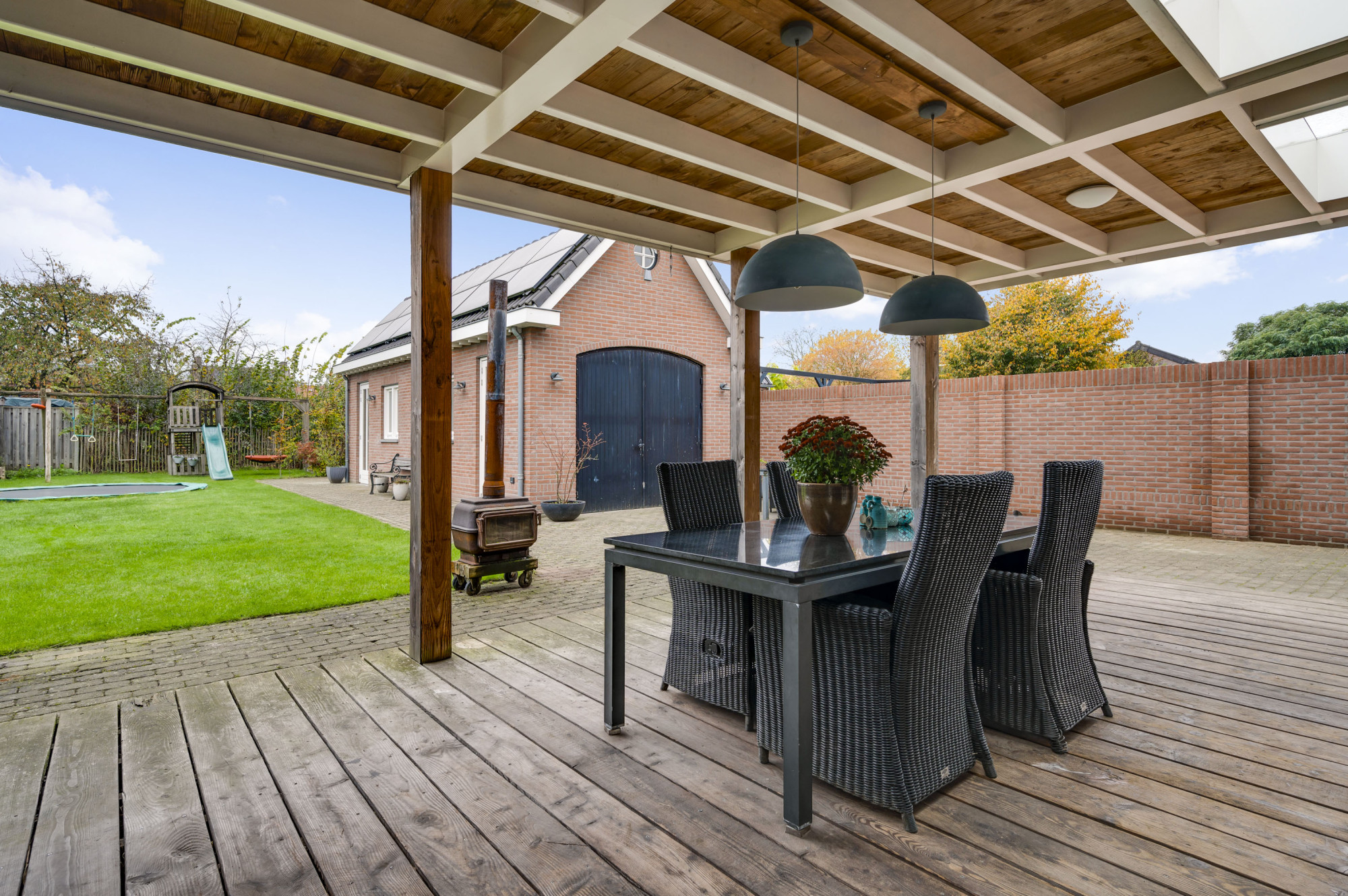 De voortuin heeft aan beide kanten een oprit. De vrije achterom leidt naar de diepe en zonnige achtertuin. Hier bevindt zich de riante vrijstaande garage, compleet met elektra, water, verwarming en een handige vliering. Onder de royale terrasoverkapping met lichtkoepels kun je het hele jaar door van de tuin genieten. De achtertuin is bovendien onderhoudsvriendelijk en voorzien van een gazon, bestrating en een grondwaterput.