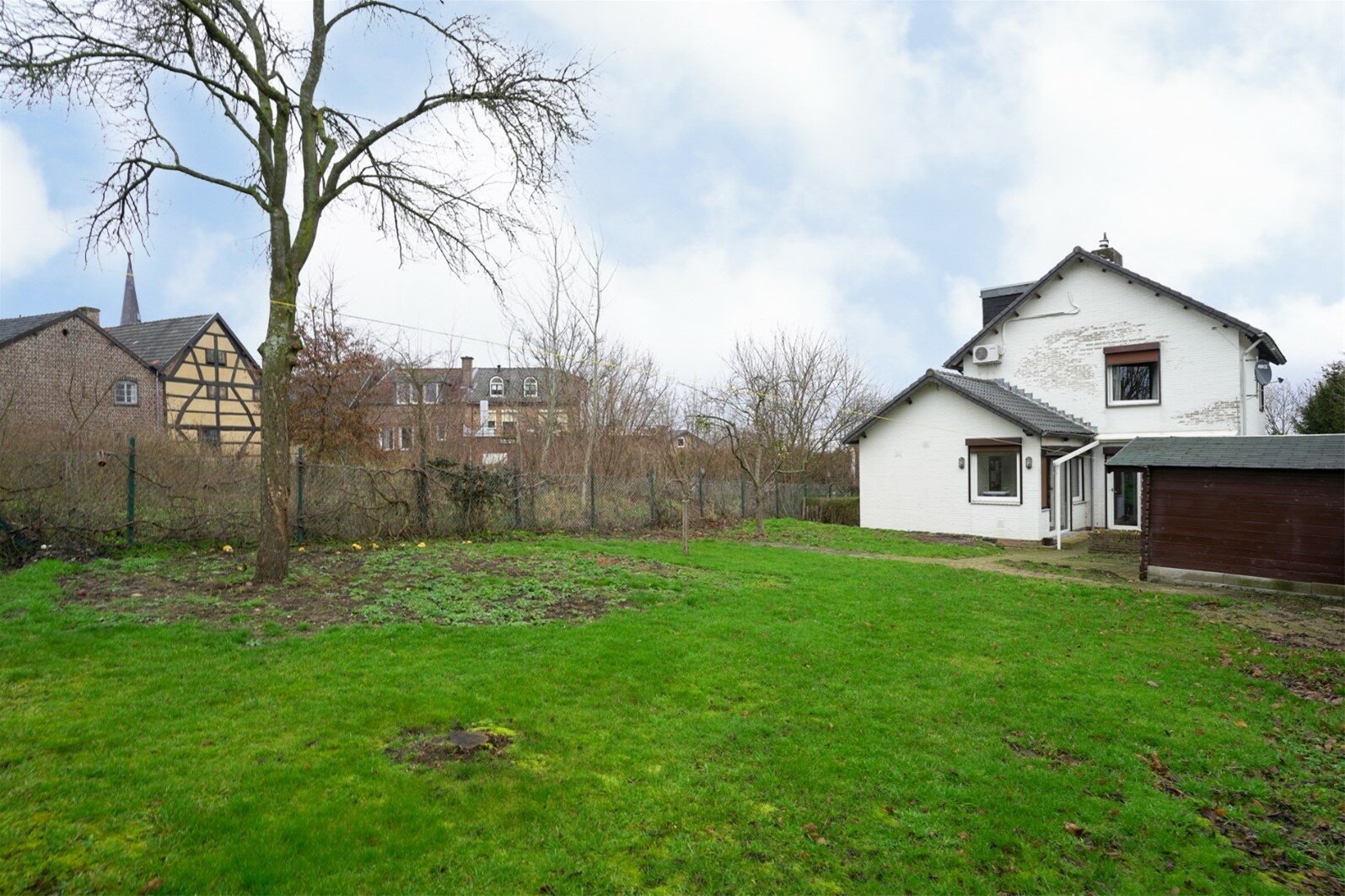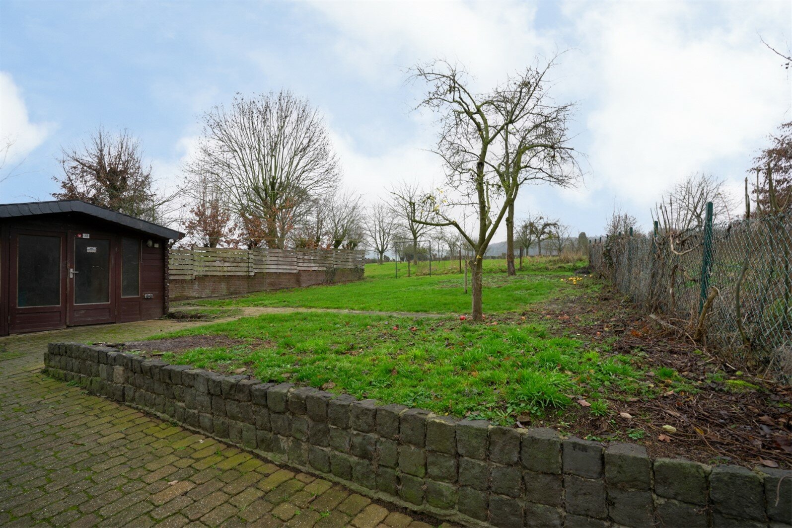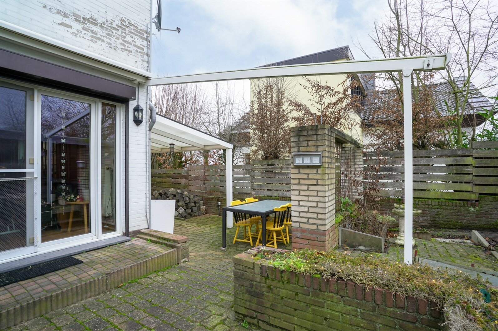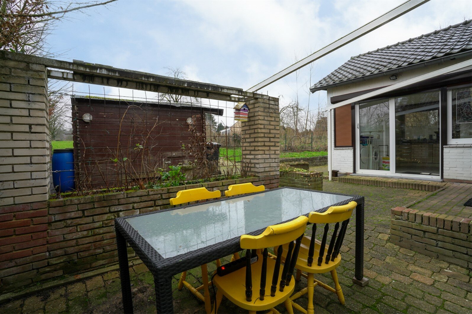 Achtertuin met tuinhuis gelegen op het Zuidwesten. Mooi uitzicht over de weilanden. Aan de linkerzijde van de woning heeft men een overkapping geplaatst.