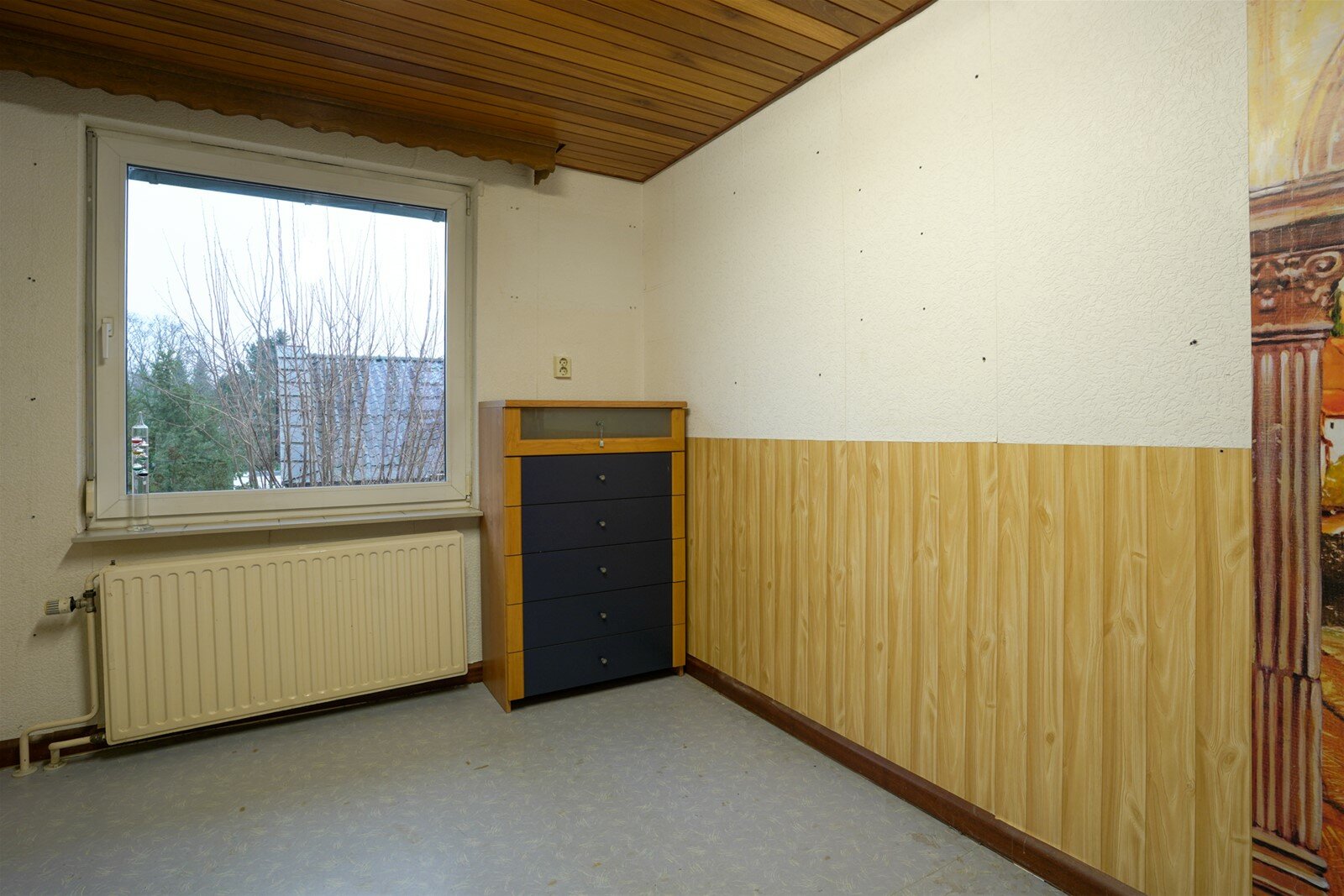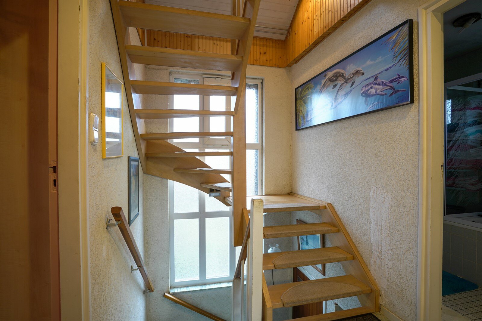 Overloop met toegang naar de badkamer, 3 slaapkamers en de vaste trap naar de tweede verdieping. Slaapkamers met oppervlaktes van 12m²- 11m² en 10m². Alle slaapkamers en de overloop zijn voorzien van een linoleumvloer. Eenvoudige gedateerde badkamer(4,5m²) met ligbad, tweede toilet en wastafel.