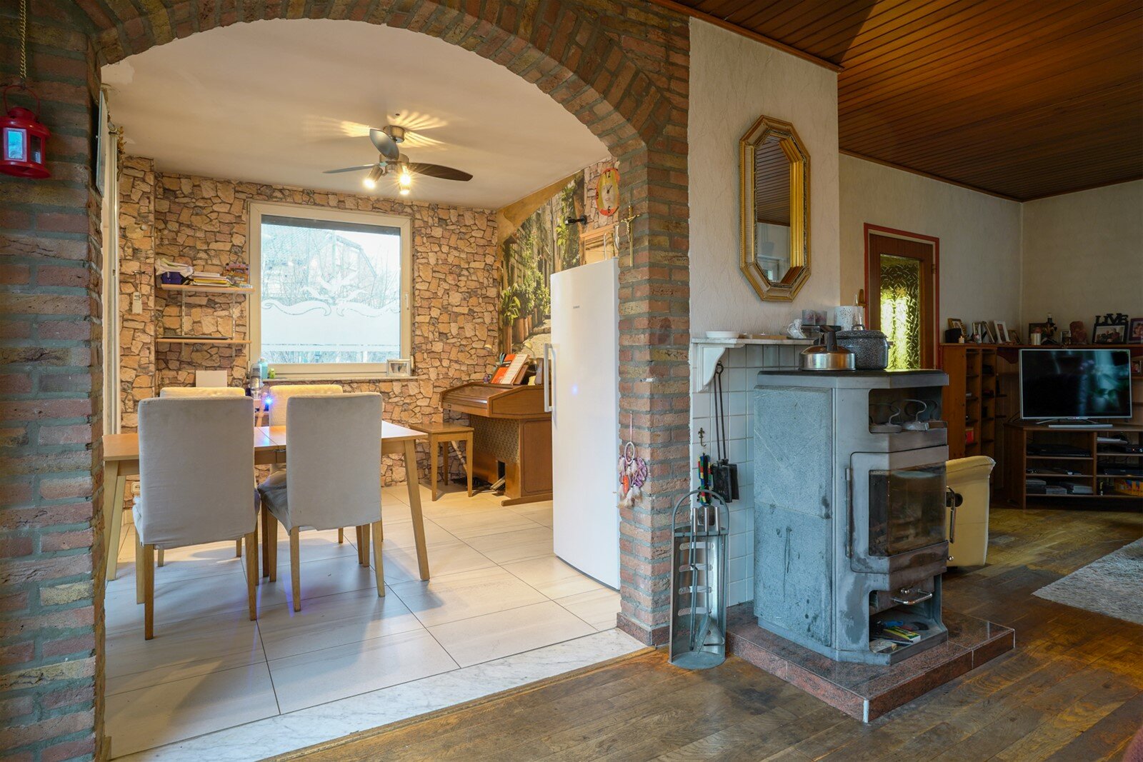 Entree(7,3m²) met toegang naar de woonkamer en een tussenruimte die toegang biedt naar kelder en keuken. Eenvoudig toilet, meterkast(geheel vernieuwd) en trap naar de eerste verdieping. Knusse woonkamer(24m²) met veel tuincontact. De vloer is voorzien van parket en er is een houtkachel aanwezig . Ruime leefkeuken(33m²) door de aanbouw veel extra leefruimte gecreëerd. Nette keuken in hoekopstelling met de volgende apparatuur: inductie kookplaat, combi oven-magnetron, afzuigkap, koelkast en afwasmachine. De keuken is ca. 4 jaar oud. Vanuit de keuken is ook de achtertuin bereikbaar.