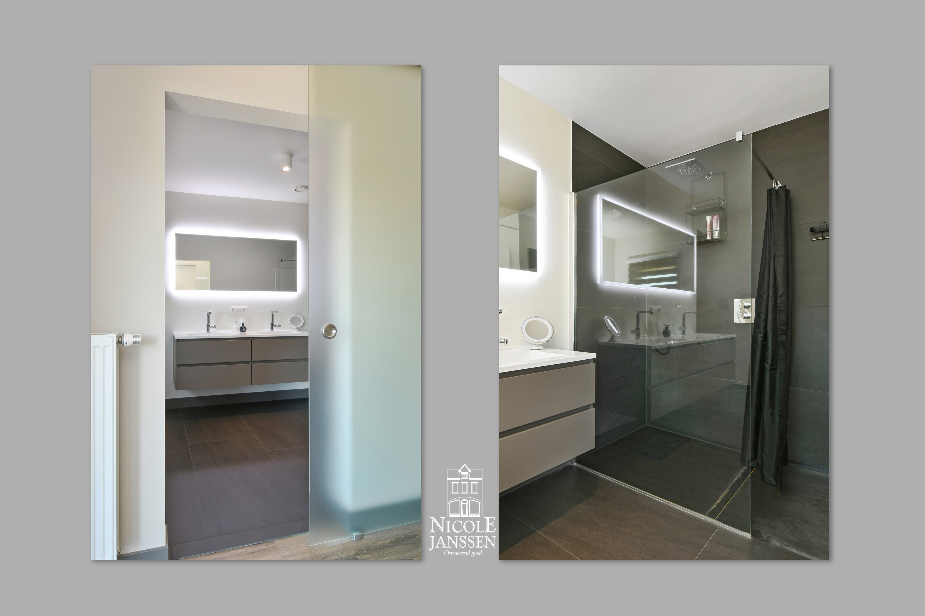 - Badkamer met inloopdouche, toilet en dubbele lavabo in badkamermeubel