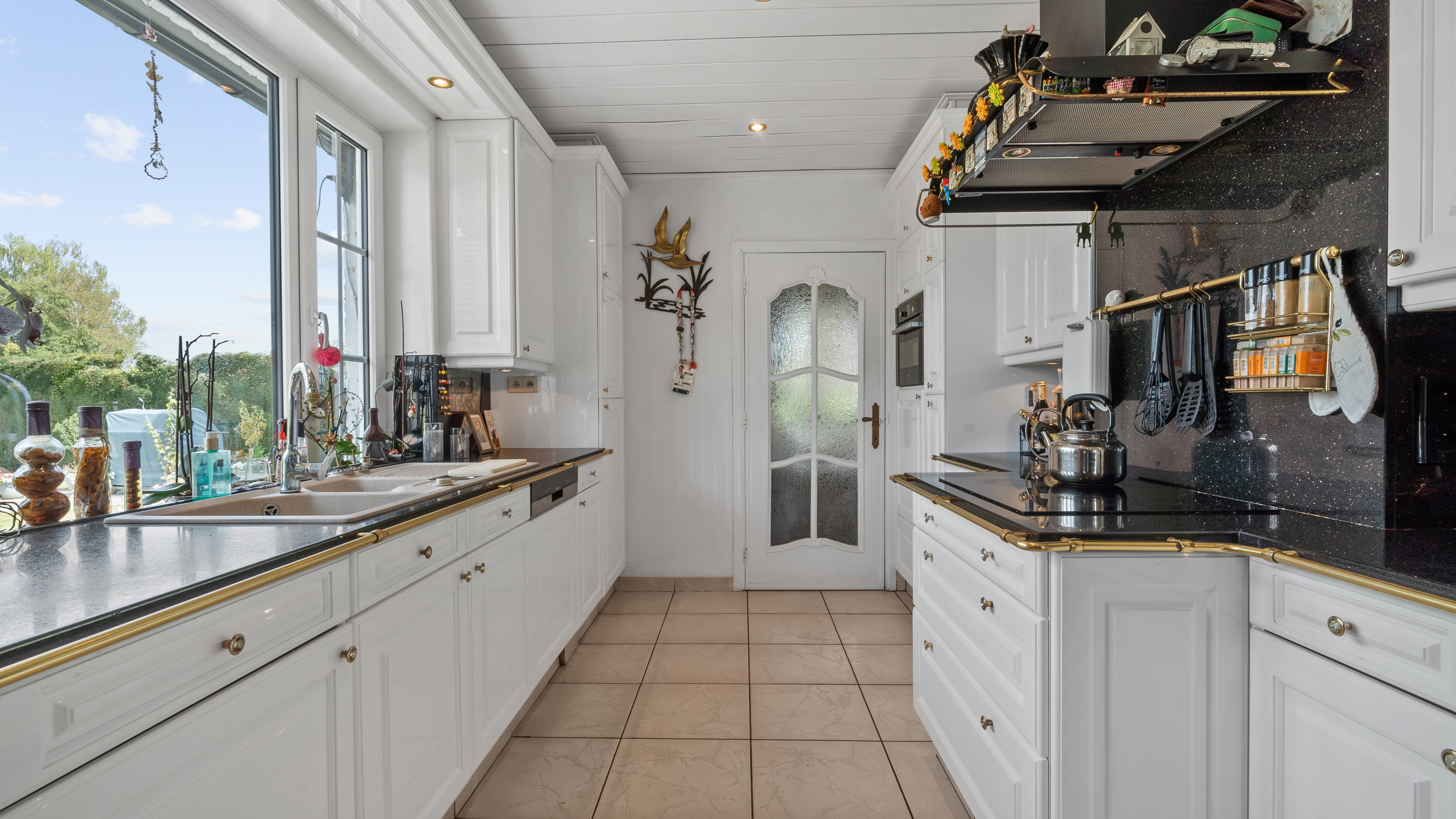 De statige villa verwelkomt u met een ruime inkomhal. Op het gelijkvloers vindt u een grote leefruimte met gashaard, een bureel of slaapkamer, een apart toilet, een eetplaats en een volledig ingerichte keuken met zicht op de tuin.
