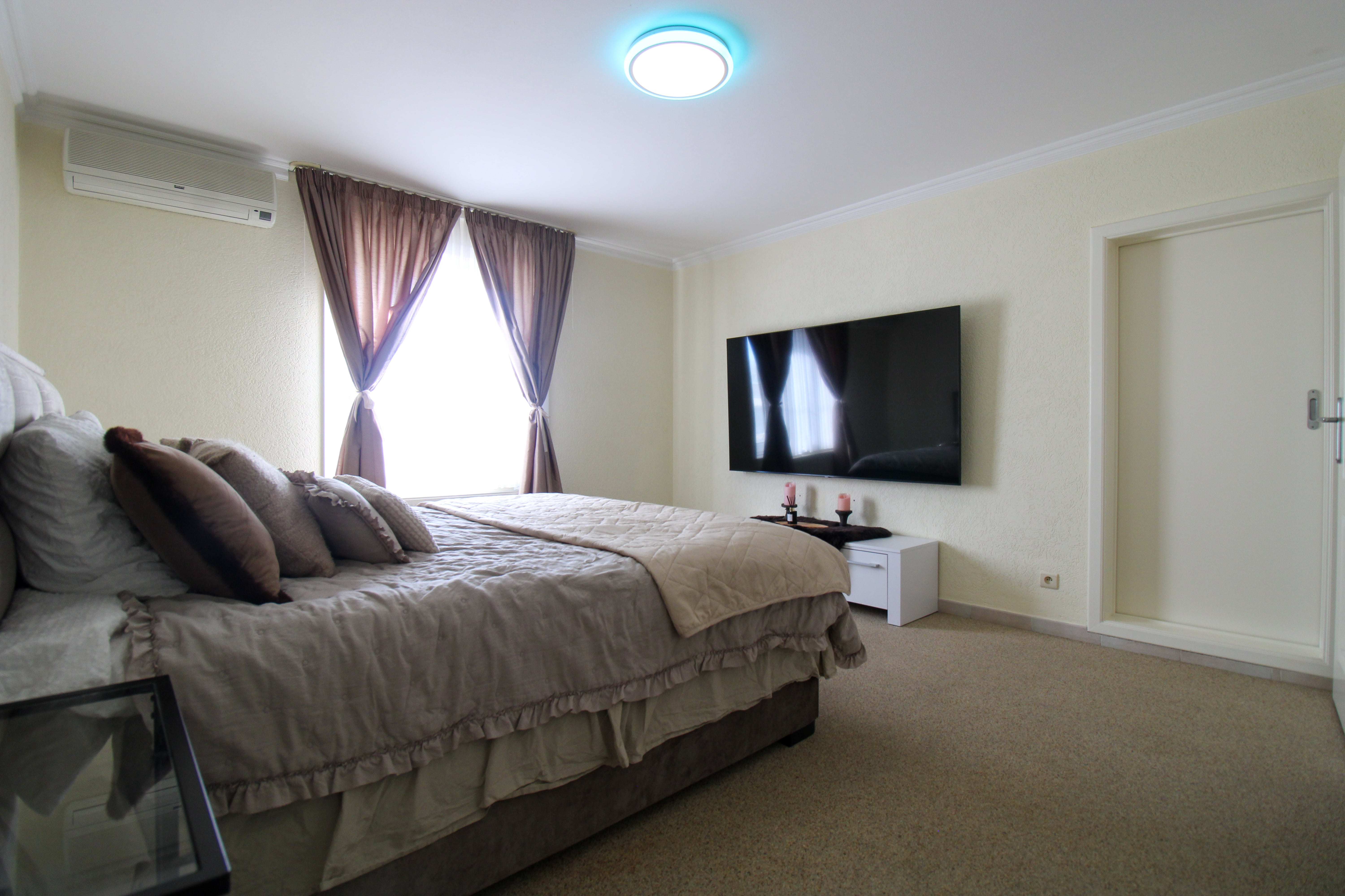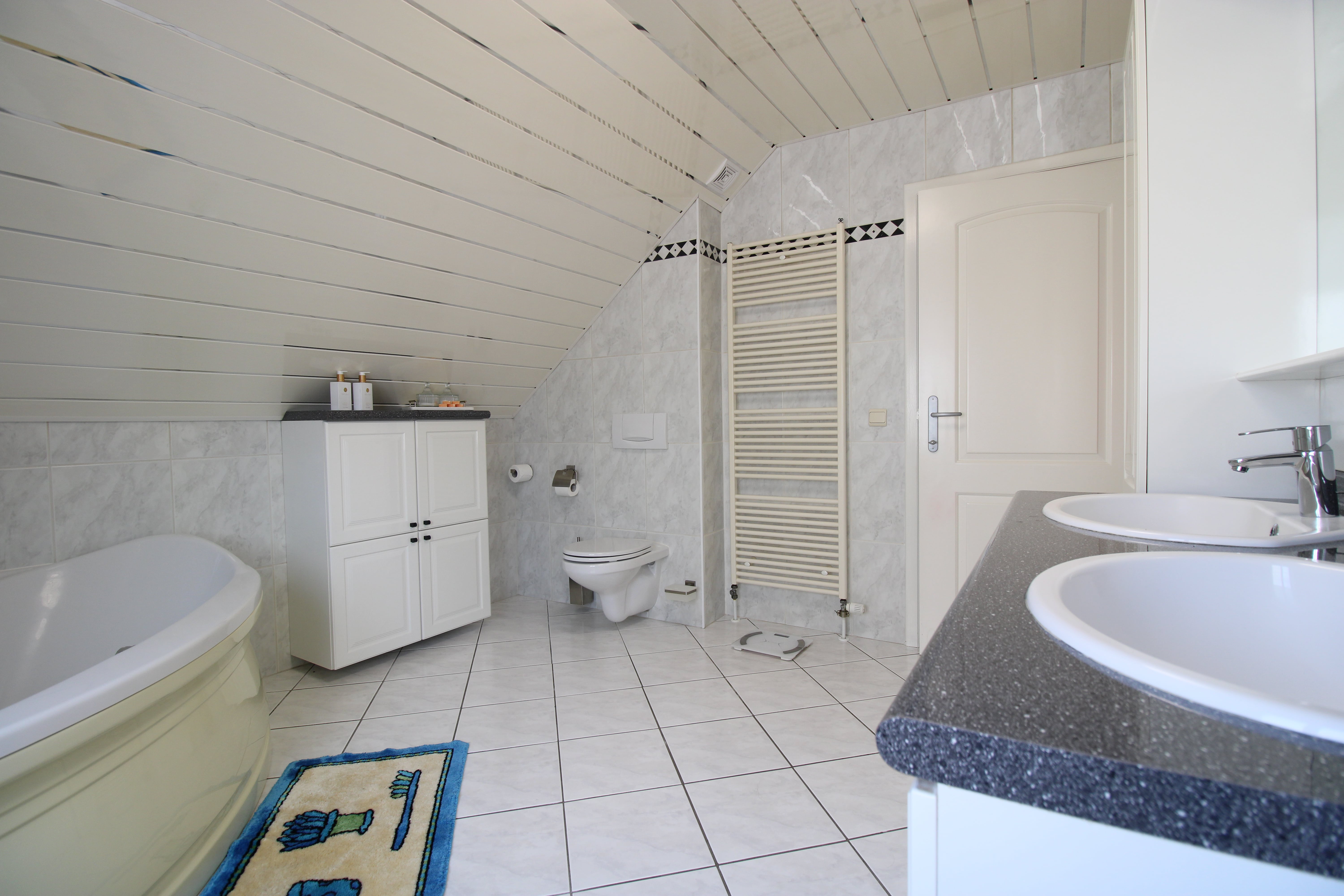 Op het verdiep bevinden zich 3 slaapkamers, waarvan 1 met inloopdressings, en een ruime badkamer met ligbad, dubbele lavabo en toilet.