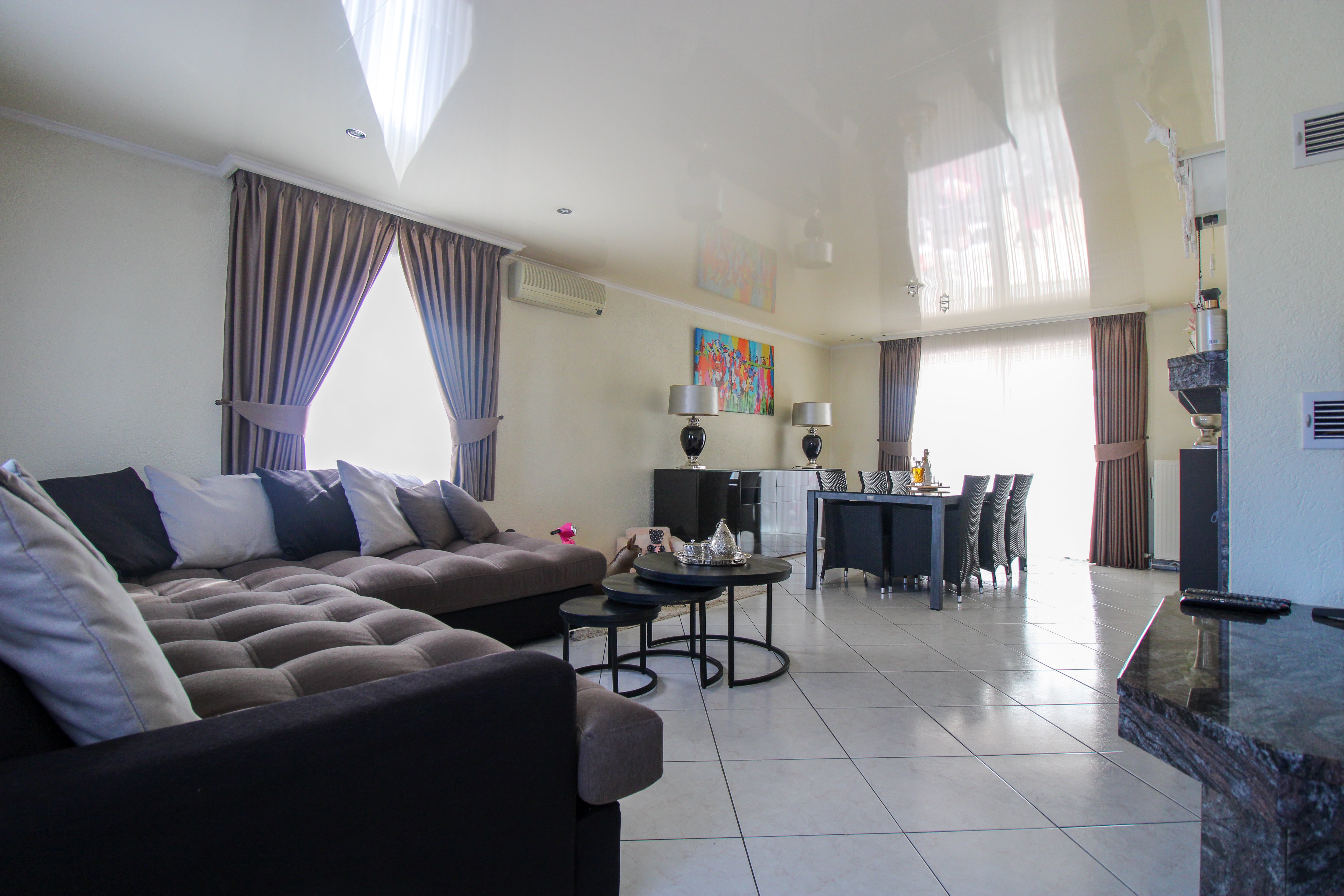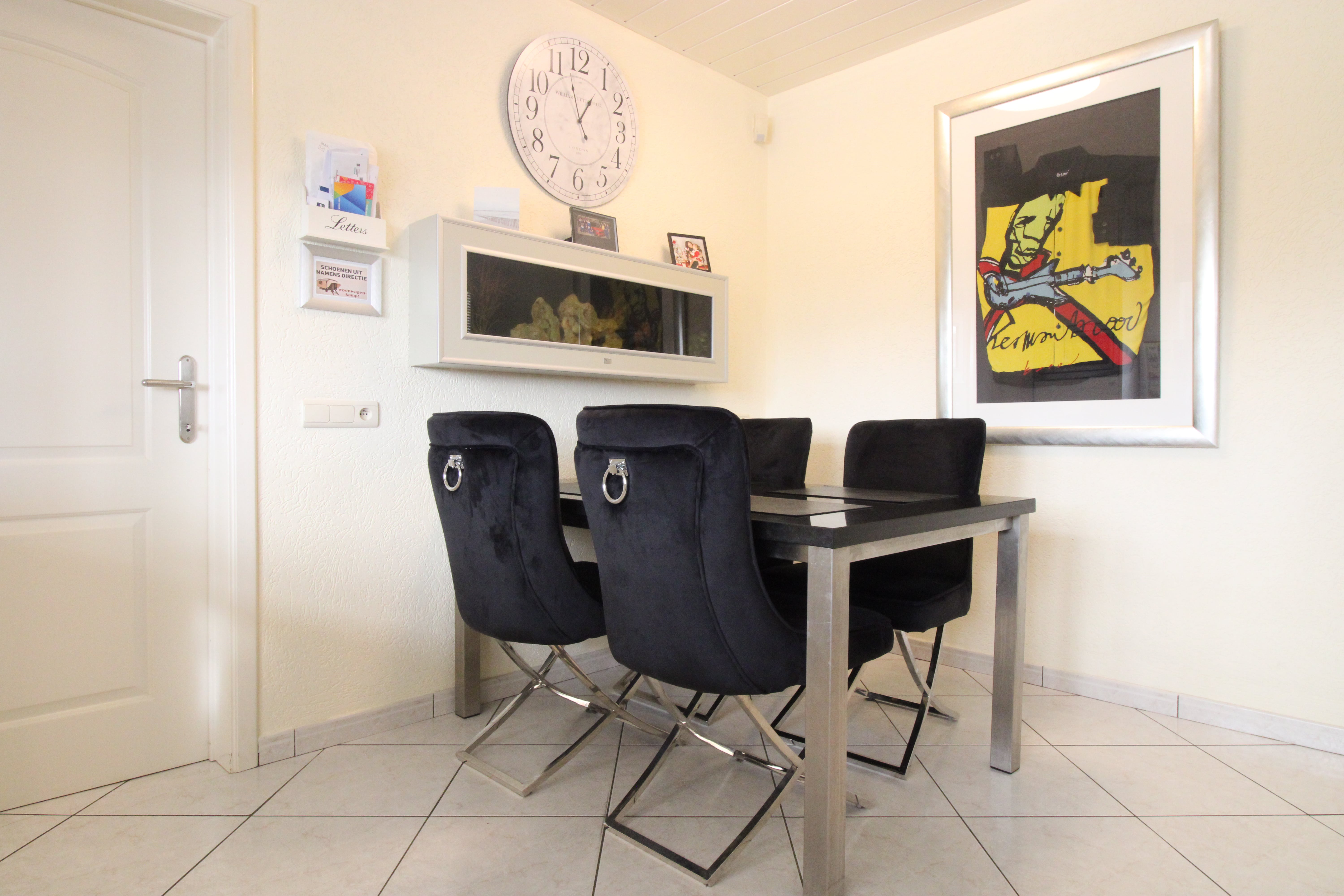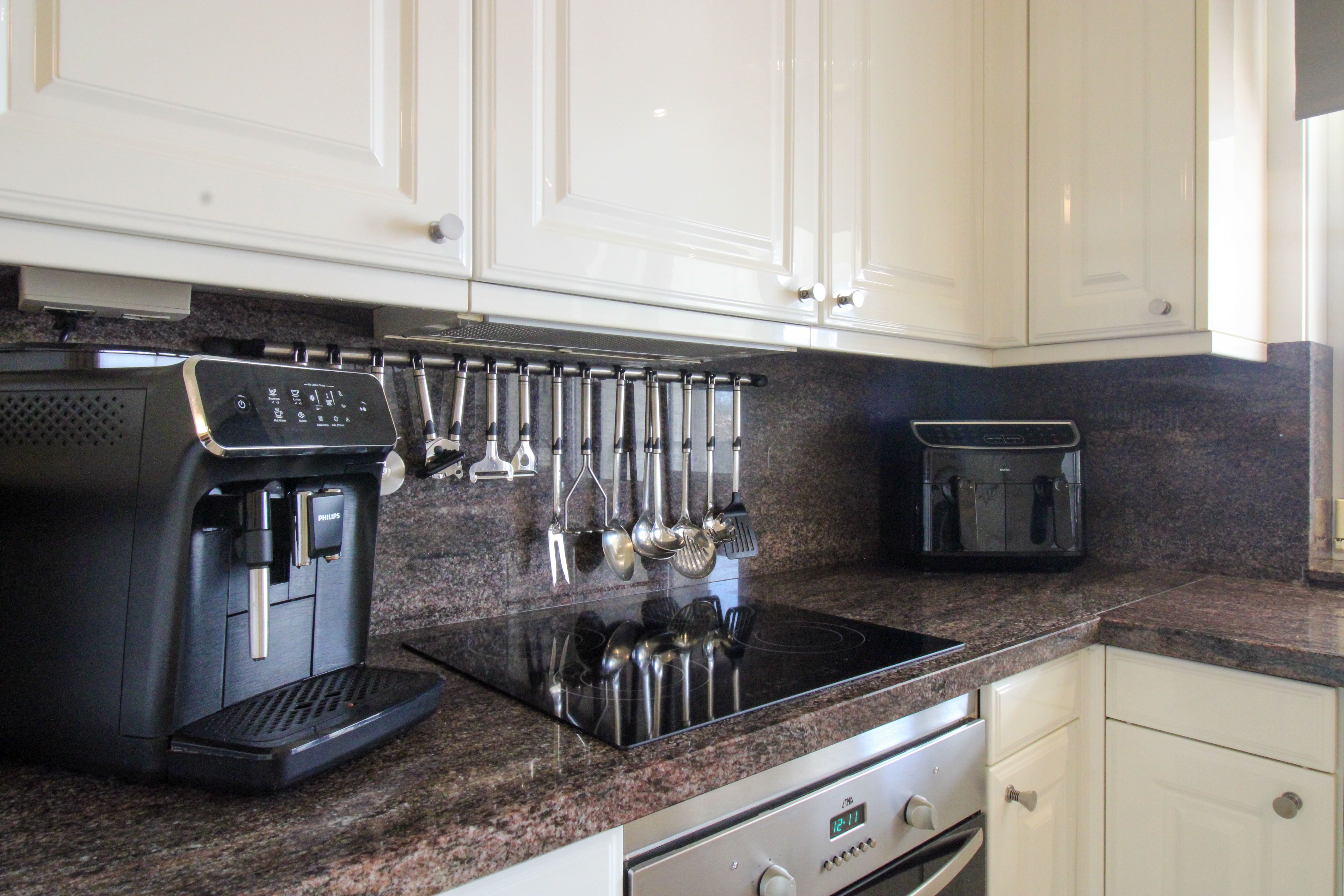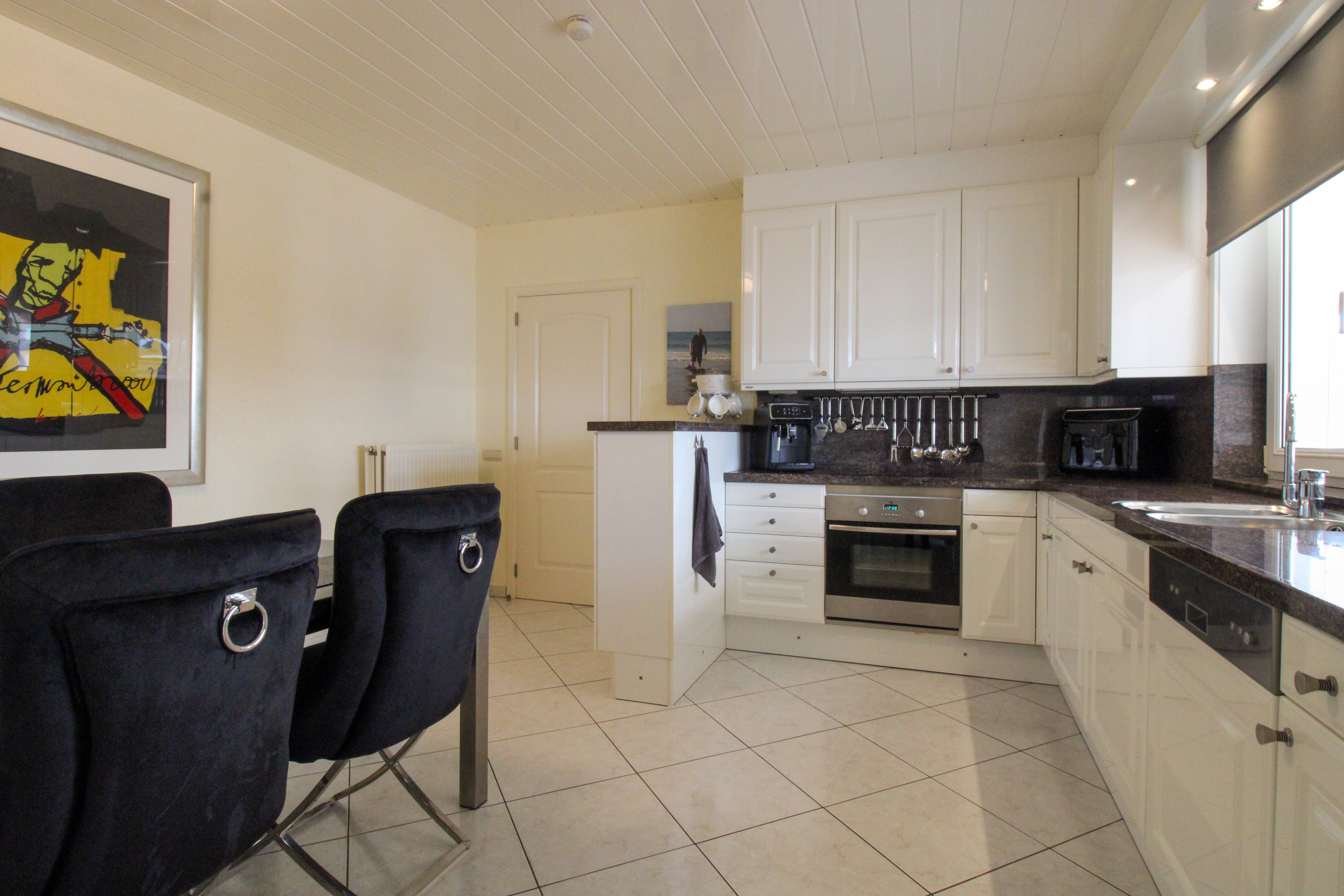 Aansluitend bevindt zich de aparte keuken, voorzien van vaatwasmachine, oven, microgolfoven, kookplaat met dampkap en spoelbak.