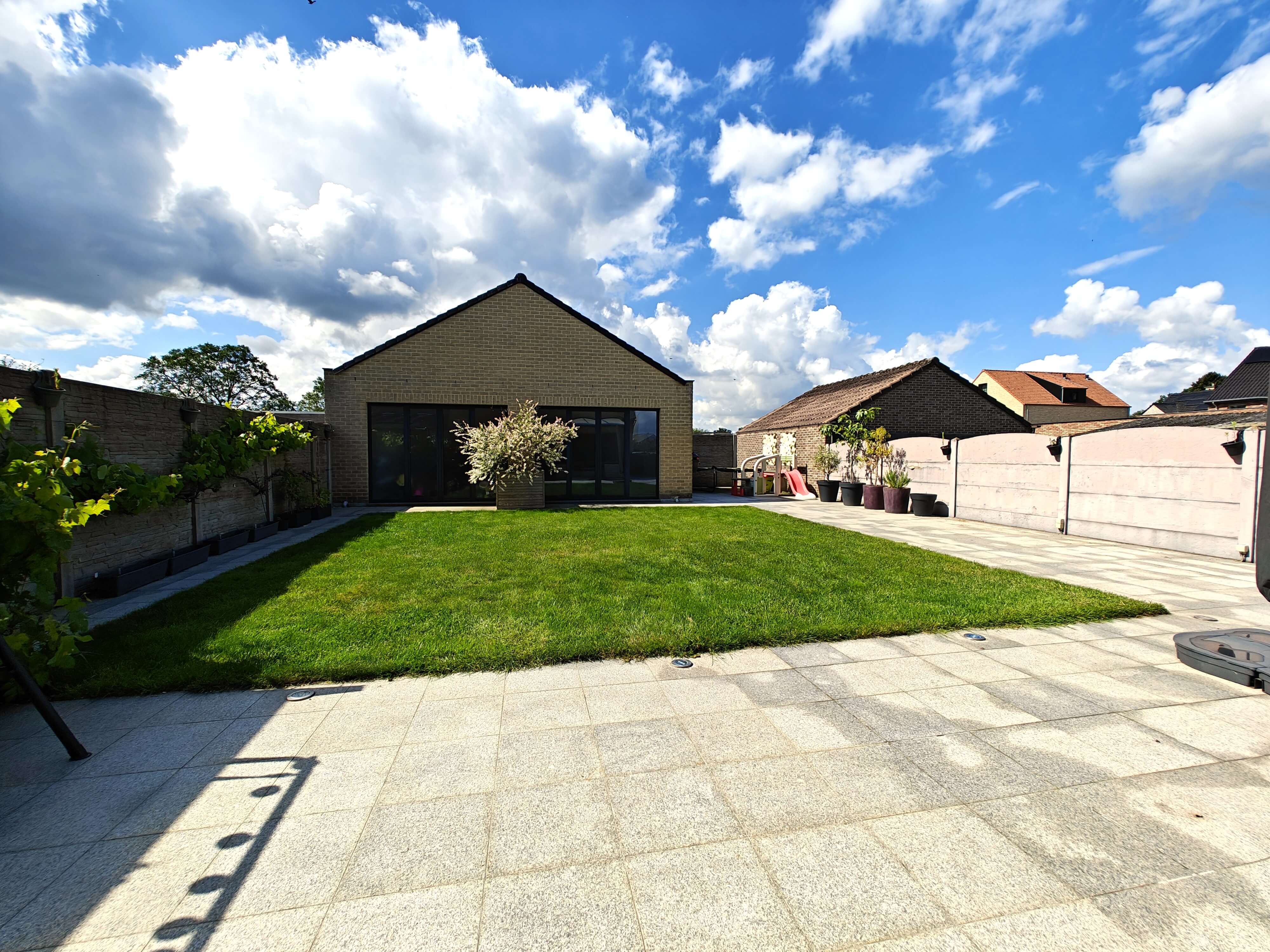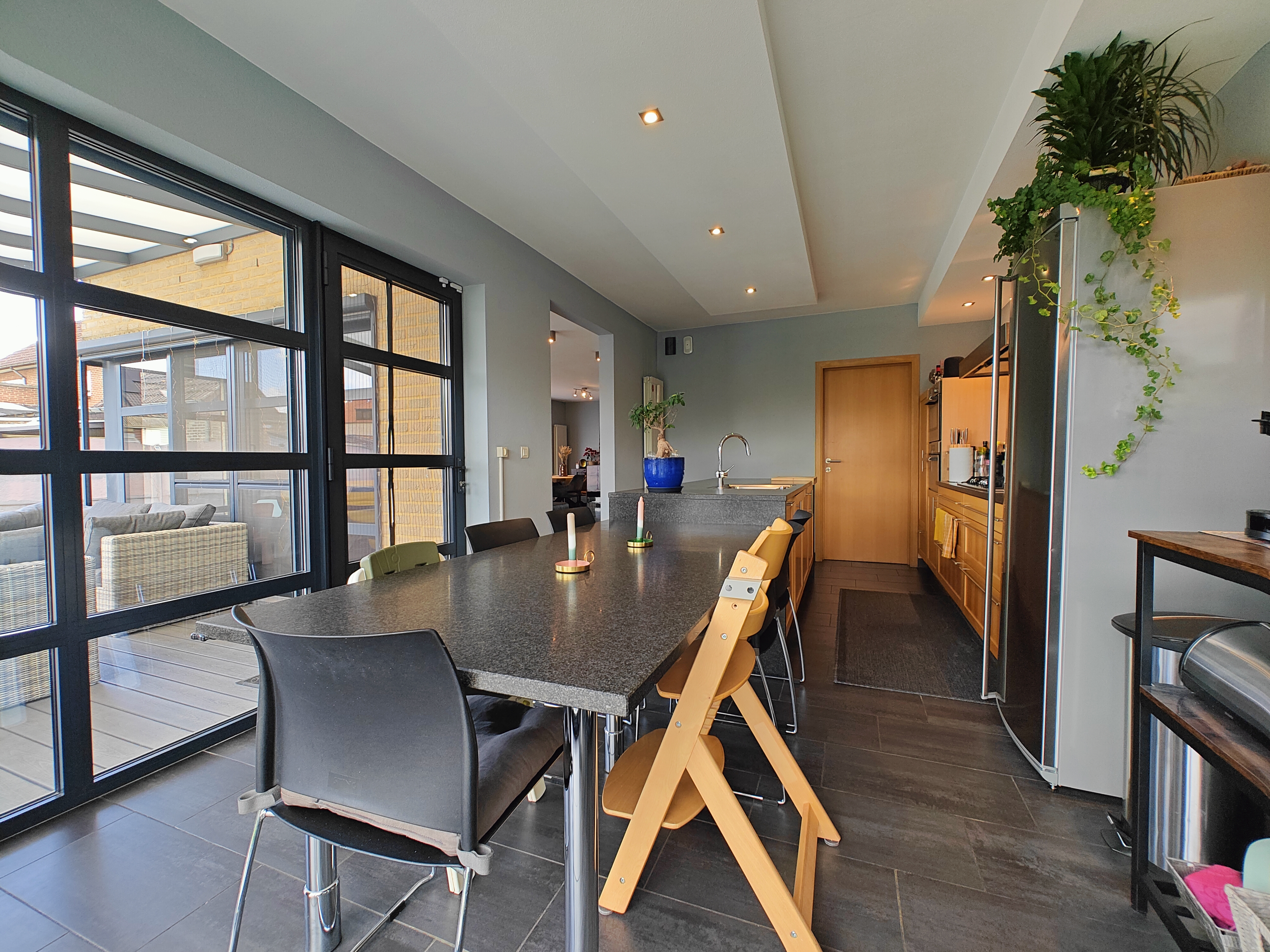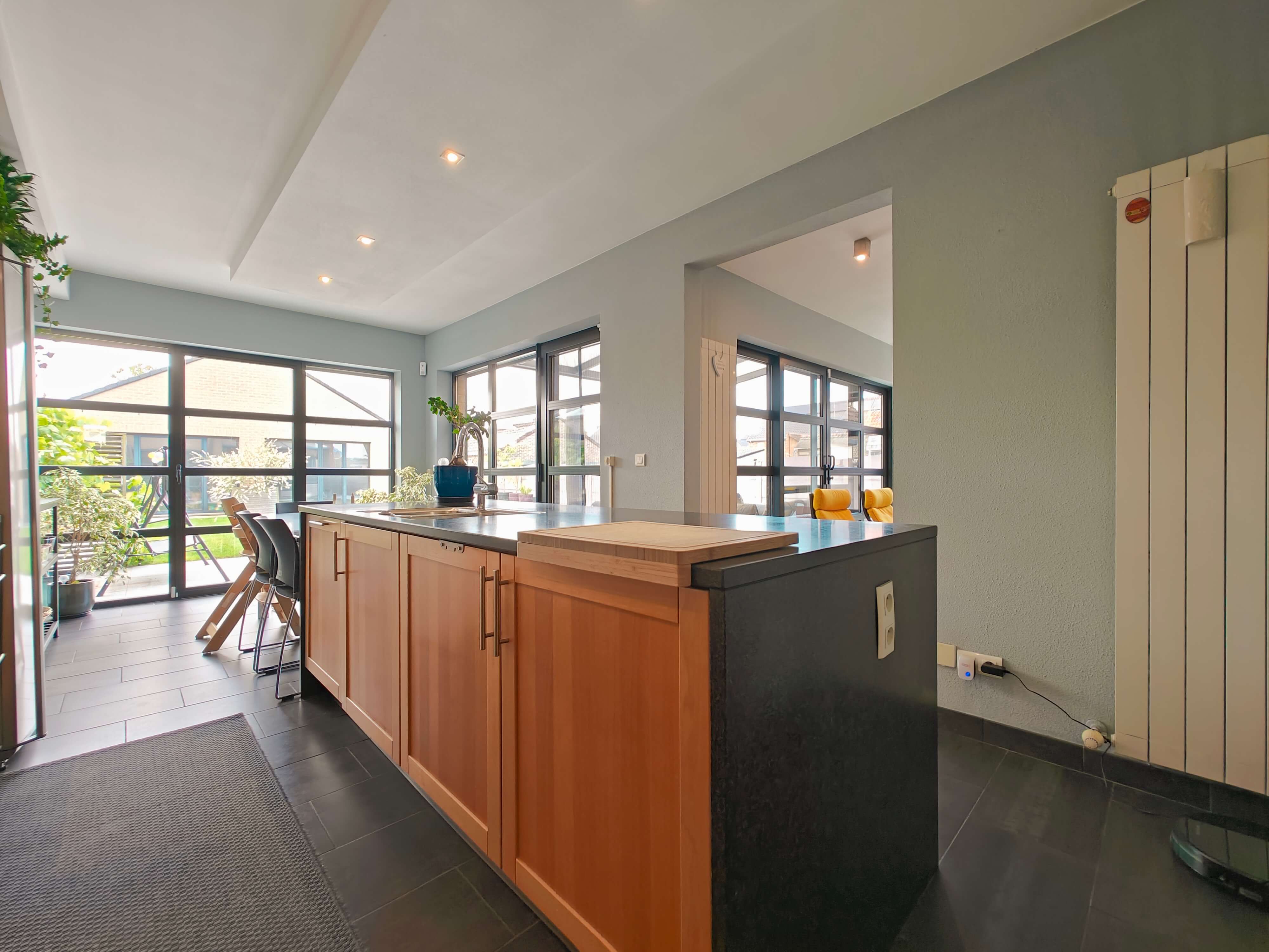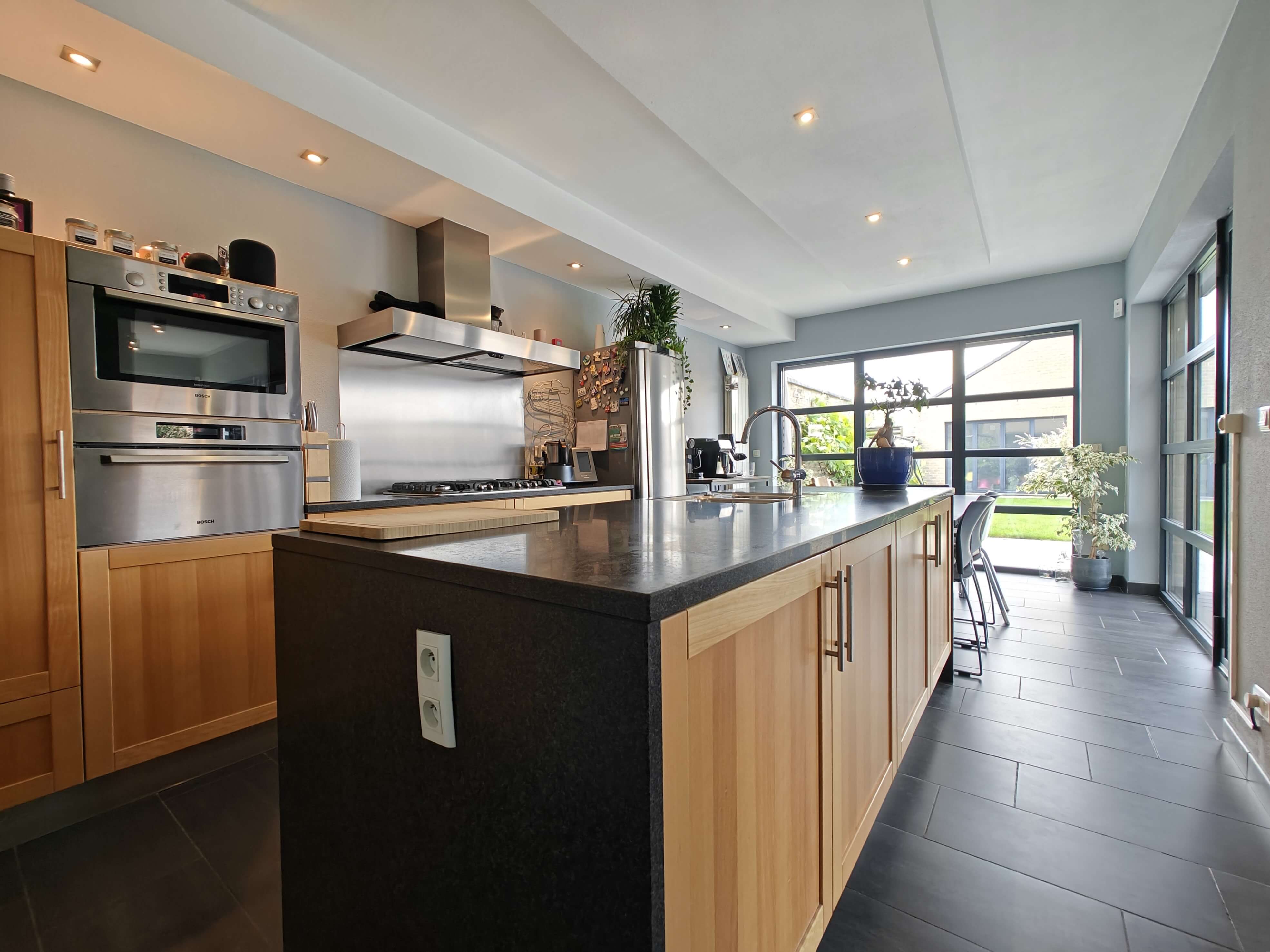 De leefruimte en volledig geïnstalleerde keuken met eiland en granieten afwerking bieden een prachtig uitzicht op de zuidgeoriënteerde tuin dankzij de grote raampartijen. Via de leefruimte en keuken bereikt u het overdekte terras, waar u kunt genieten van de rust en het groen van de tuin.