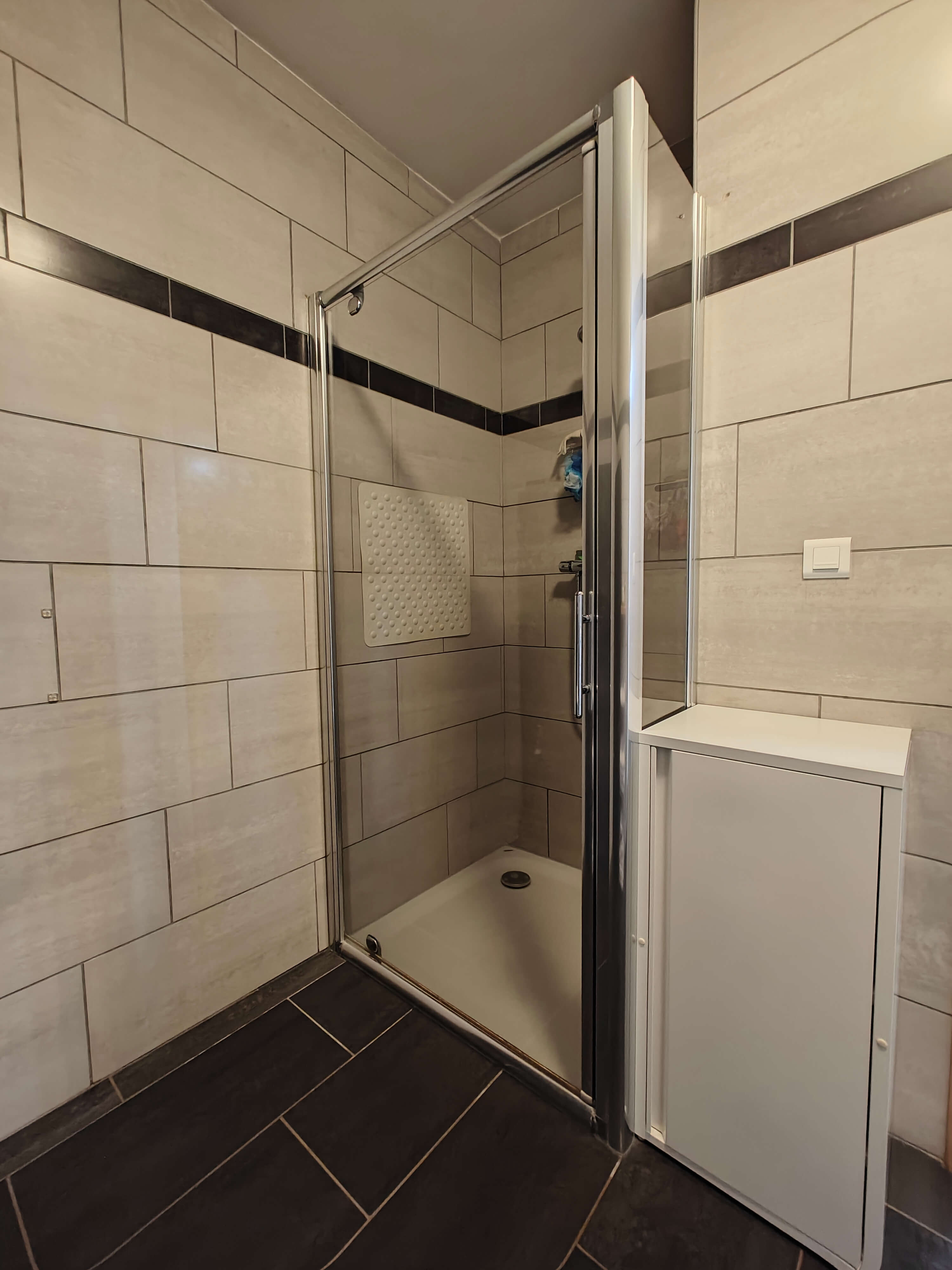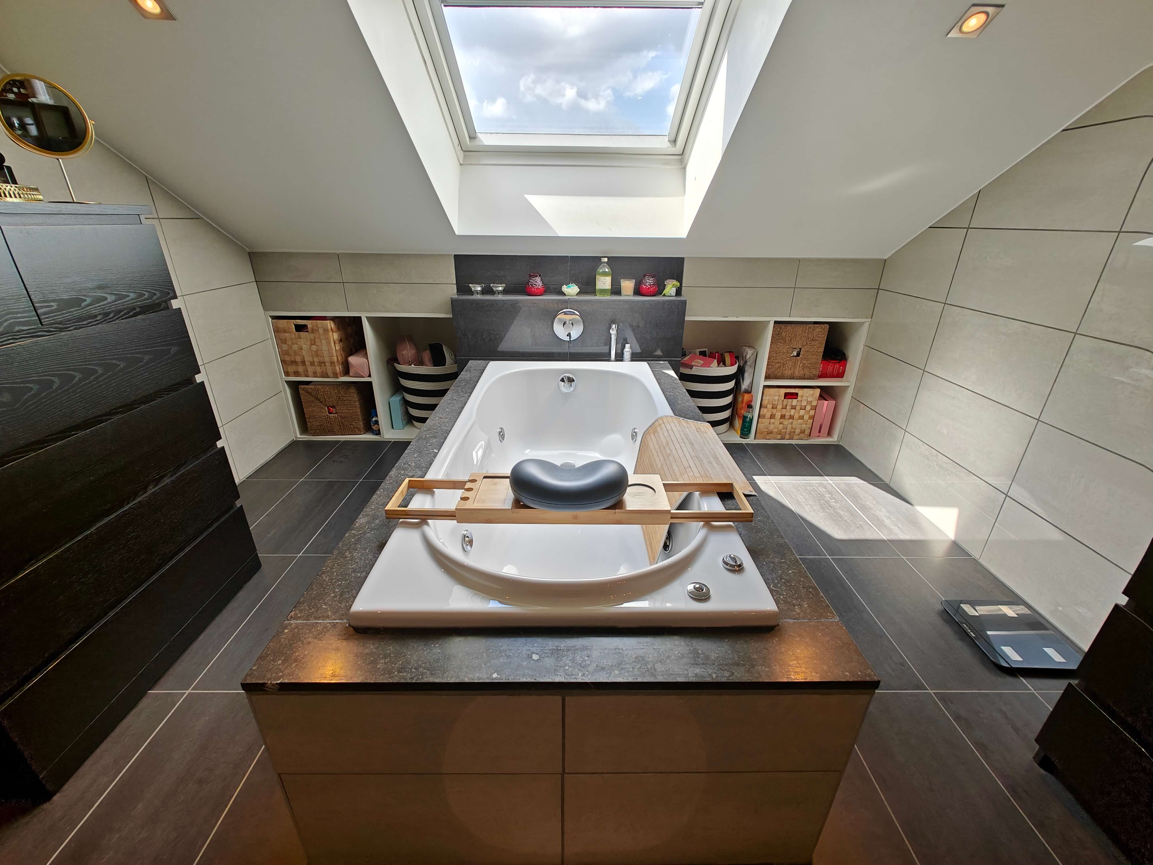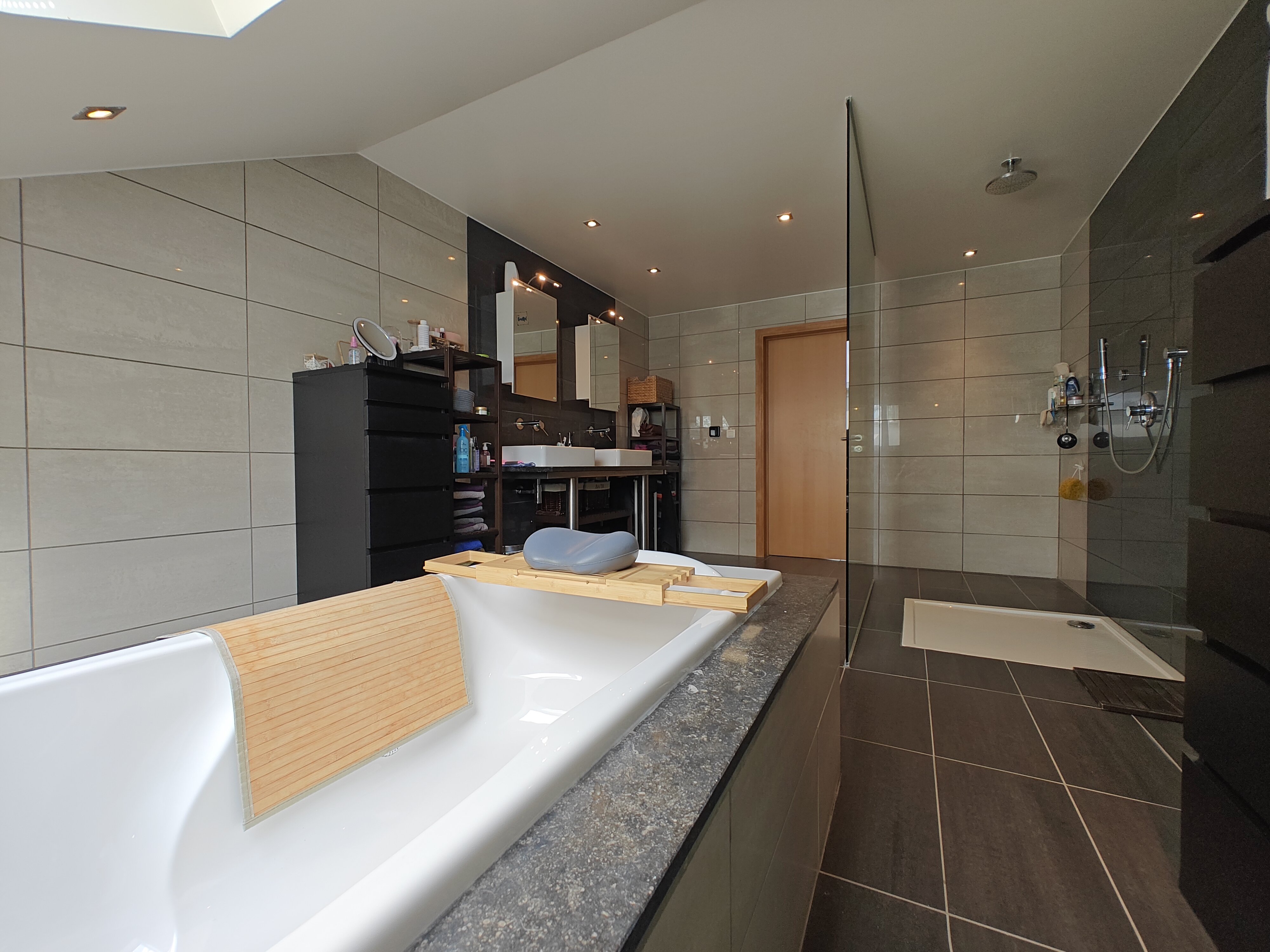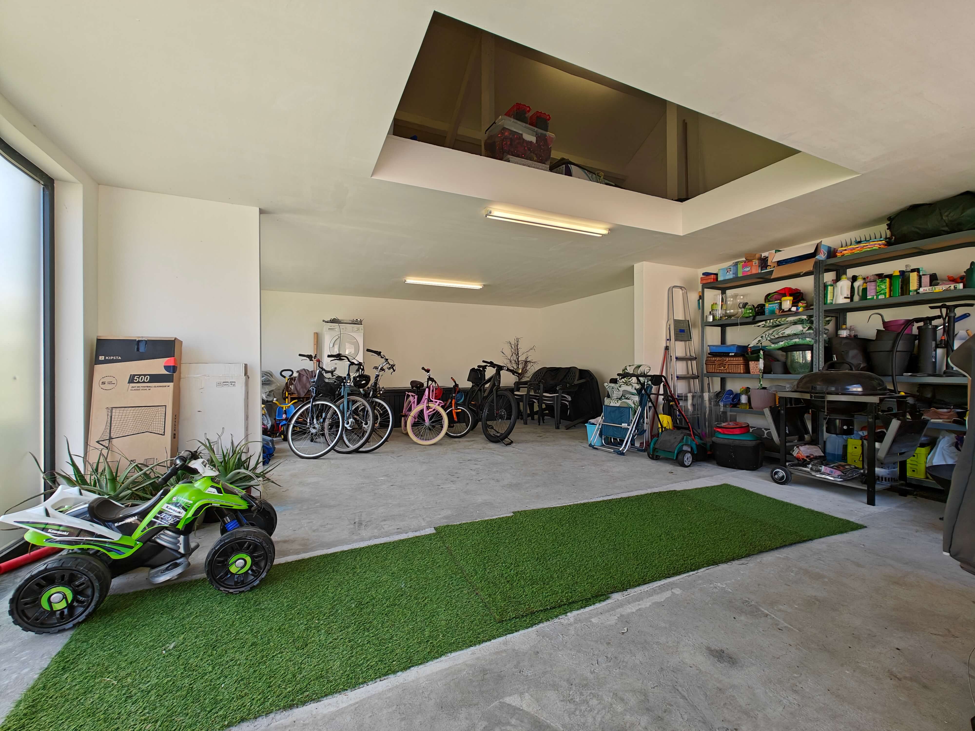 De leefruimte en volledig geïnstalleerde keuken met eiland en granieten afwerking bieden een prachtig uitzicht op de zuidgeoriënteerde tuin dankzij de grote raampartijen. Via de leefruimte en keuken bereikt u het overdekte terras, waar u kunt genieten van de rust en het groen van de tuin.
