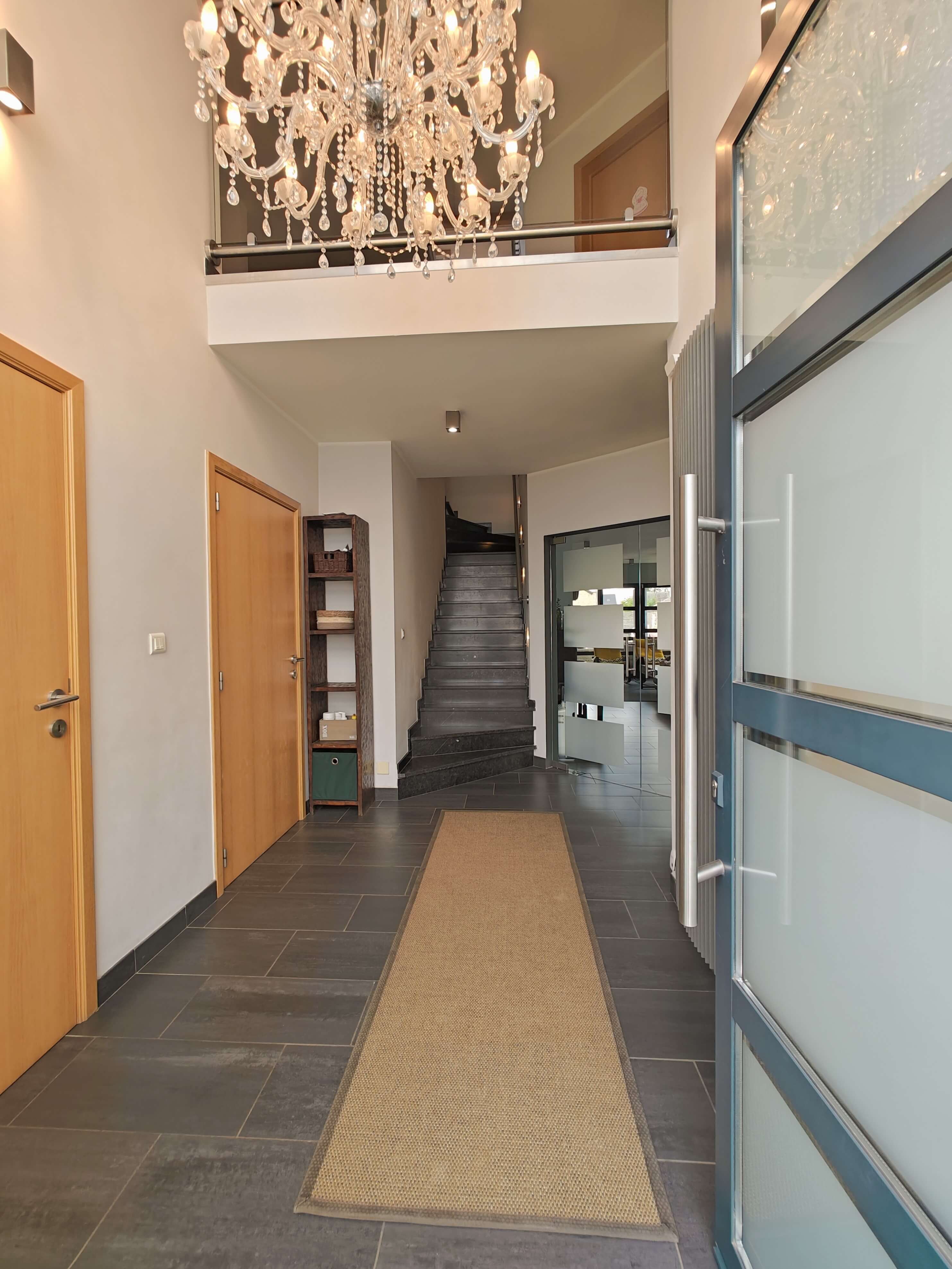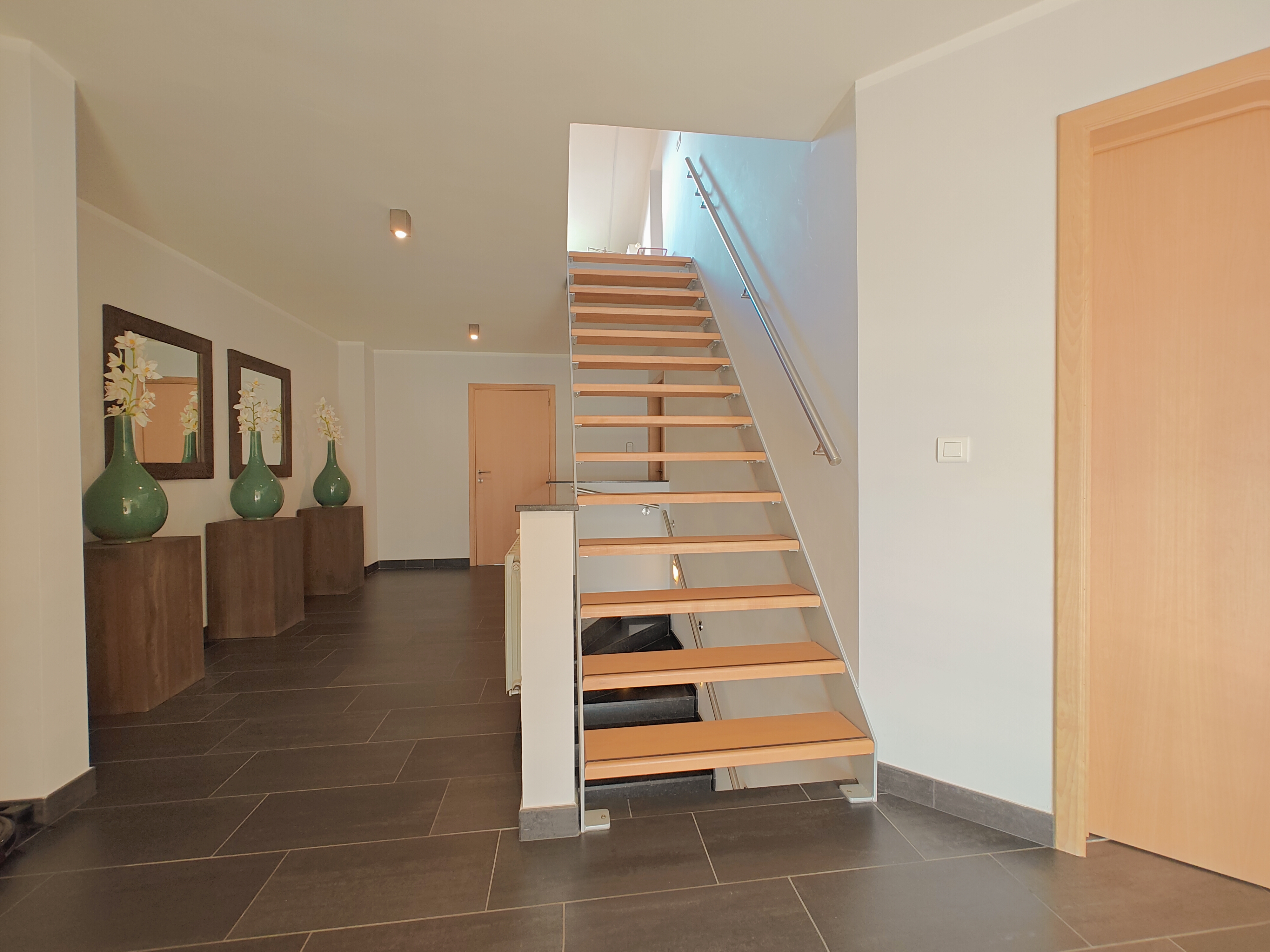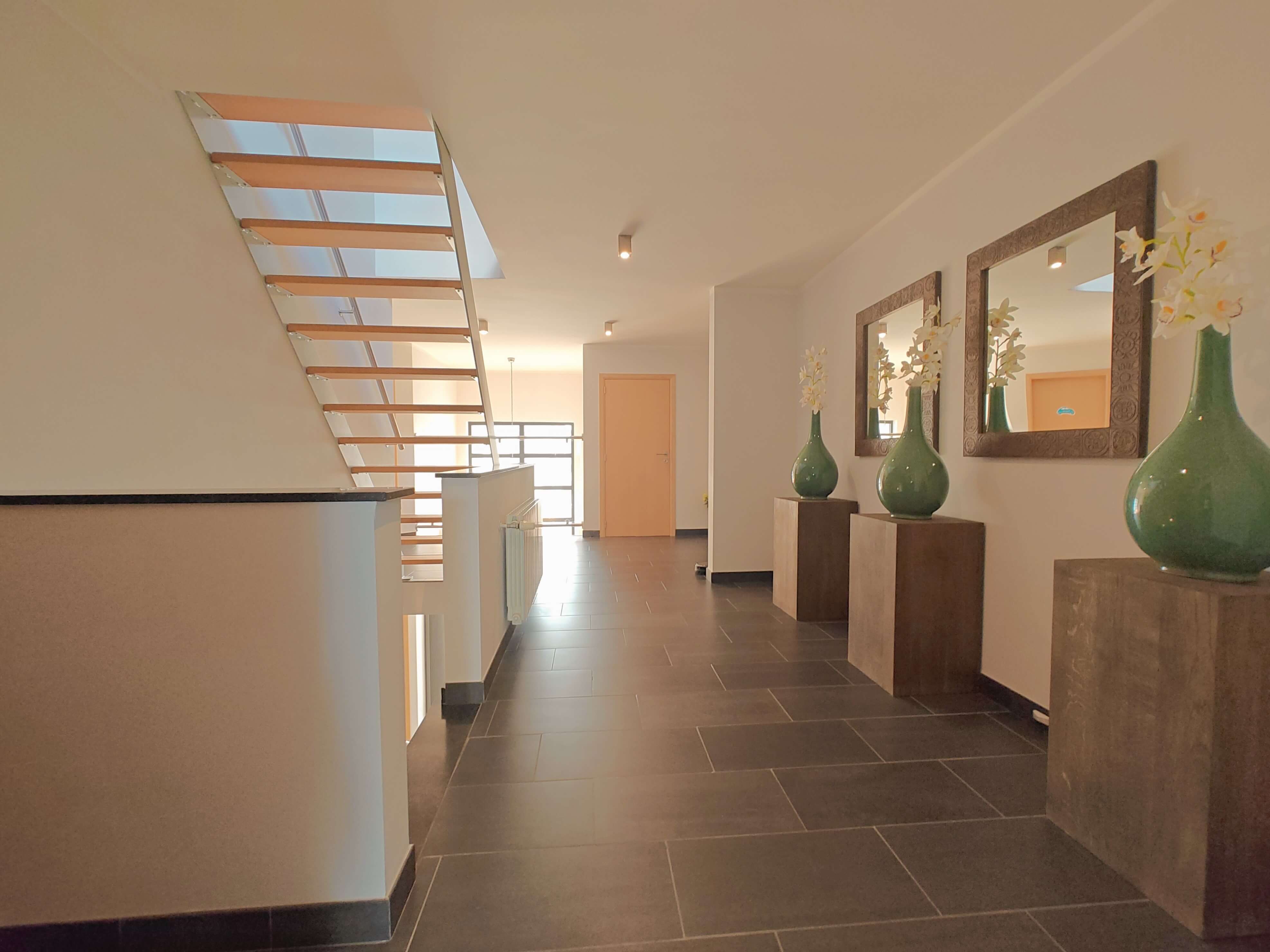 De vaste trap in de inkomhal leidt naar de eerste verdieping, waar u wordt verwelkomd door een ruime overloop. Hier bevinden zich drie grote slaapkamers, waarvan één met een inbouwkast, en een luxe badkamer met ligbad, inloopdouche en dubbel wasmeubel. Inbouwkasten zorgen voor extra bergruimte.