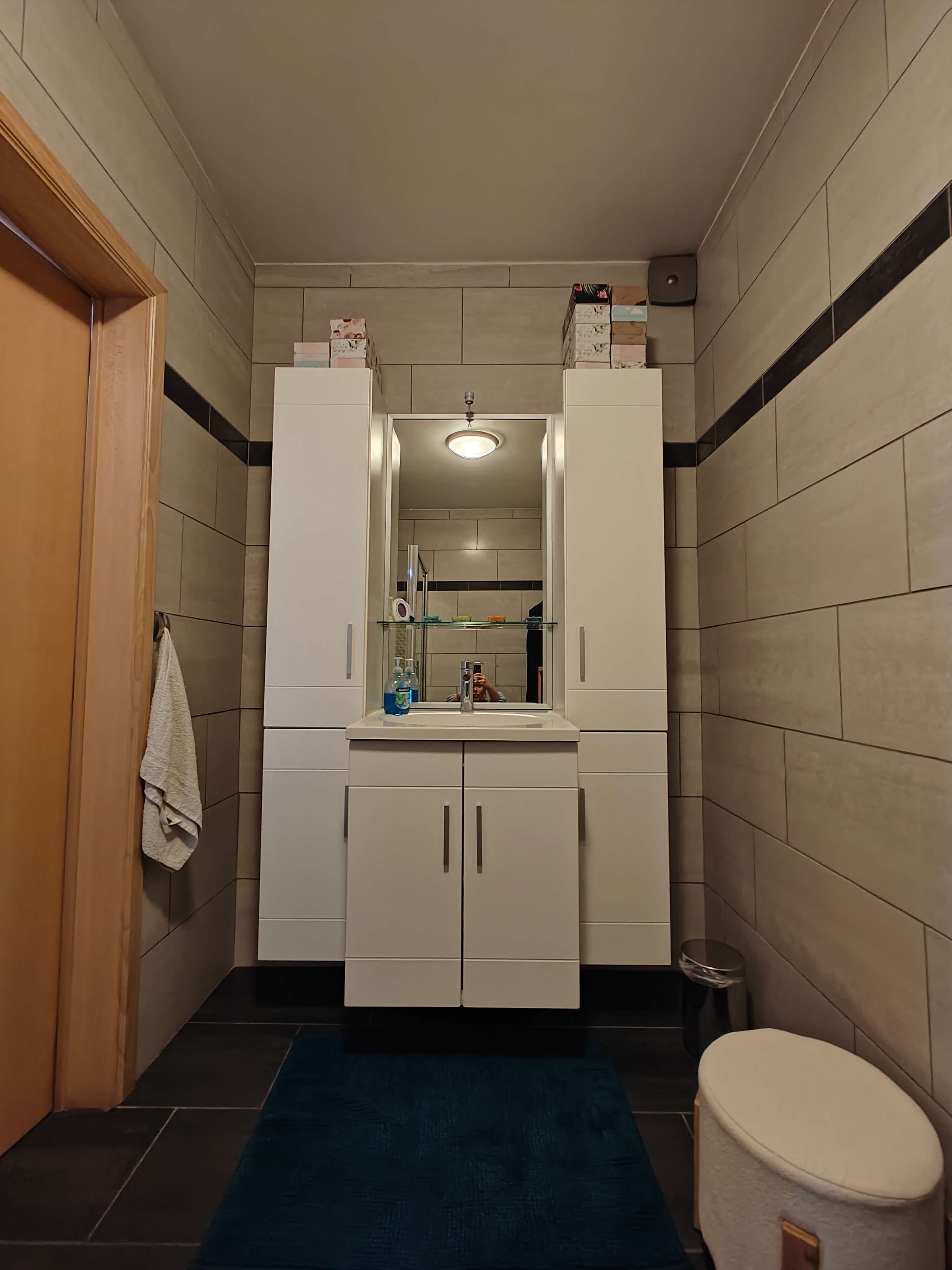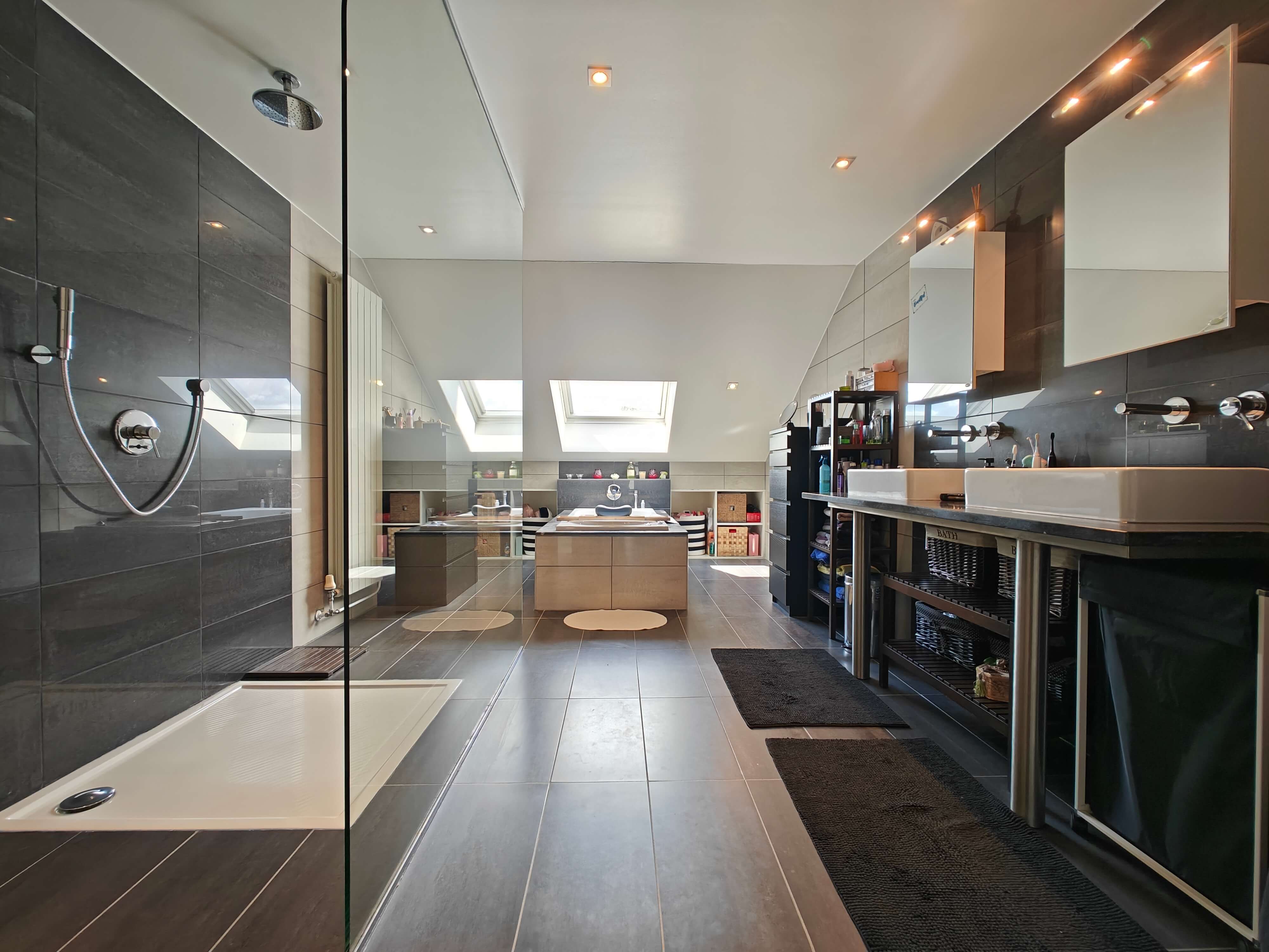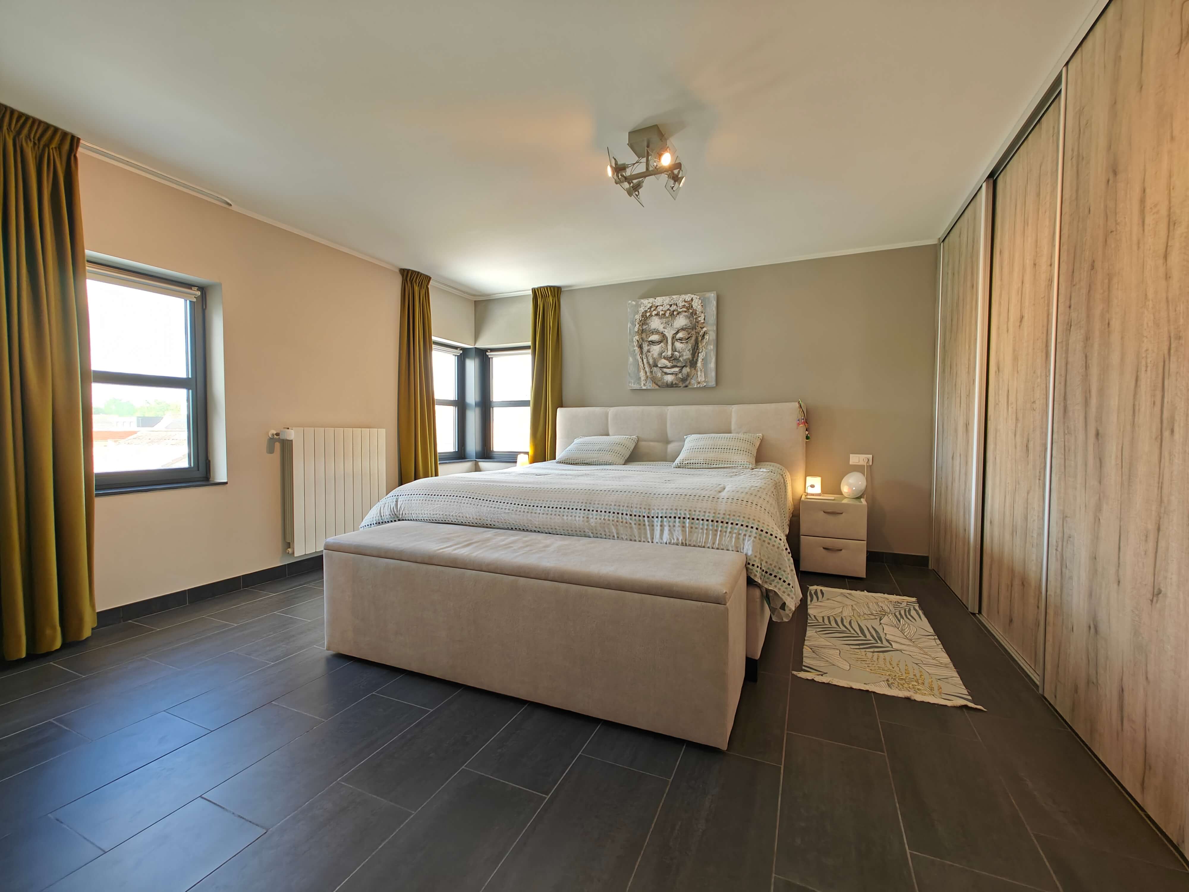 De vaste trap in de inkomhal leidt naar de eerste verdieping, waar u wordt verwelkomd door een ruime overloop. Hier bevinden zich drie grote slaapkamers, waarvan één met een inbouwkast, en een luxe badkamer met ligbad, inloopdouche en dubbel wasmeubel. Inbouwkasten zorgen voor extra bergruimte.