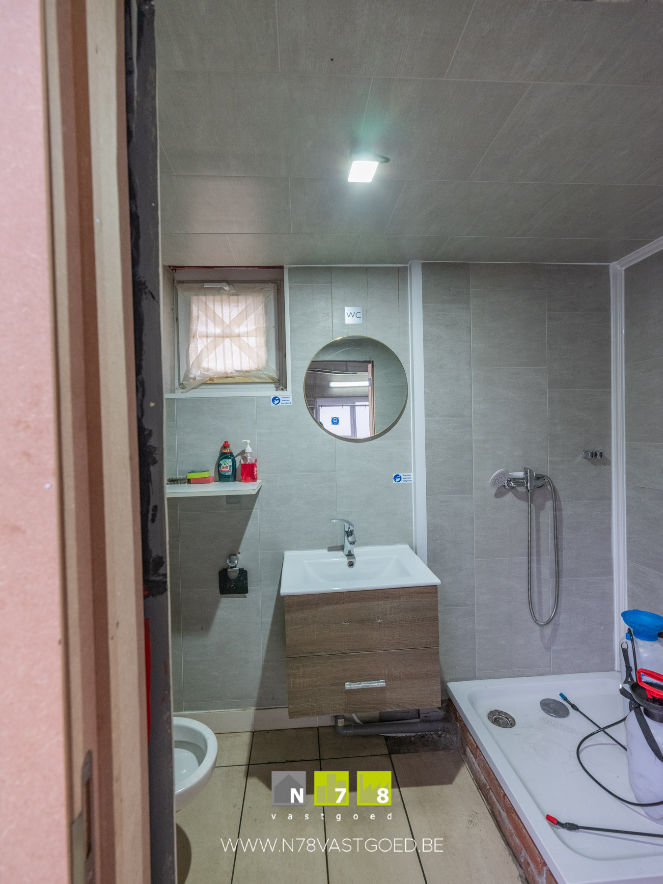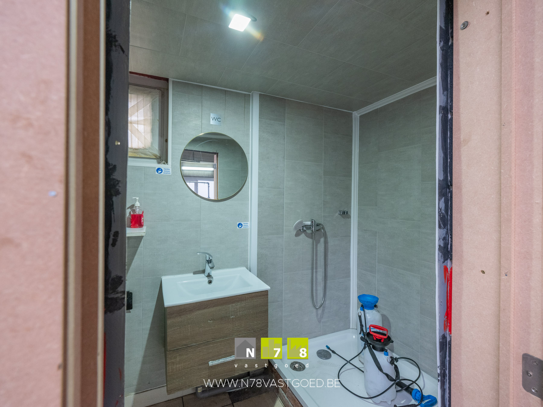 - Badkamer (3,20m x 2,00m = 6,40m²): enkele lavabo, douchecabine, hangtoilet, tegelvloer.