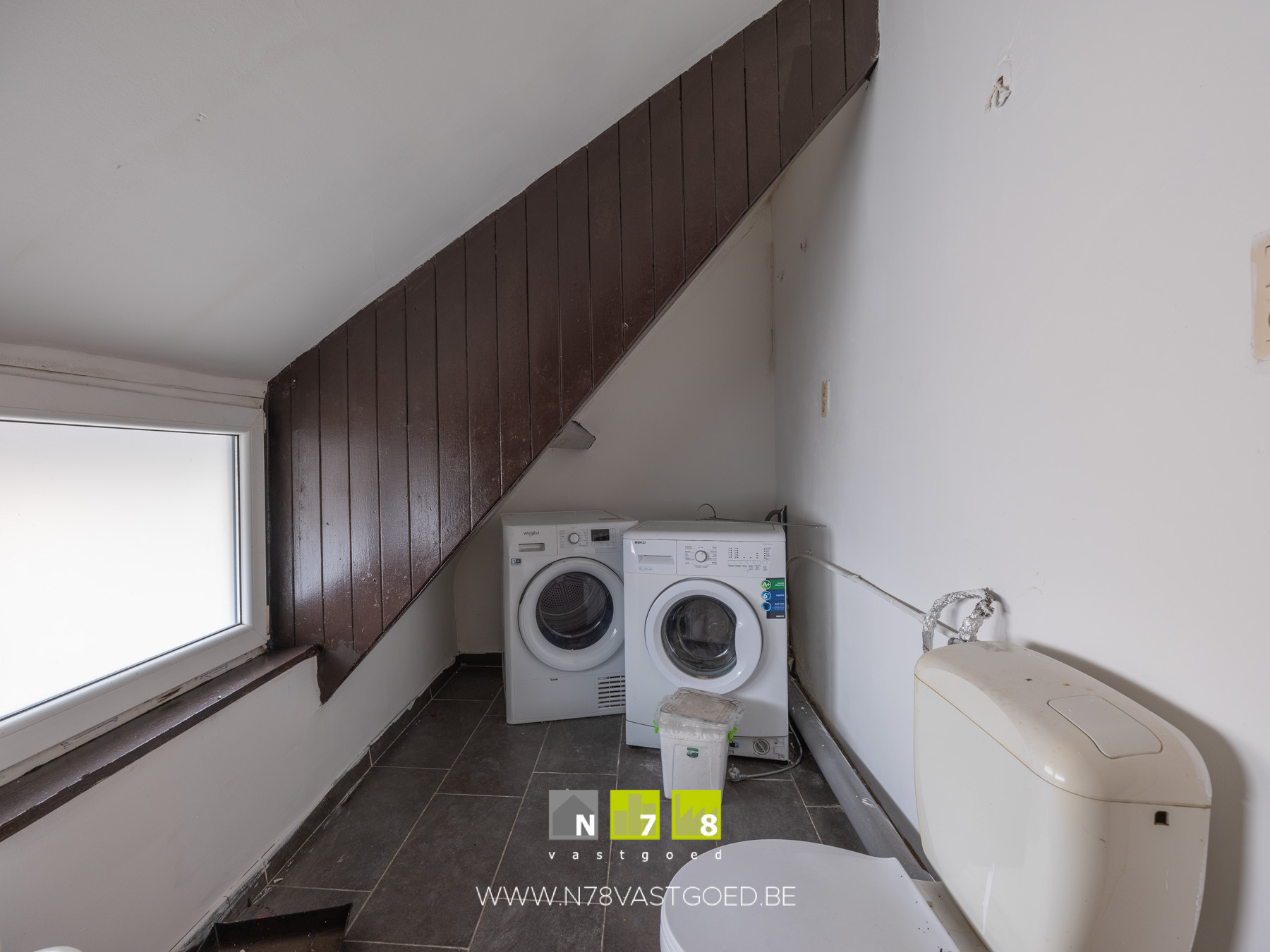 - Wasplaats (3,50m x 1,75m = 6,13m²): aansluiting wasmachine/droogkast, zittoilet, tegelvloer.