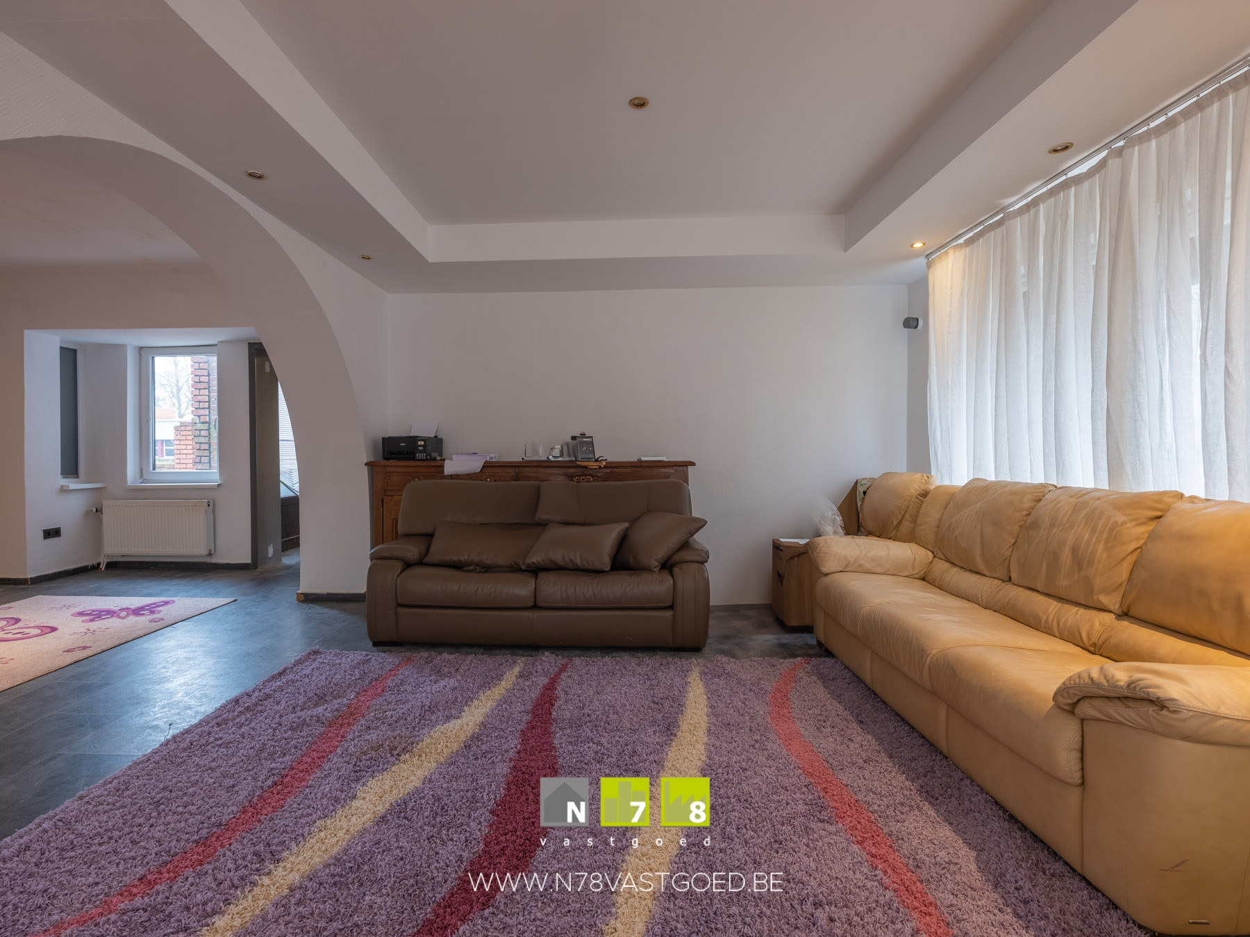 - Woonkamer (8,20m x 4,25m = 34,85m²): doorgang met boog naar de eetplaats, tegelvloer.