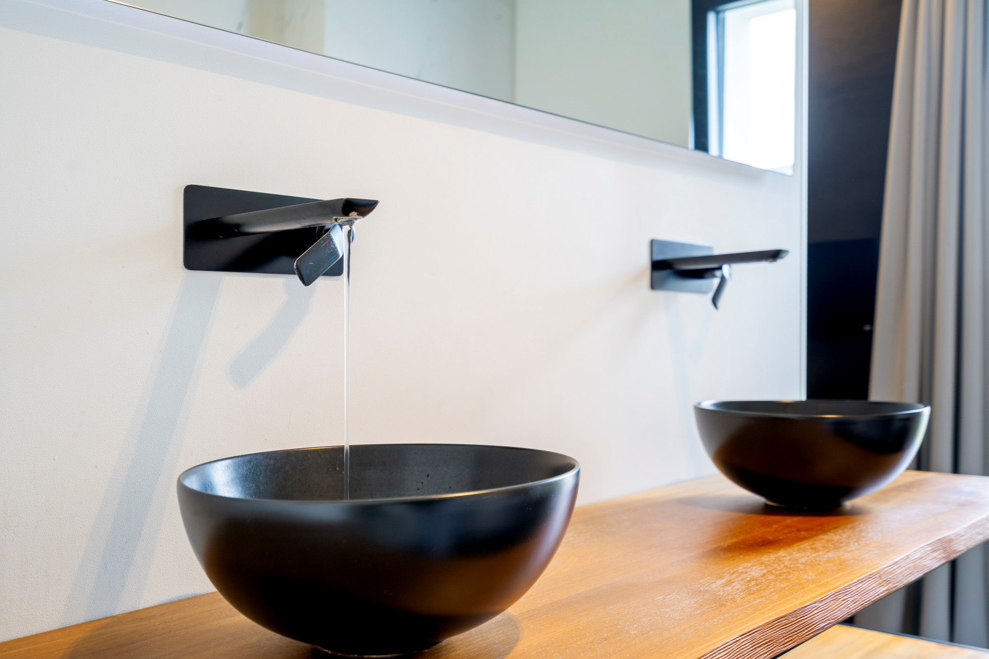 The first bathroom is installed with a vanity unit including two sinks, walk-in shower, freestanding designer bathtub and a toilet.