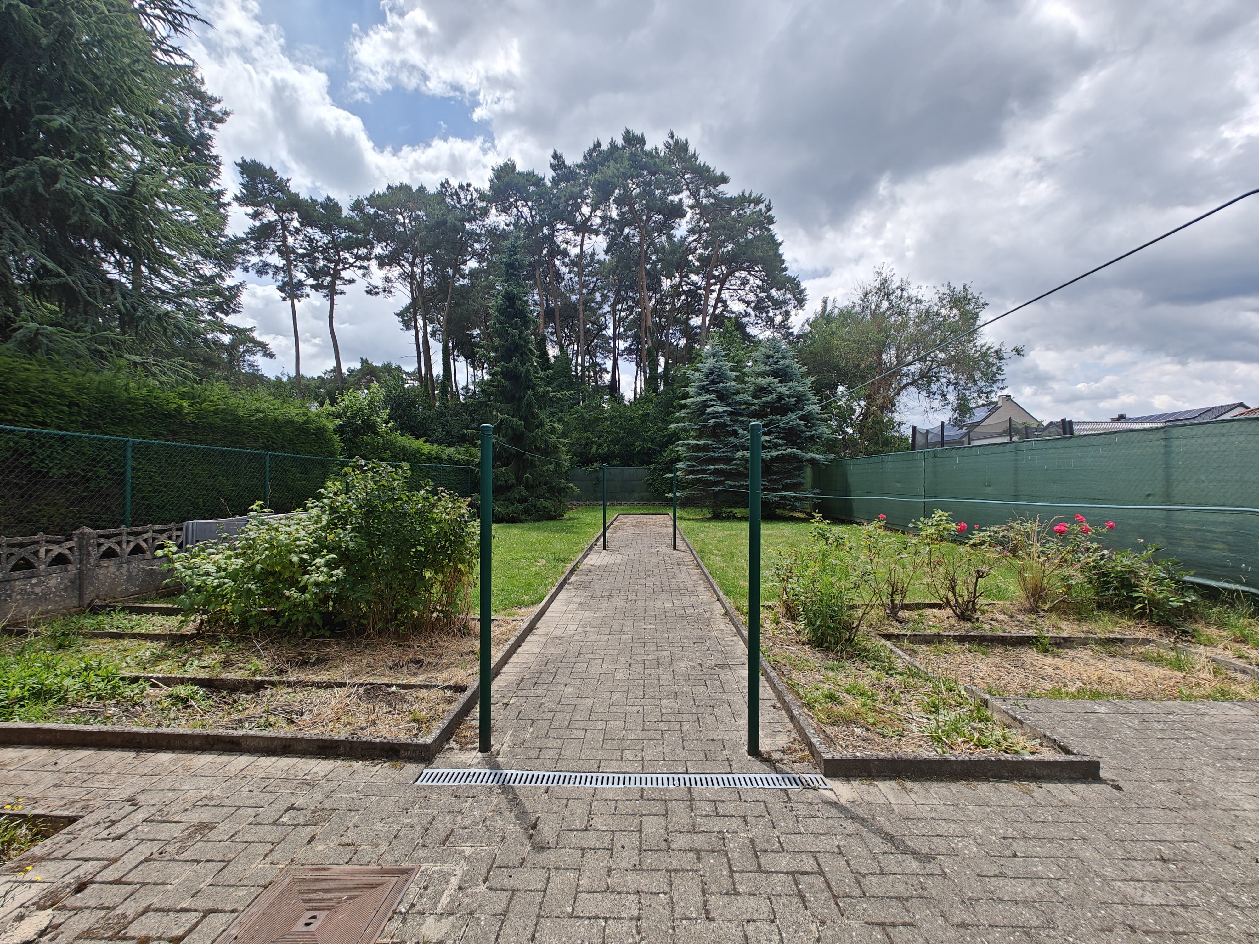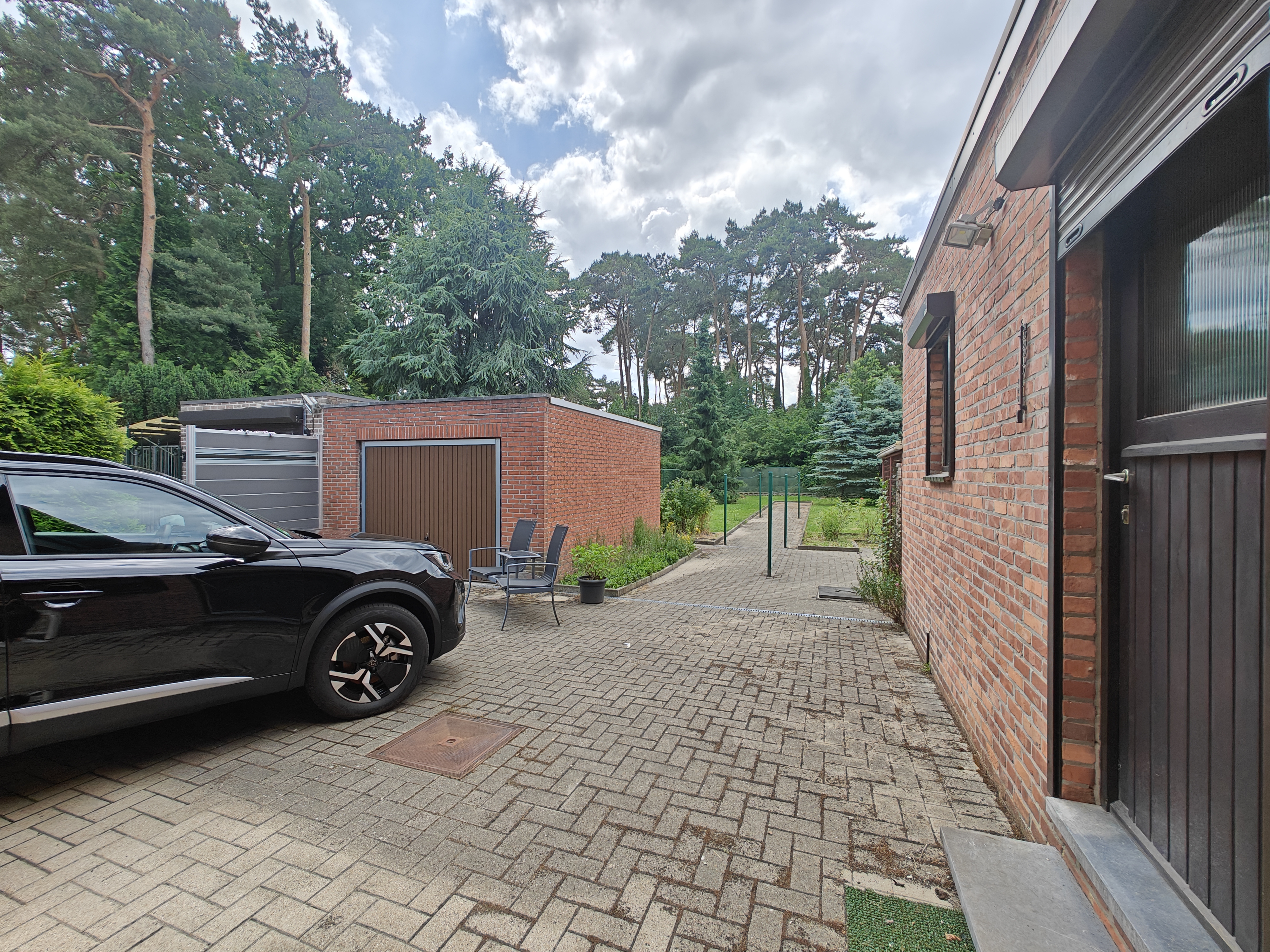 Langs de linkerzijde van de woning leidt een oprit naar de vrijstaande garage, voldoende ruim voor 1 wagen. De garagepoort werd vernieuwd in 2017-2018. Ook de oprit werd in 2015 opnieuw aangelegd met klinkers, net als het terras.