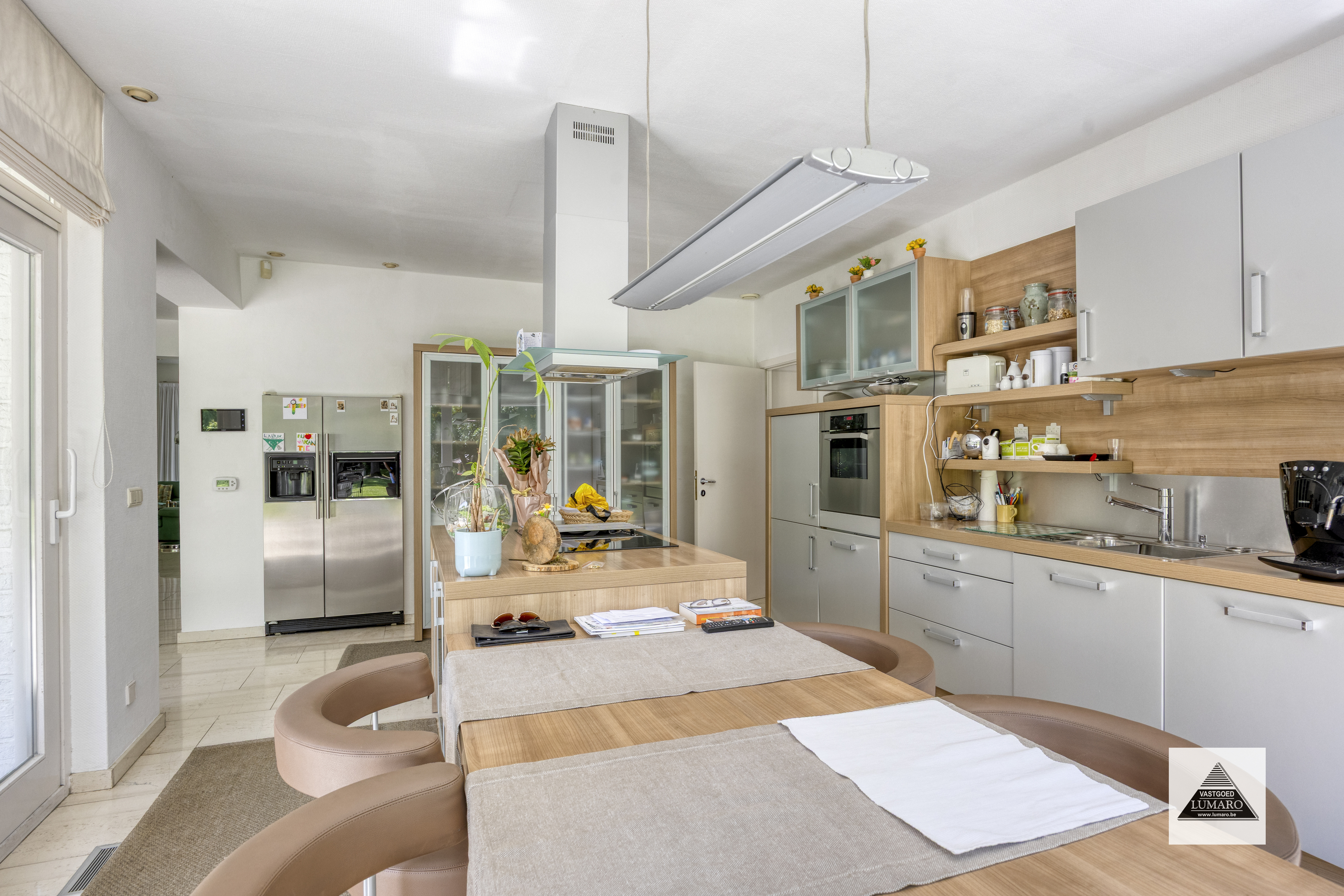 - Leefkeuken : (5,85 m x 4,00 m = 23,40 m²) – natuursteen vloer – volledig ingericht met Amerikaanse koelkast, kookeiland met kookplaat Boretti, koffiemachine, ovens, … - 2 schuifpuien naar de tuin