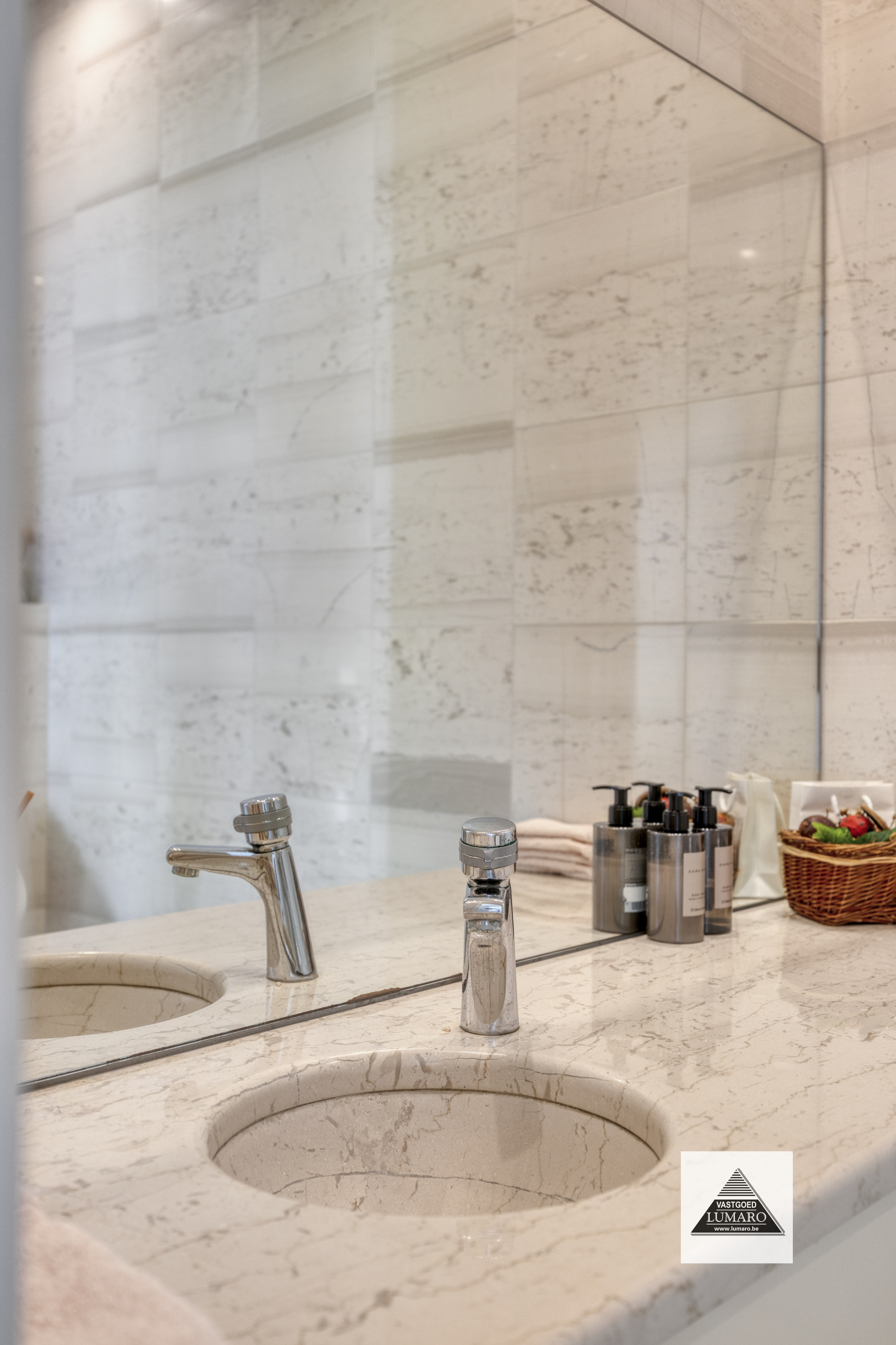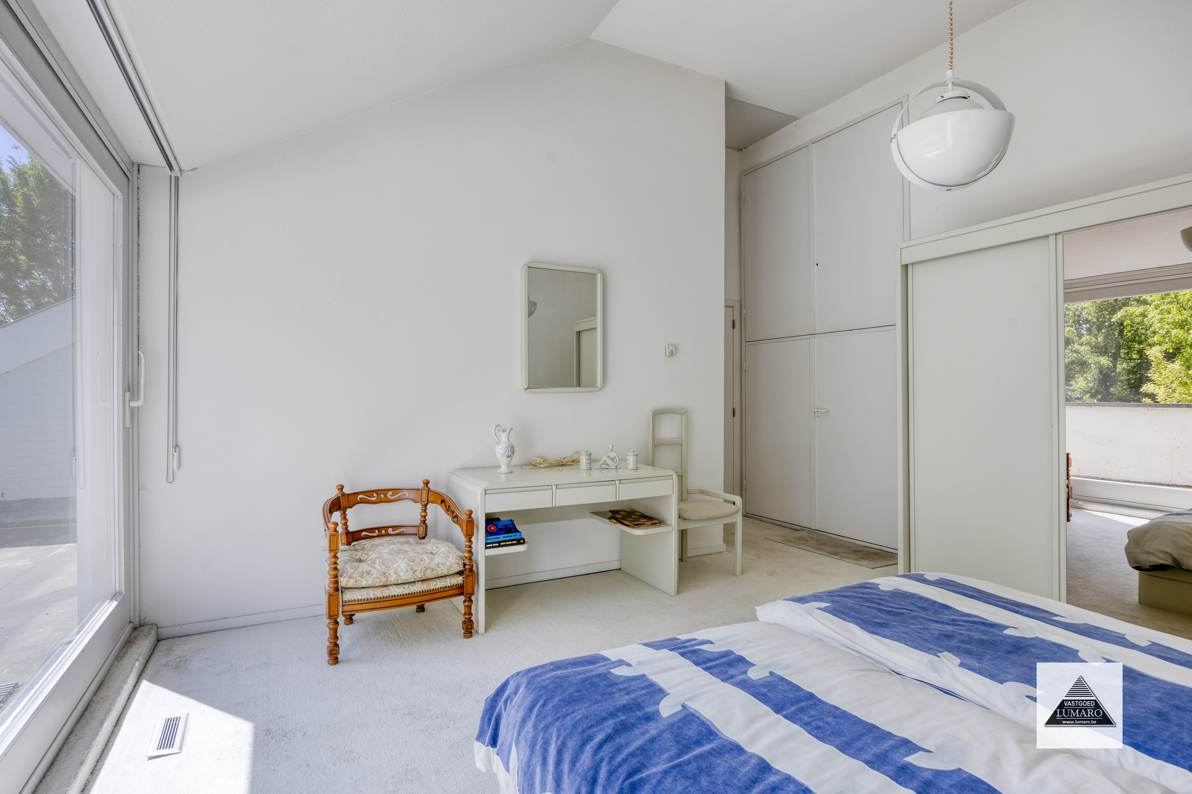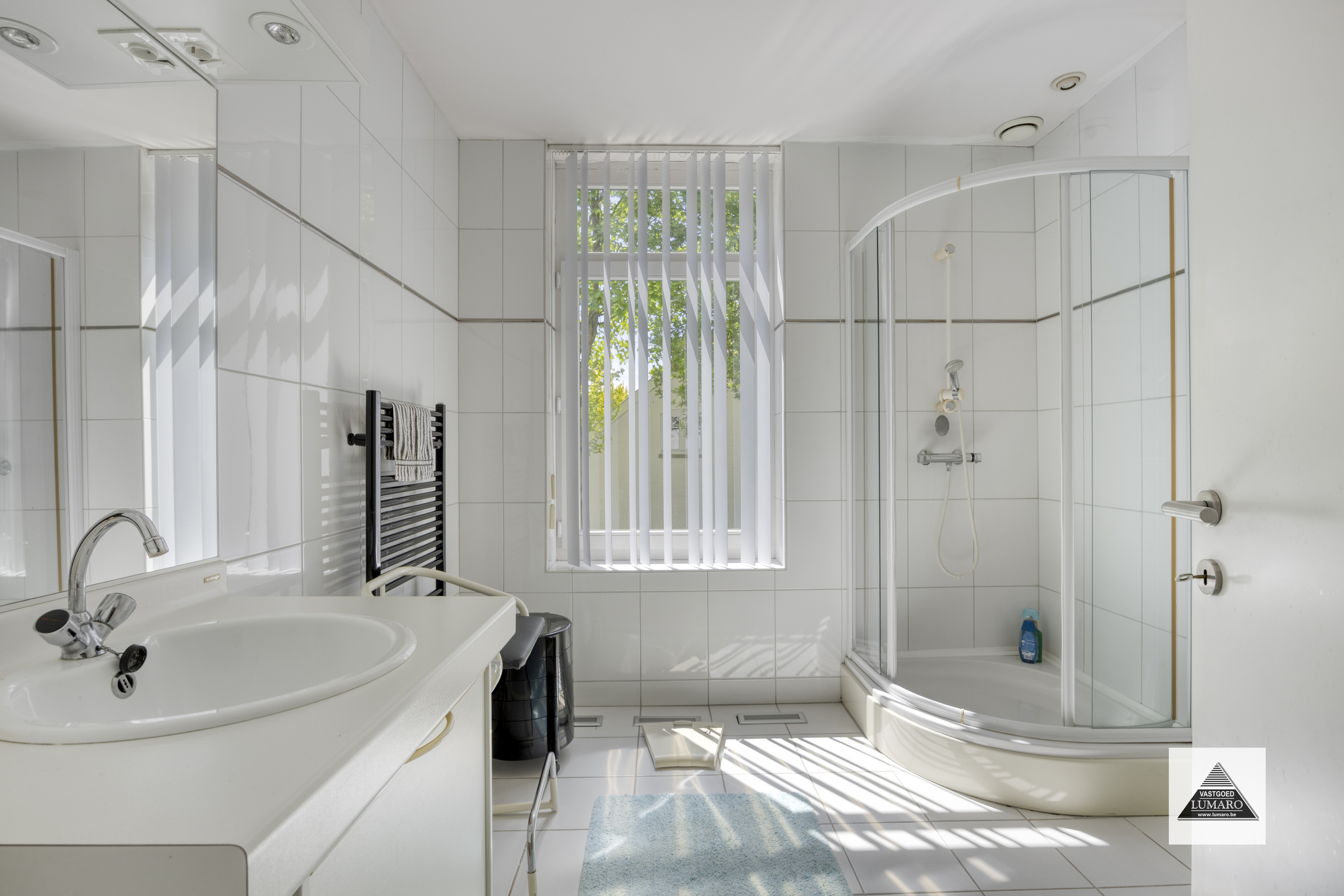 - Slaapkamer 1 met badkamer en dressing: 55 m² - slaapkamer (6,05 m x 4,50 m = 27,23 m²) tapijt – elektrische rolluiken – badkamer (3,80 m x 3,95 m = 15 m²) ingericht met massagebad, massagedouche, 2 lavabo’s, toilet ; dressing ( 3,20 m x 3,95 m = 12,65 m²) kasten