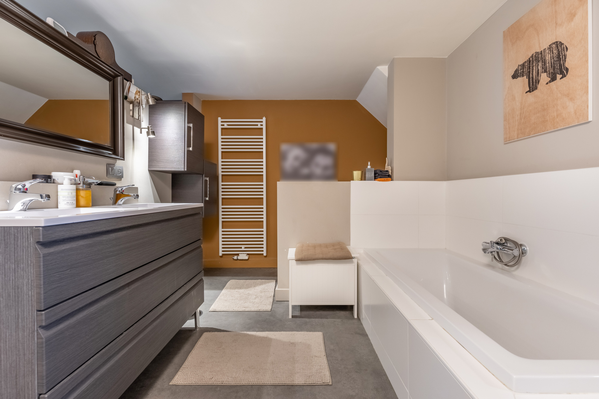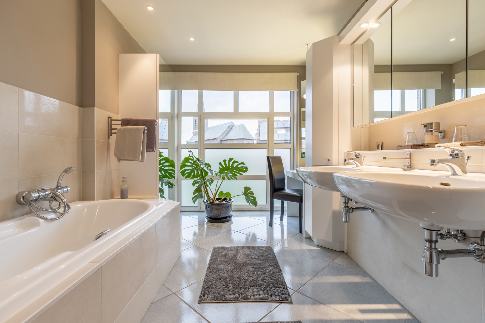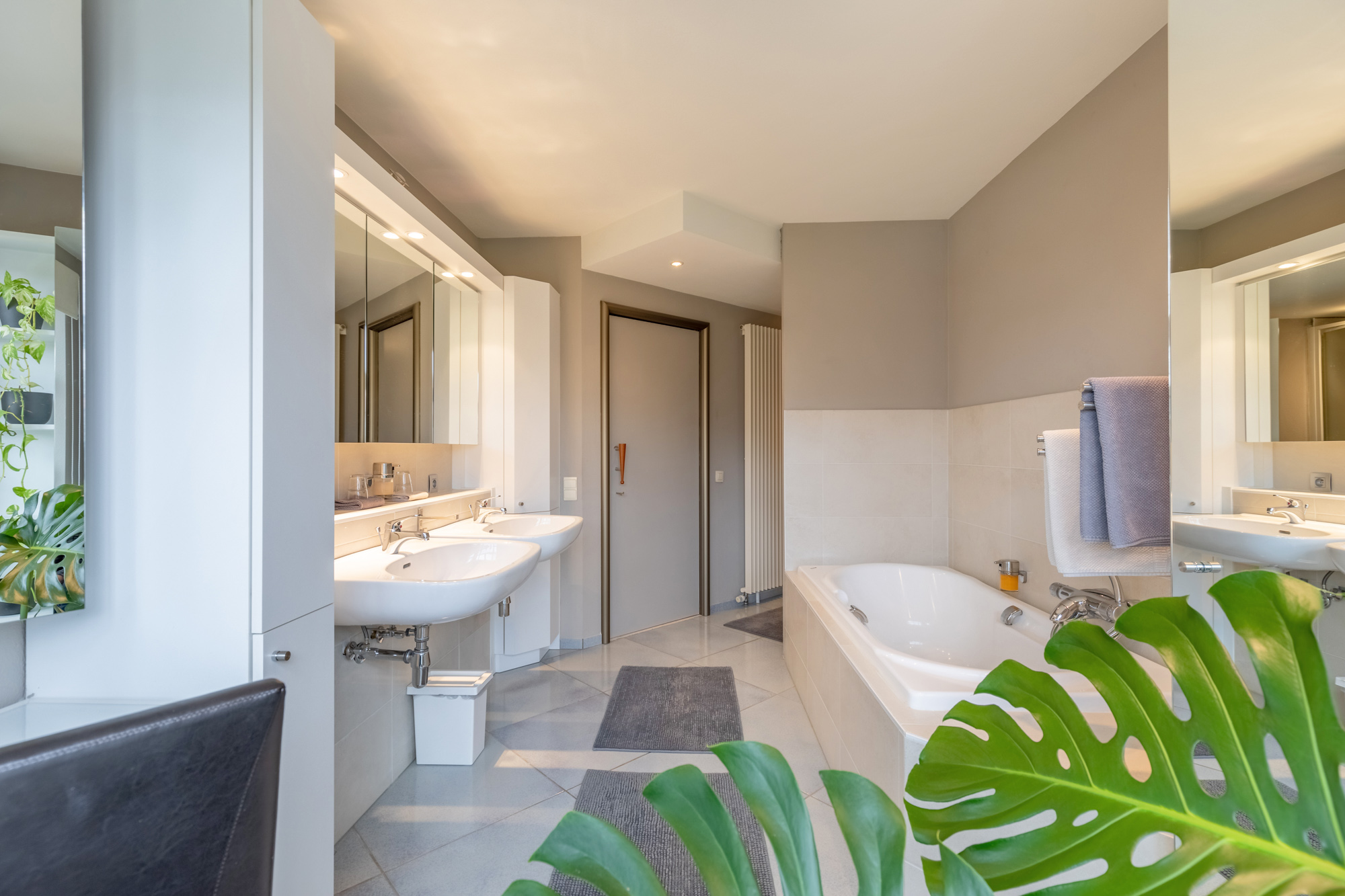- Badkamer: vinylvloer - ingericht met ligbad, 2 lavabo’s, toilet
