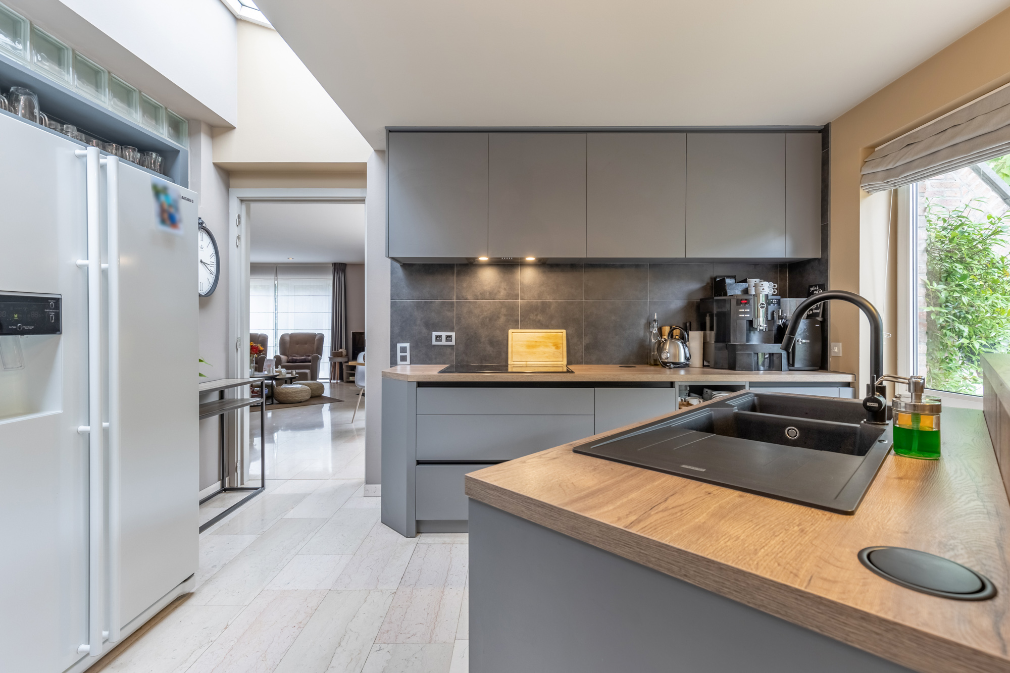 - Nieuwe keuken (Xyla) : (4,30 m x 4,02 m = 18 m²) – tuinkant – screens van ca 5 m x 3 m - volledig ingericht met afwaseiland (kunststof spoeltafels) - bar – kastenwand met heteluchtoven Scholtes en microgolfoven Scholtes – vaatwasser AEG – Amerikaanse koelkast Samsung - sierradiator – keramisch fornuis, toegang naar de tuin