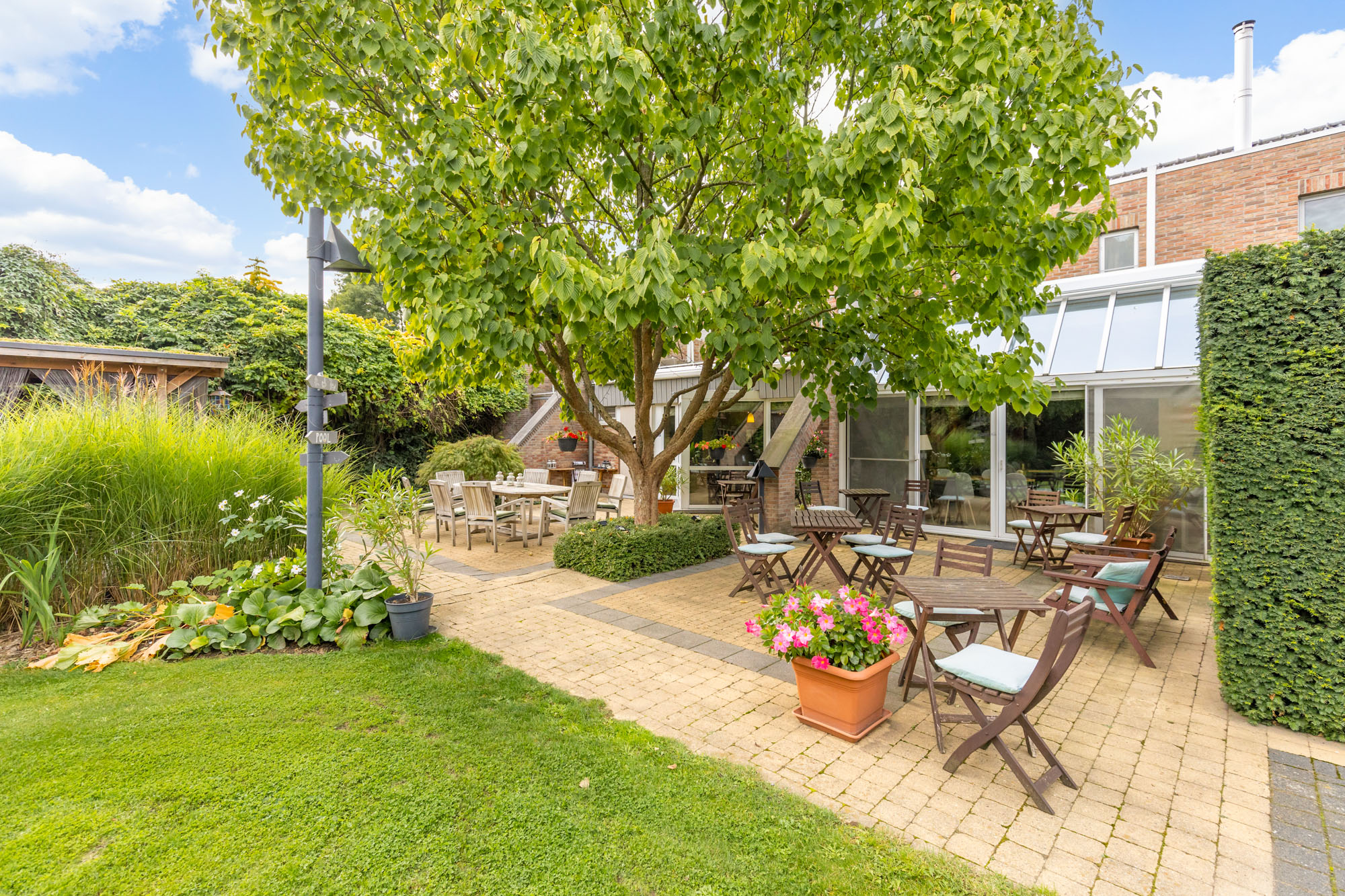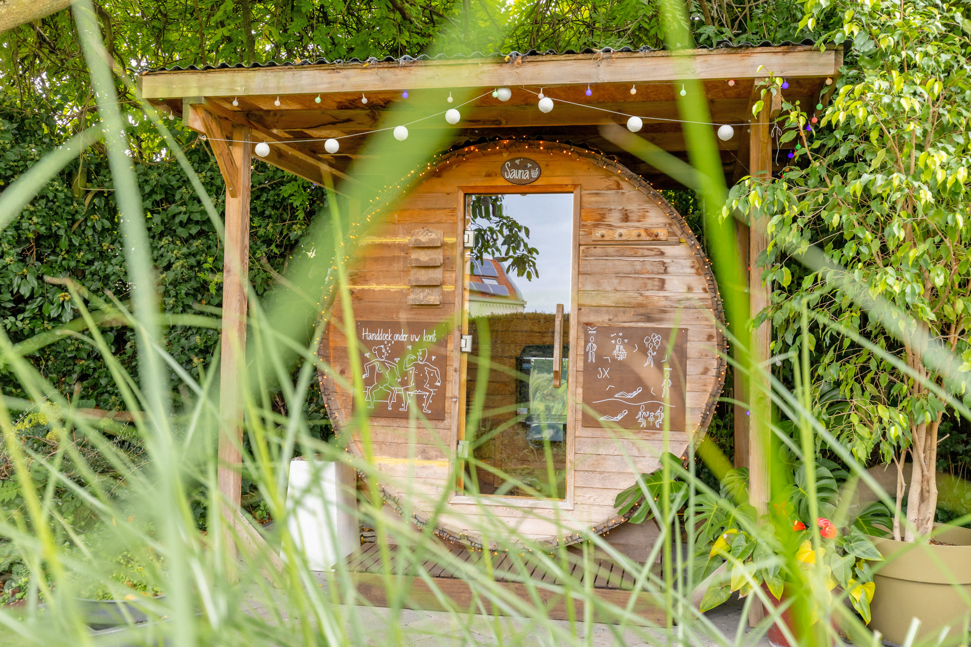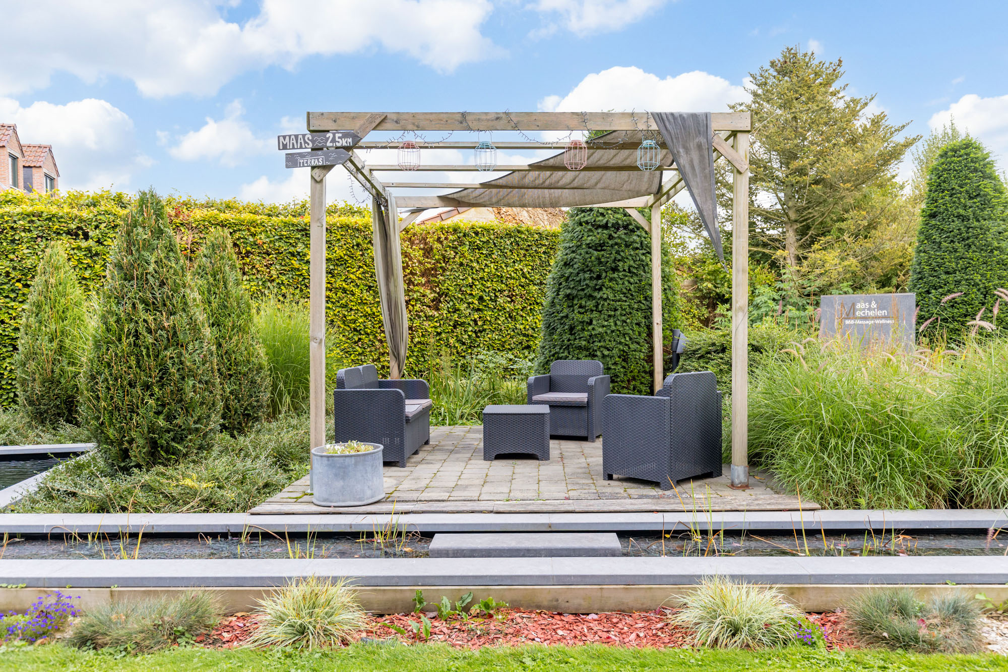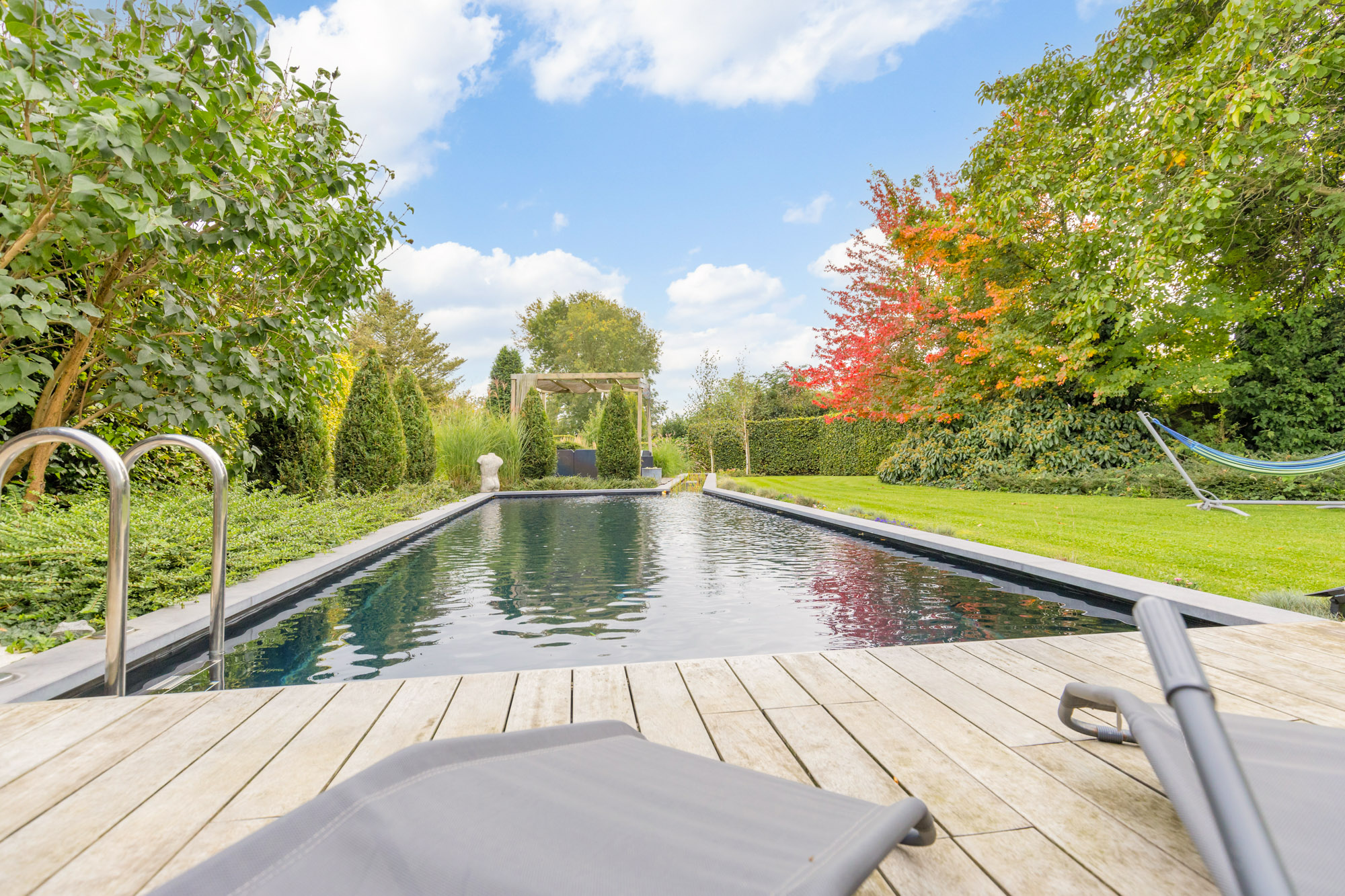 - Ingericht met terrassen, barrel-sauna, jacuzzi, zwembad, vijvertje