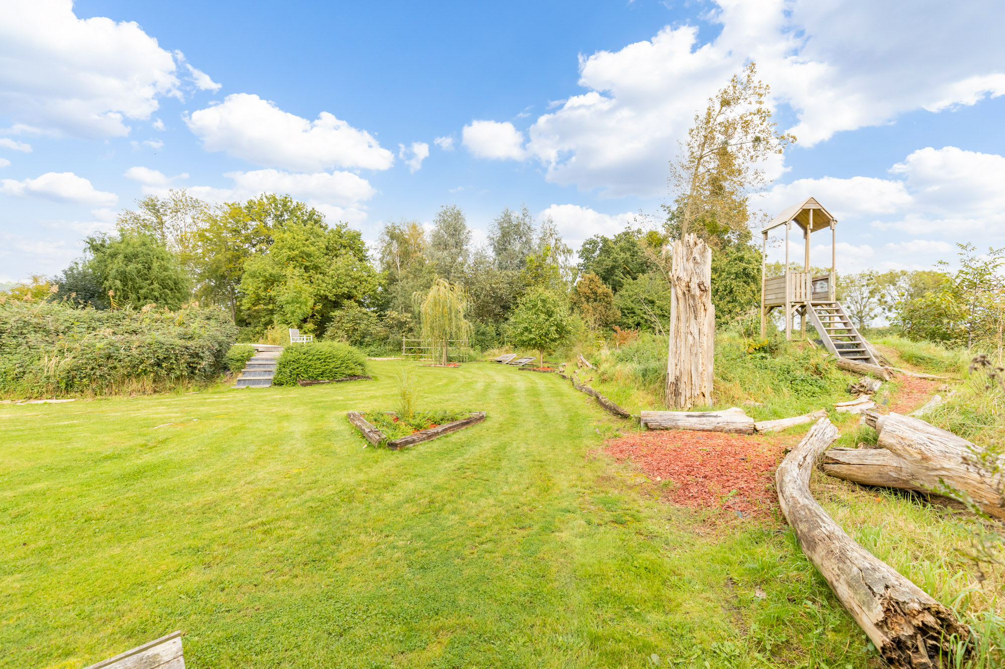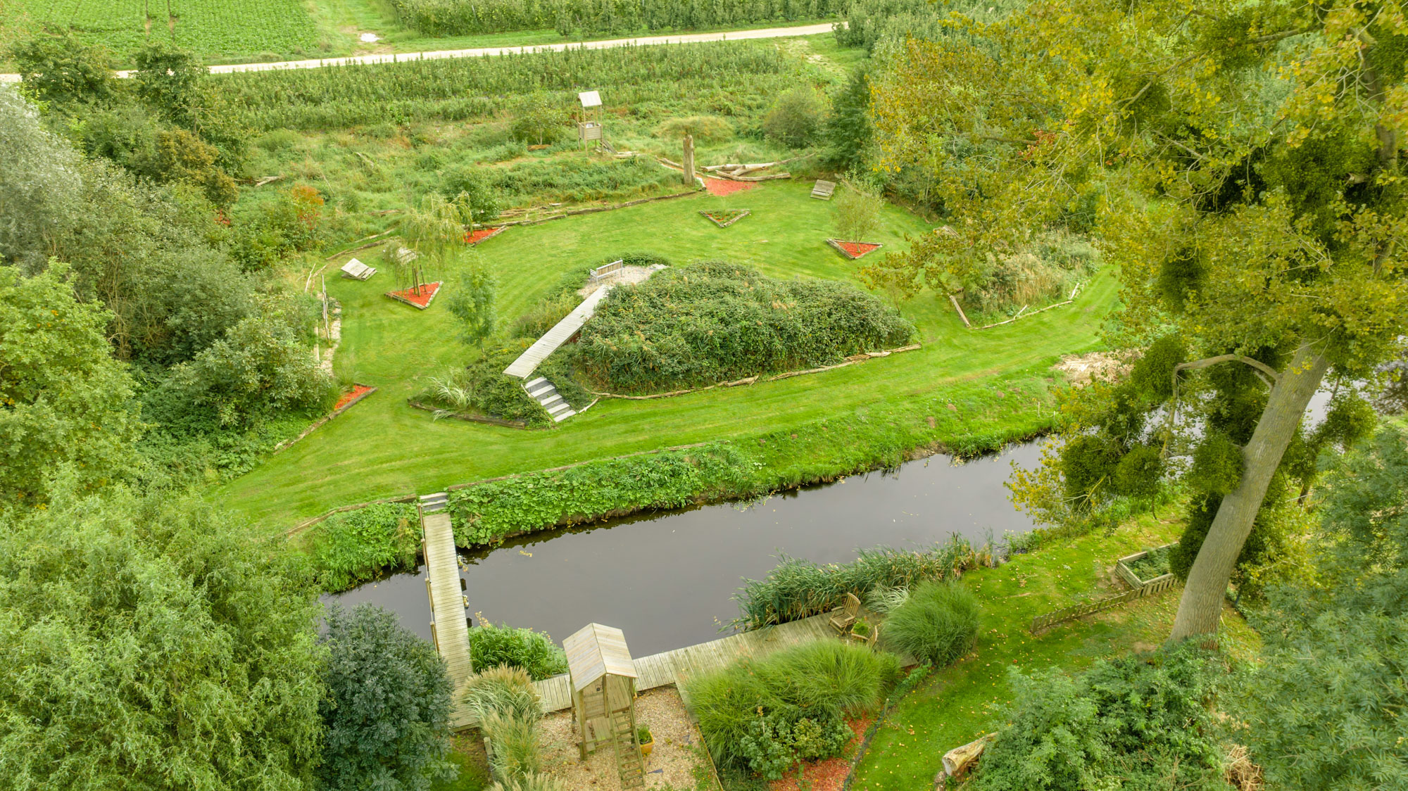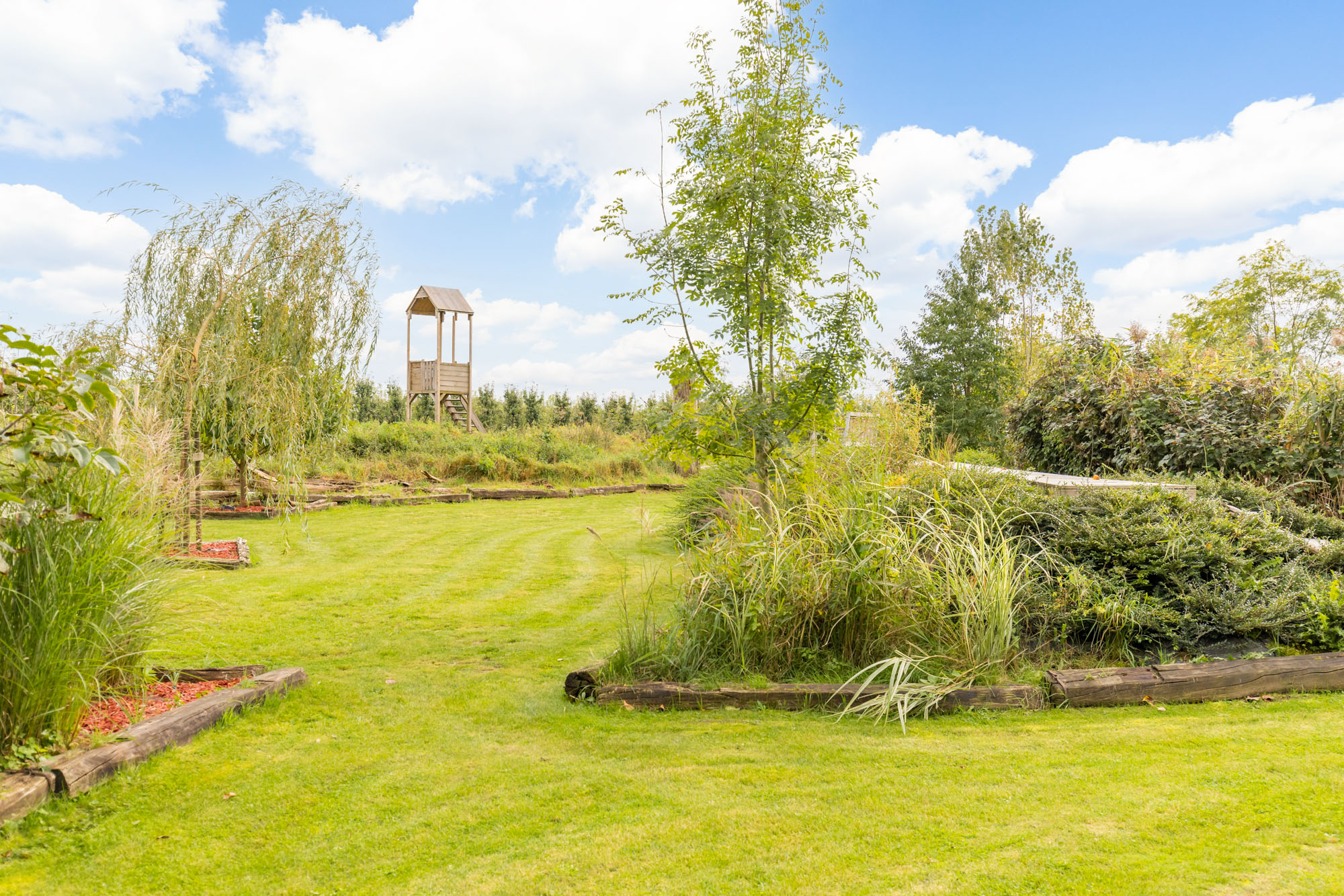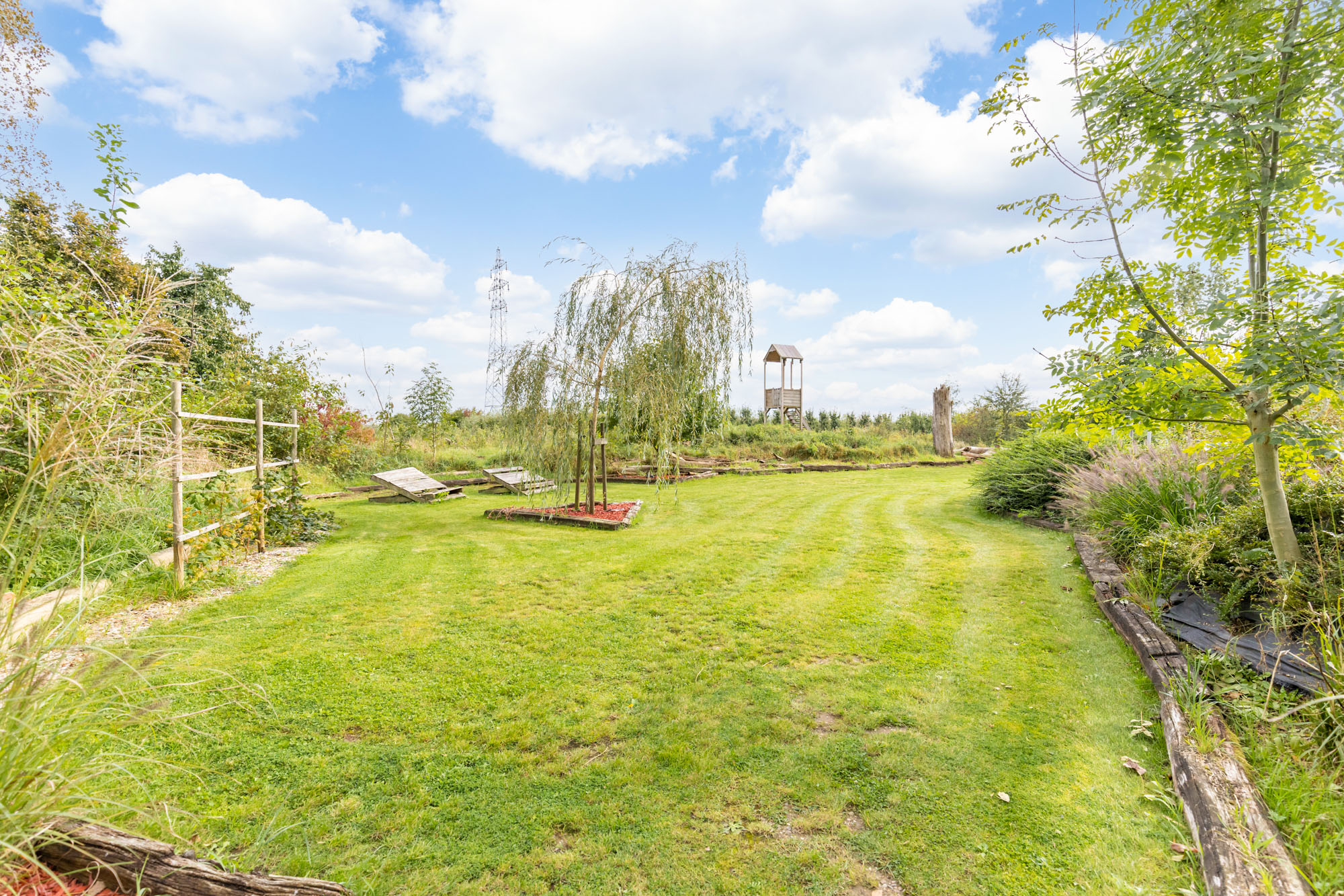 Wat de waterpartijen betreft : zwembad (10 m x 4 m en 1,40 m diep), vijver (vissen), natuurlijk zwemvijver. De ganzen hebben hun eigen domein en ze zwemmen in de Ziepbeek die door de eigendom passeert. Een houten brug brengt ons naar het verste deel van de tuin. Hier is groen en beplanting. De houten uitkijktoren staat op de achterste perceelsgrens.