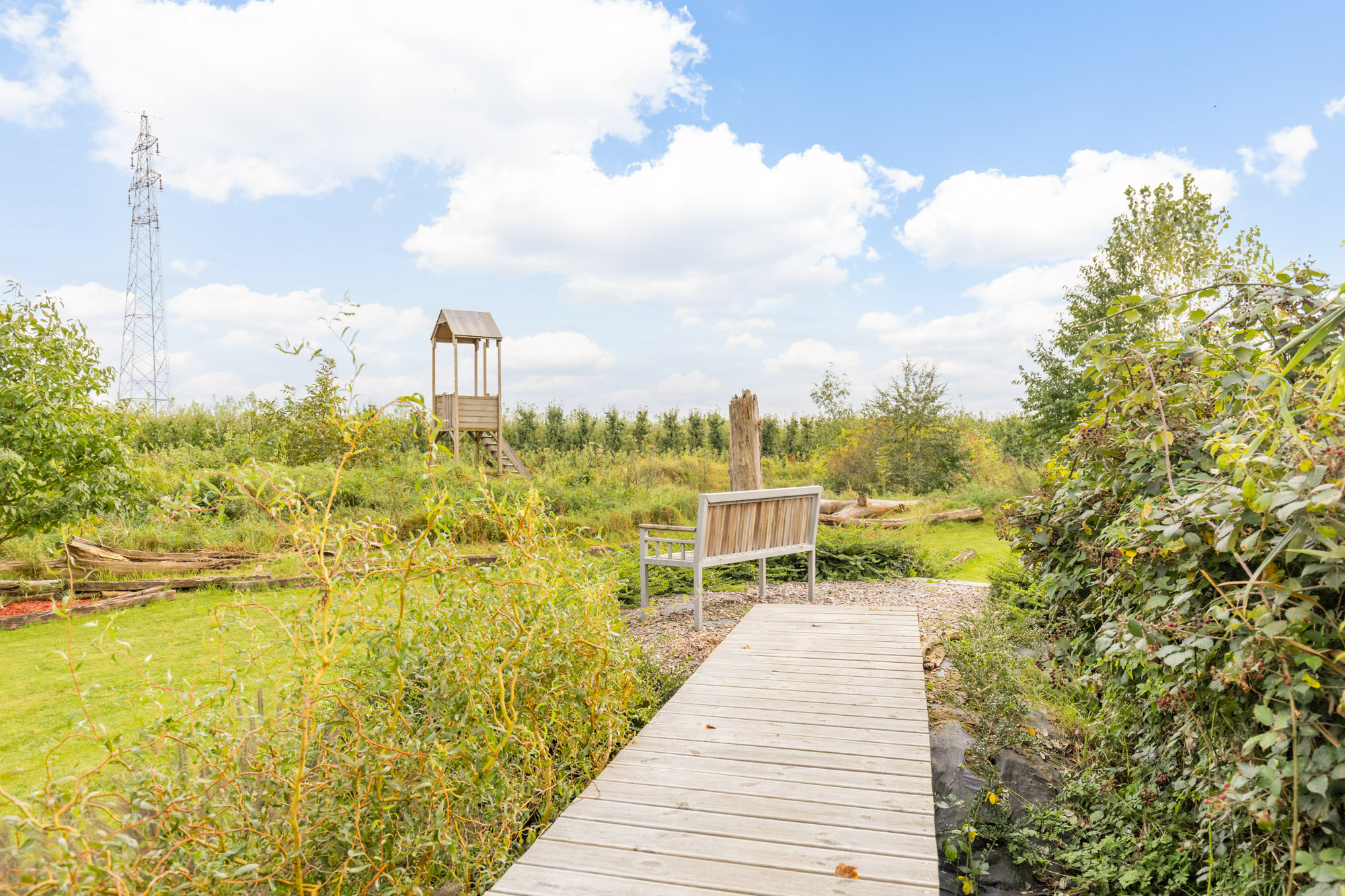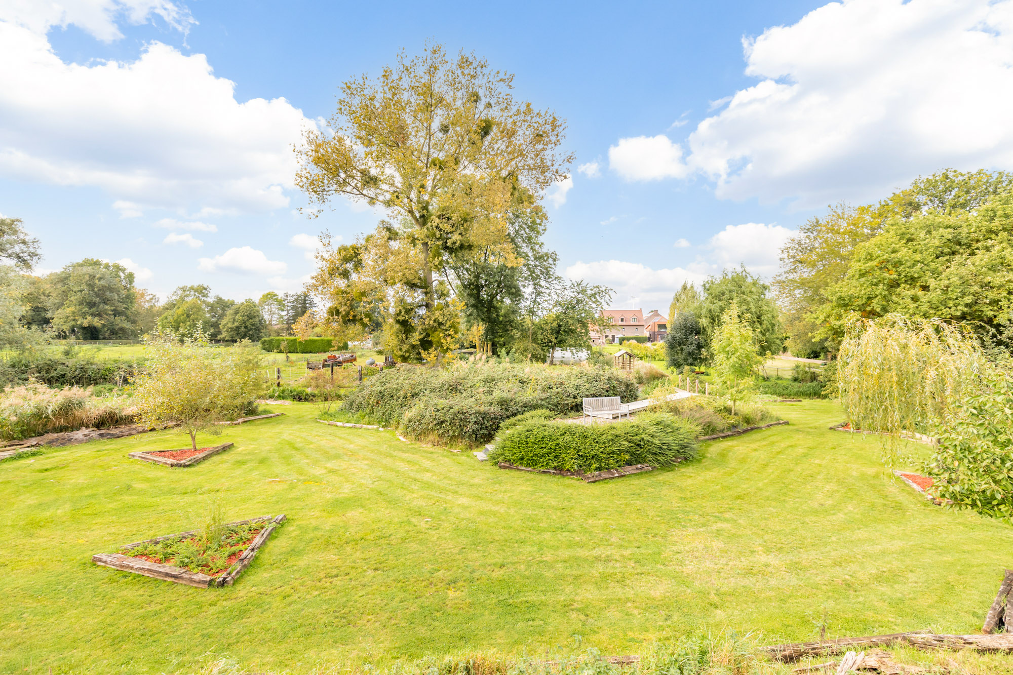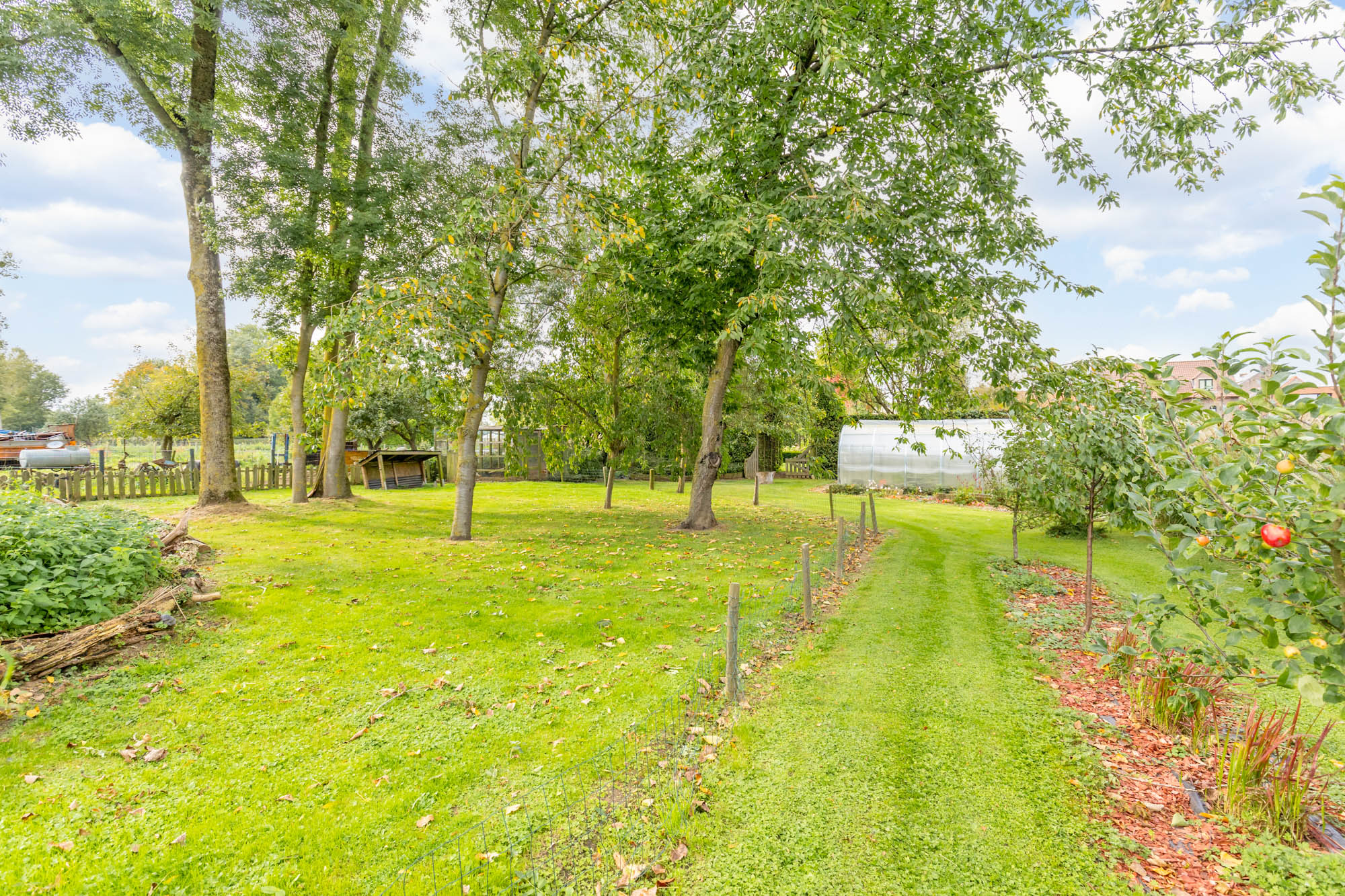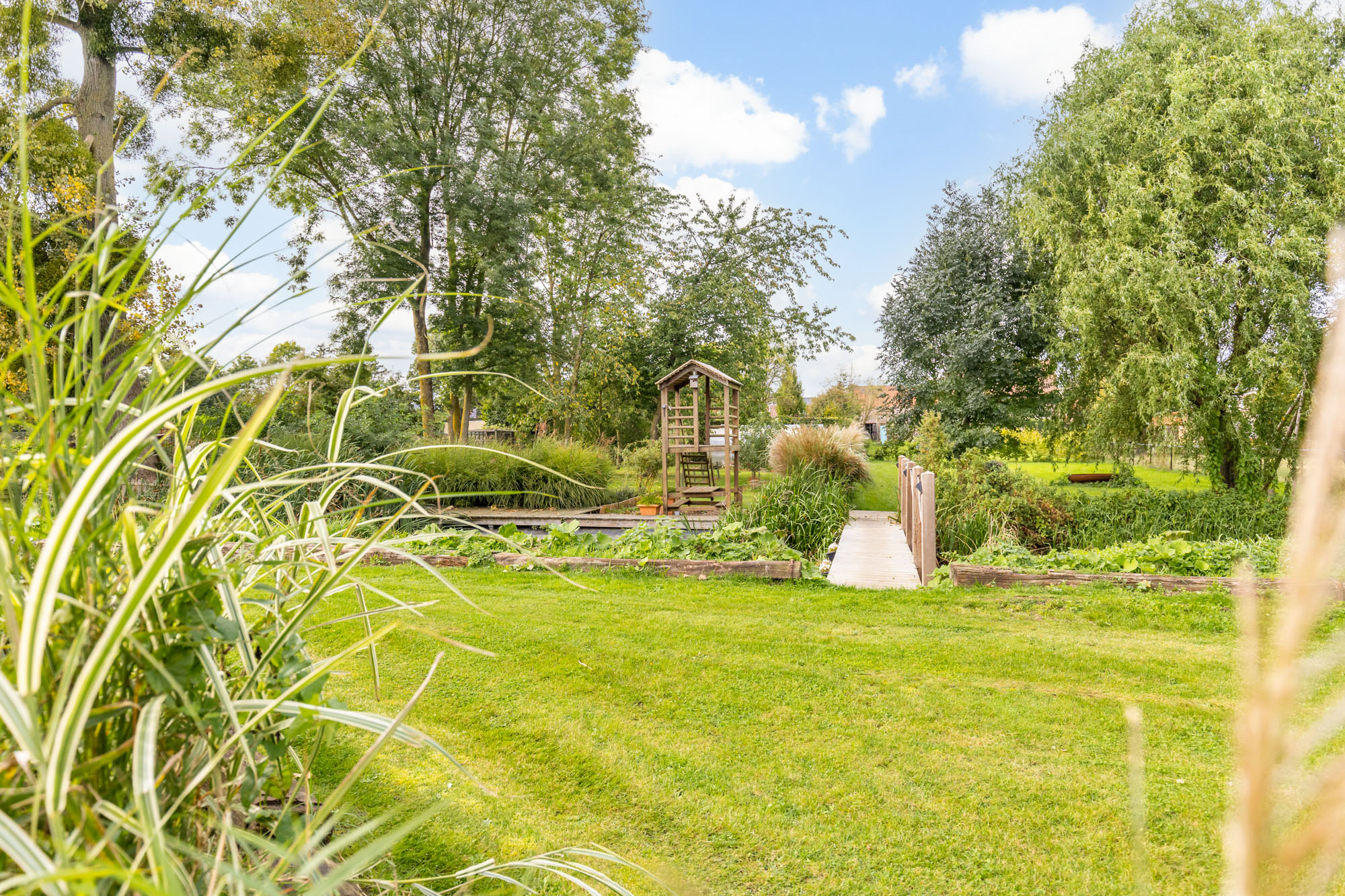 Wat de waterpartijen betreft : zwembad (10 m x 4 m en 1,40 m diep), vijver (vissen), natuurlijk zwemvijver. De ganzen hebben hun eigen domein en ze zwemmen in de Ziepbeek die door de eigendom passeert. Een houten brug brengt ons naar het verste deel van de tuin. Hier is groen en beplanting. De houten uitkijktoren staat op de achterste perceelsgrens.