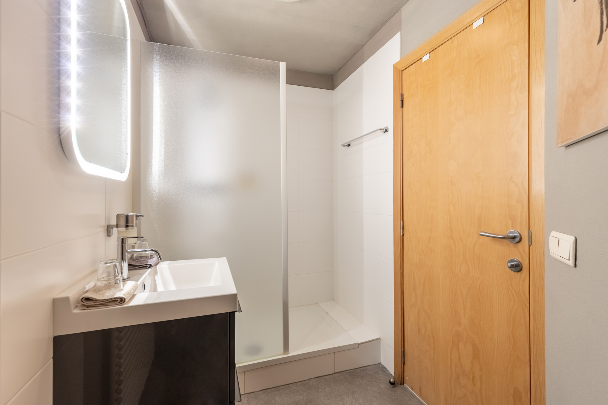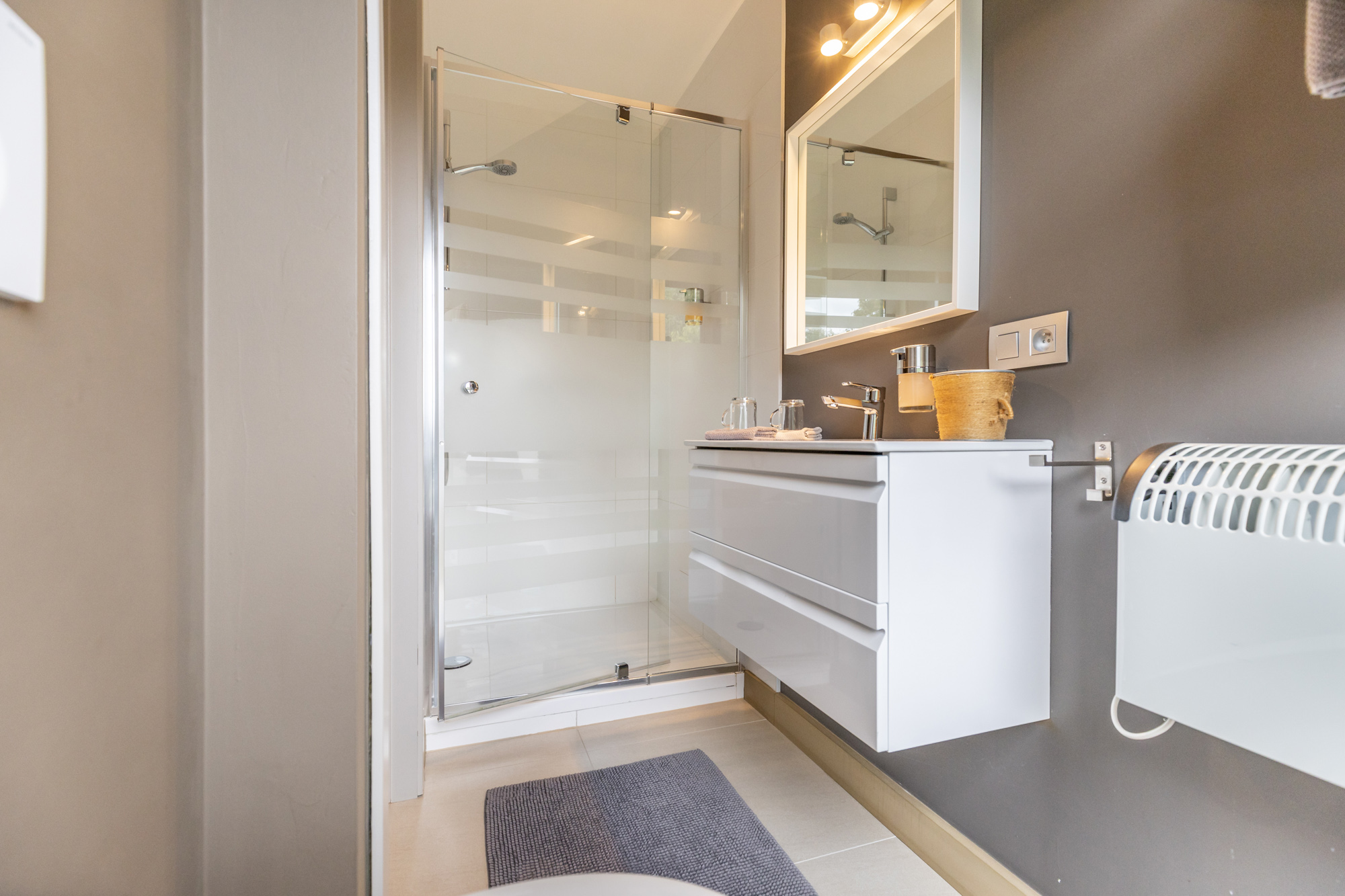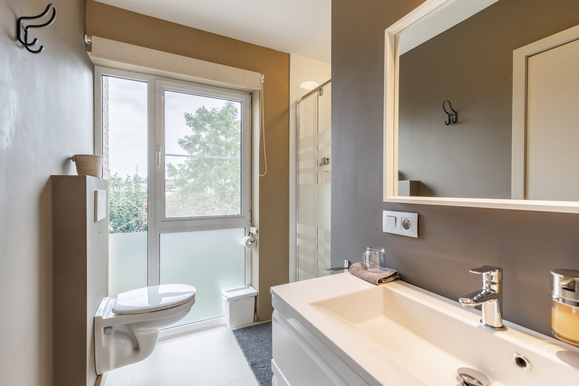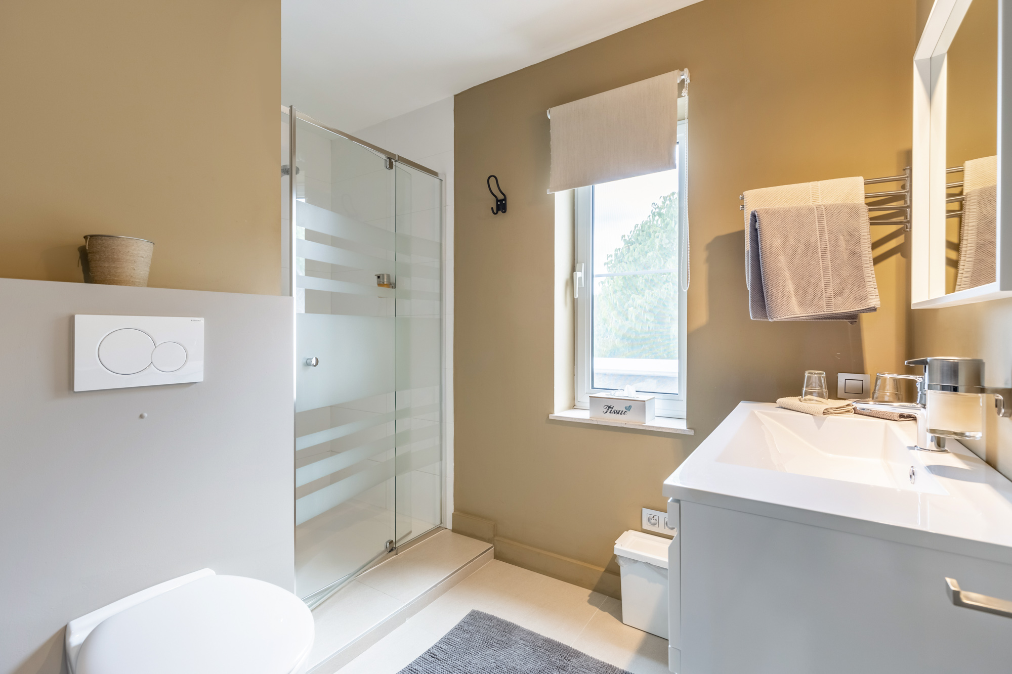 - Kamer 2 “Mechelen” : 18 m², badkamer ingericht met douche, lavabo, toilet – zicht op de tuin