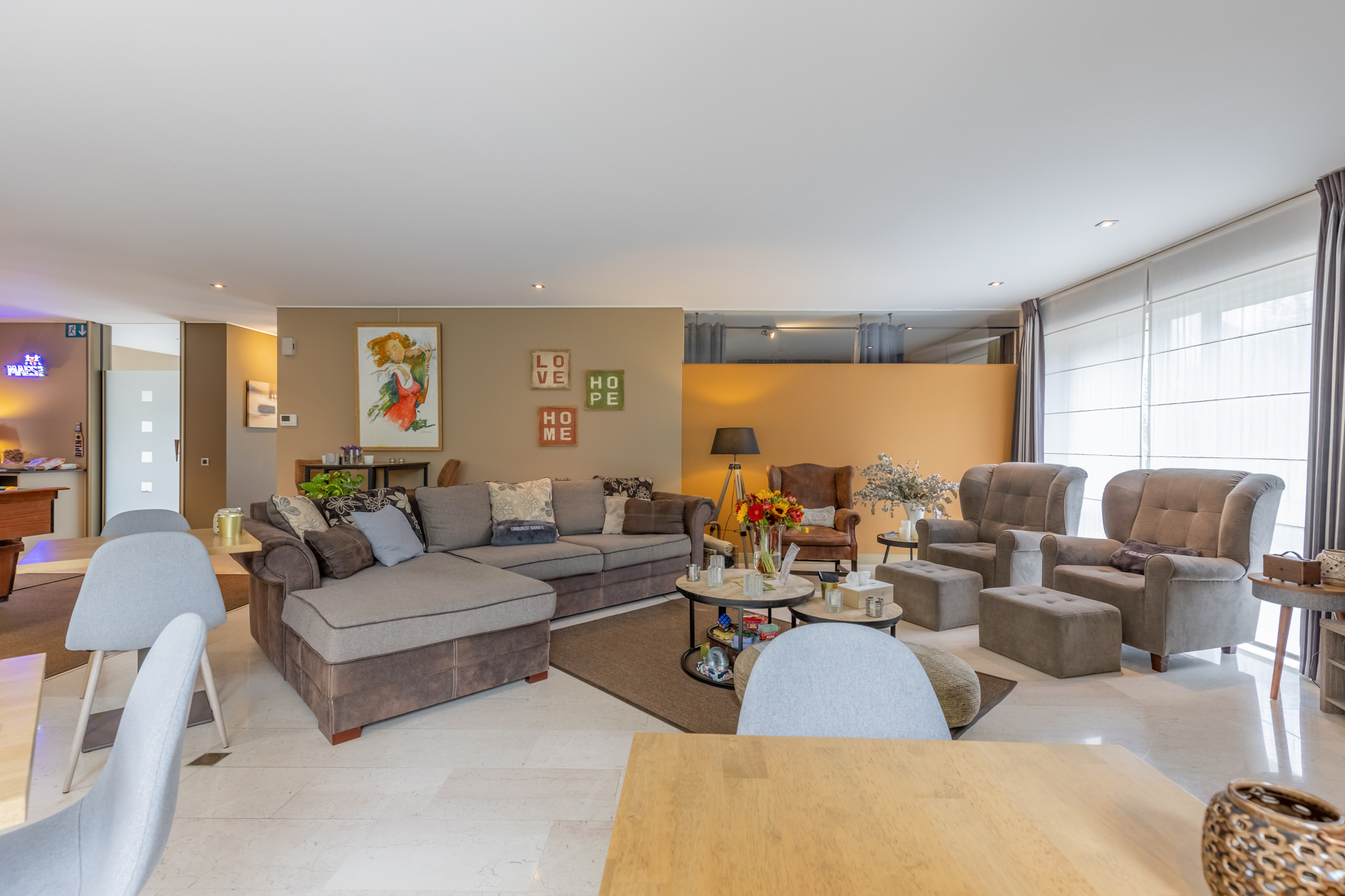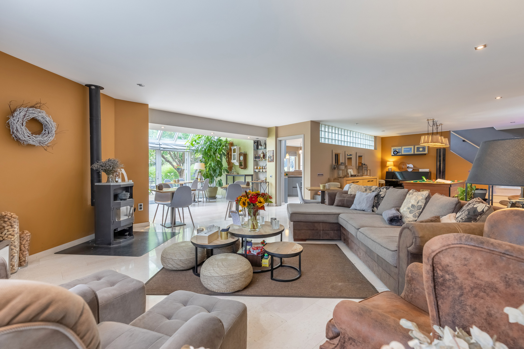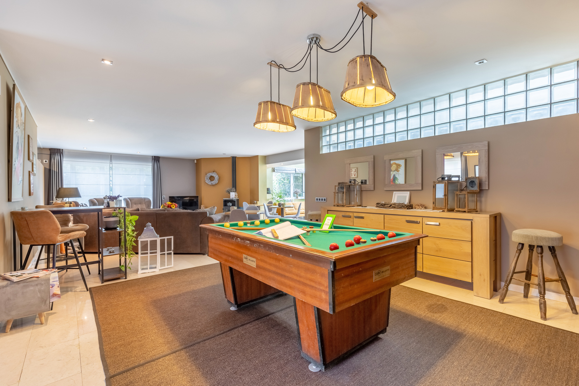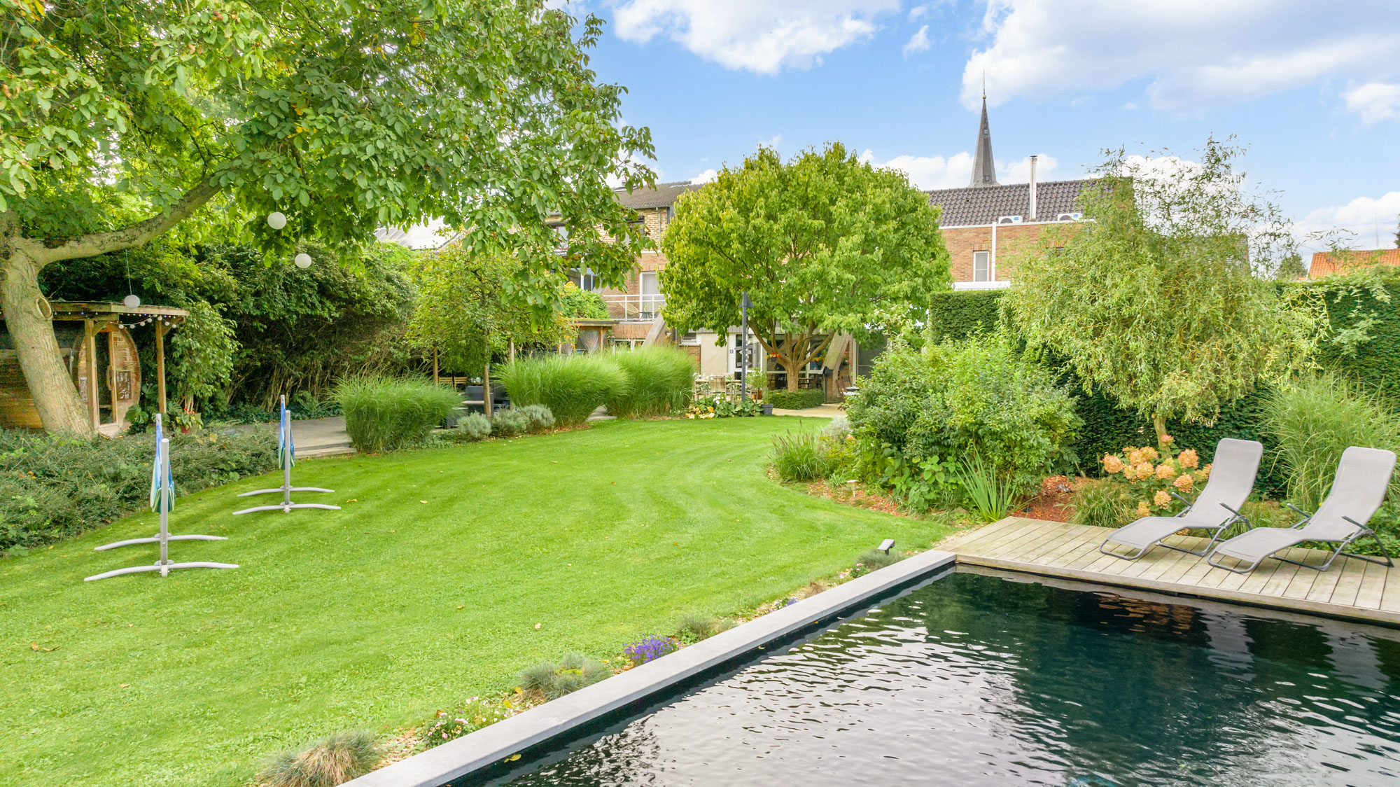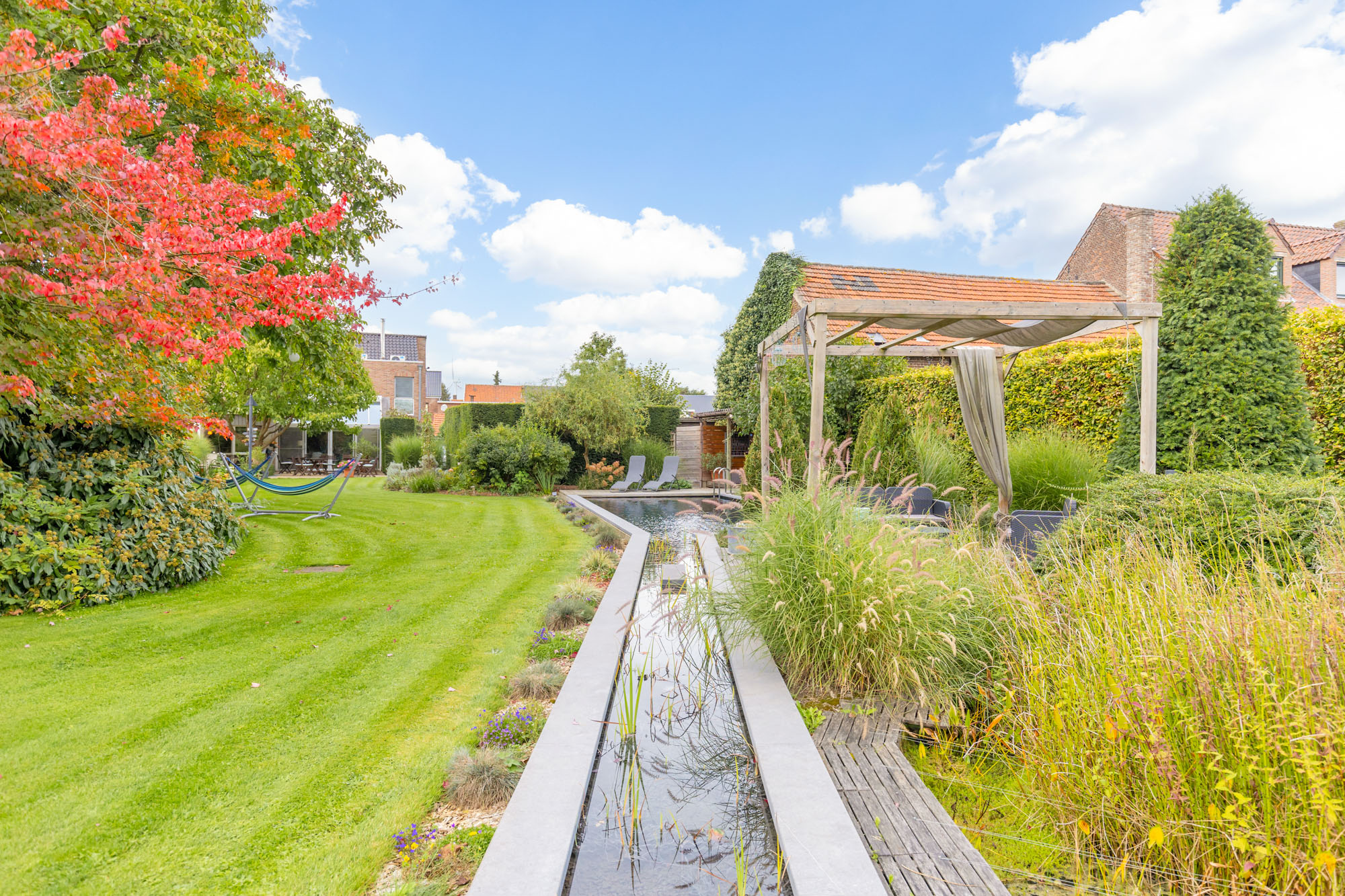 De charmante tuin, zwembad, jacuzzi, buitendouche en barrel-sauna (ton- sauna) met Harvia kachel, maken het buitengebied nóg aangenamer. De eigendom is volledig omheind. Een volgroeide hoge beukenhaag van 2,50 m hoog biedt volledige privacy. Waterpartijen, terrassen, plantenzones wisselen elkaar af en geven de ruime tuin een speciaal cachet.