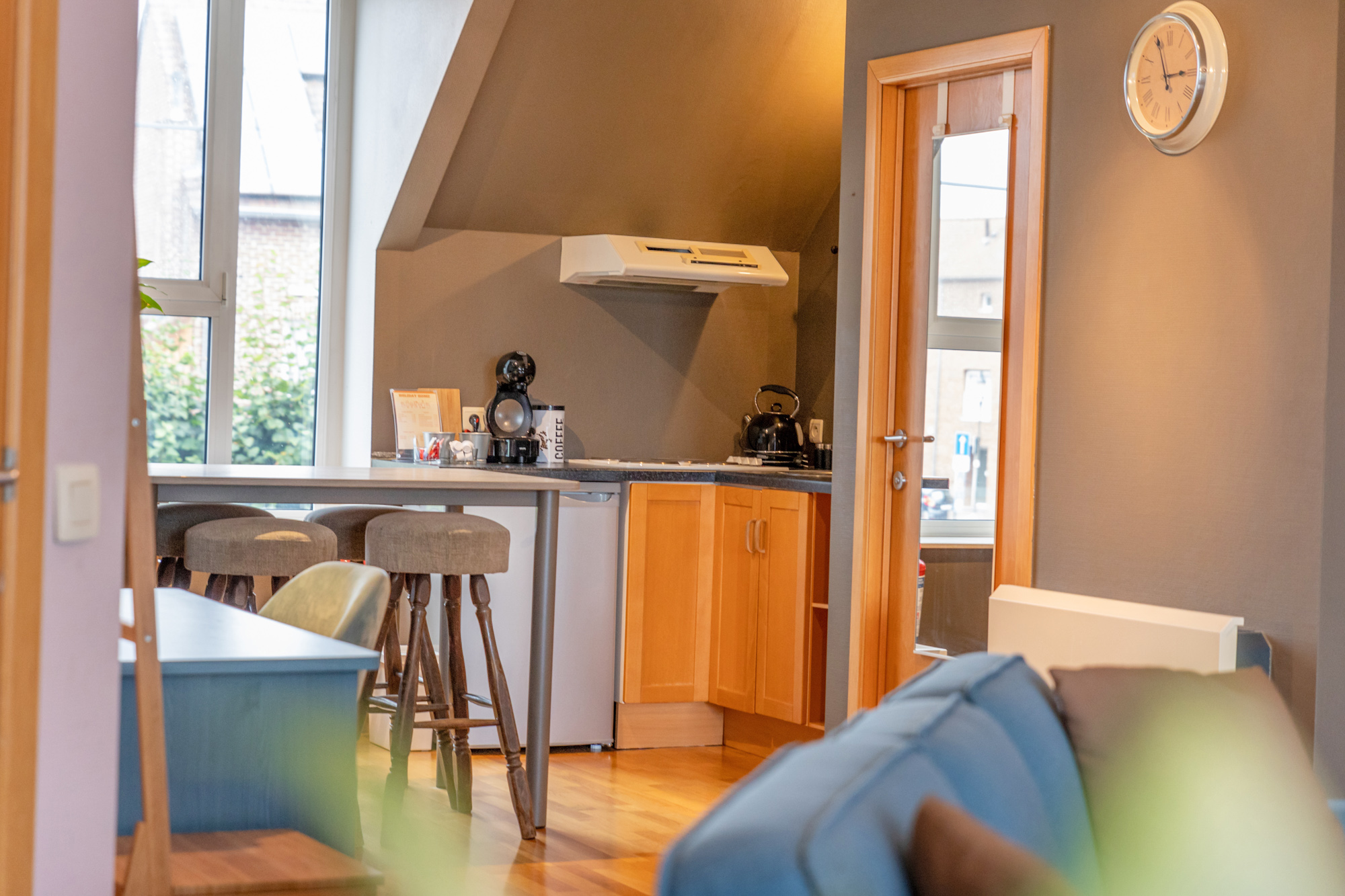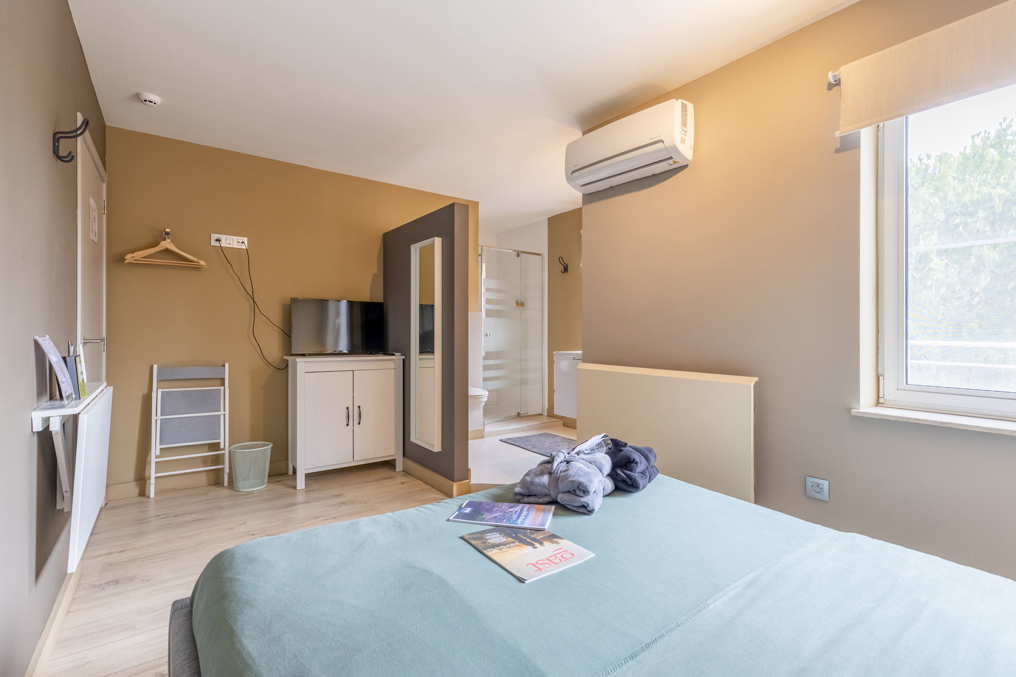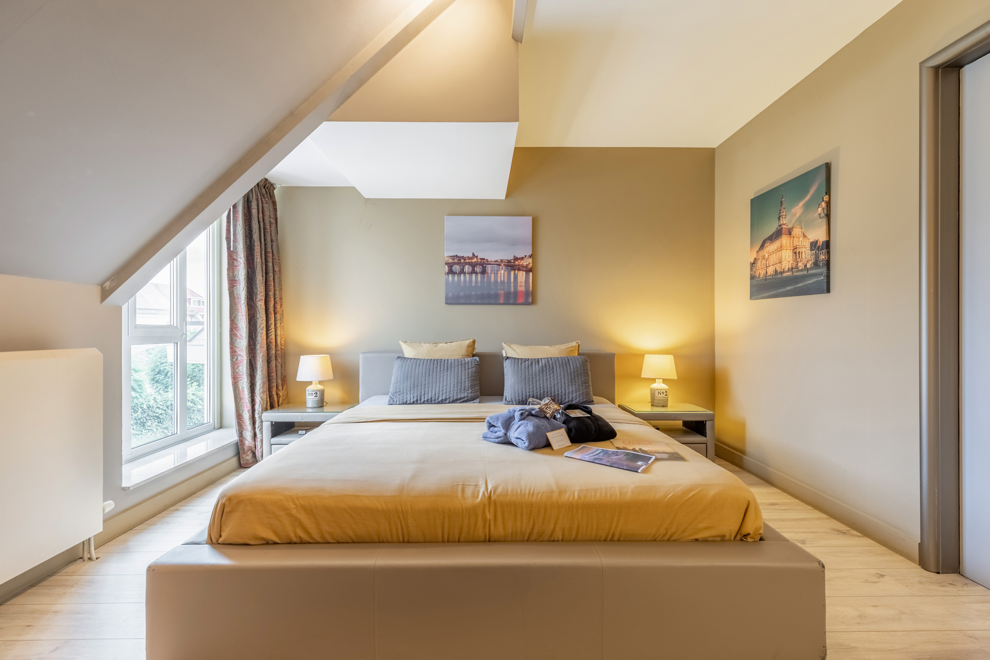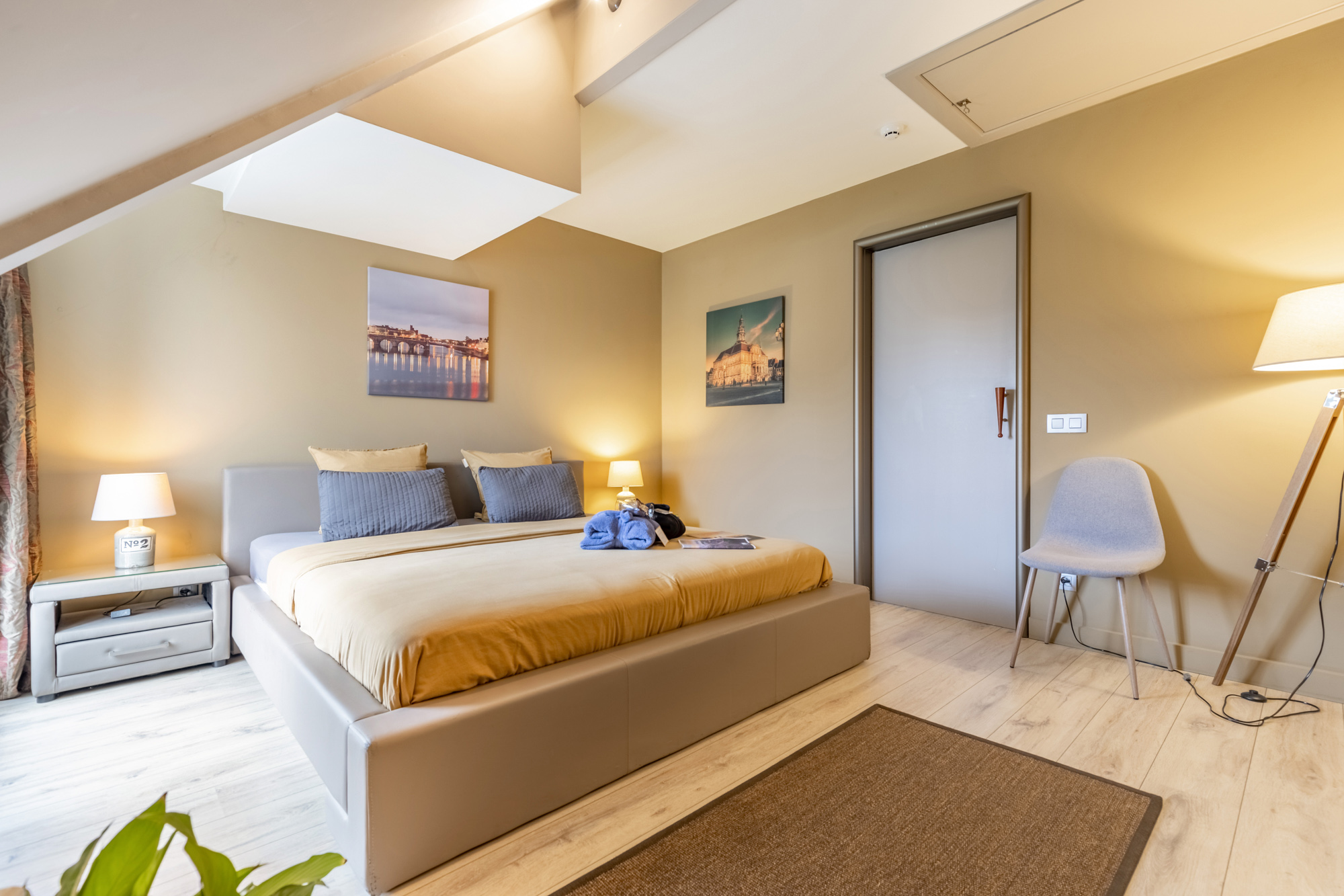 - Kamer 4 (suite) “Maastricht” : 35 m², slaapkamer met dubbel bed + slaapzetel (1 of 2 pers.), badkamer ingericht met ligbad en douche, 2 lavabo’s en toilet
