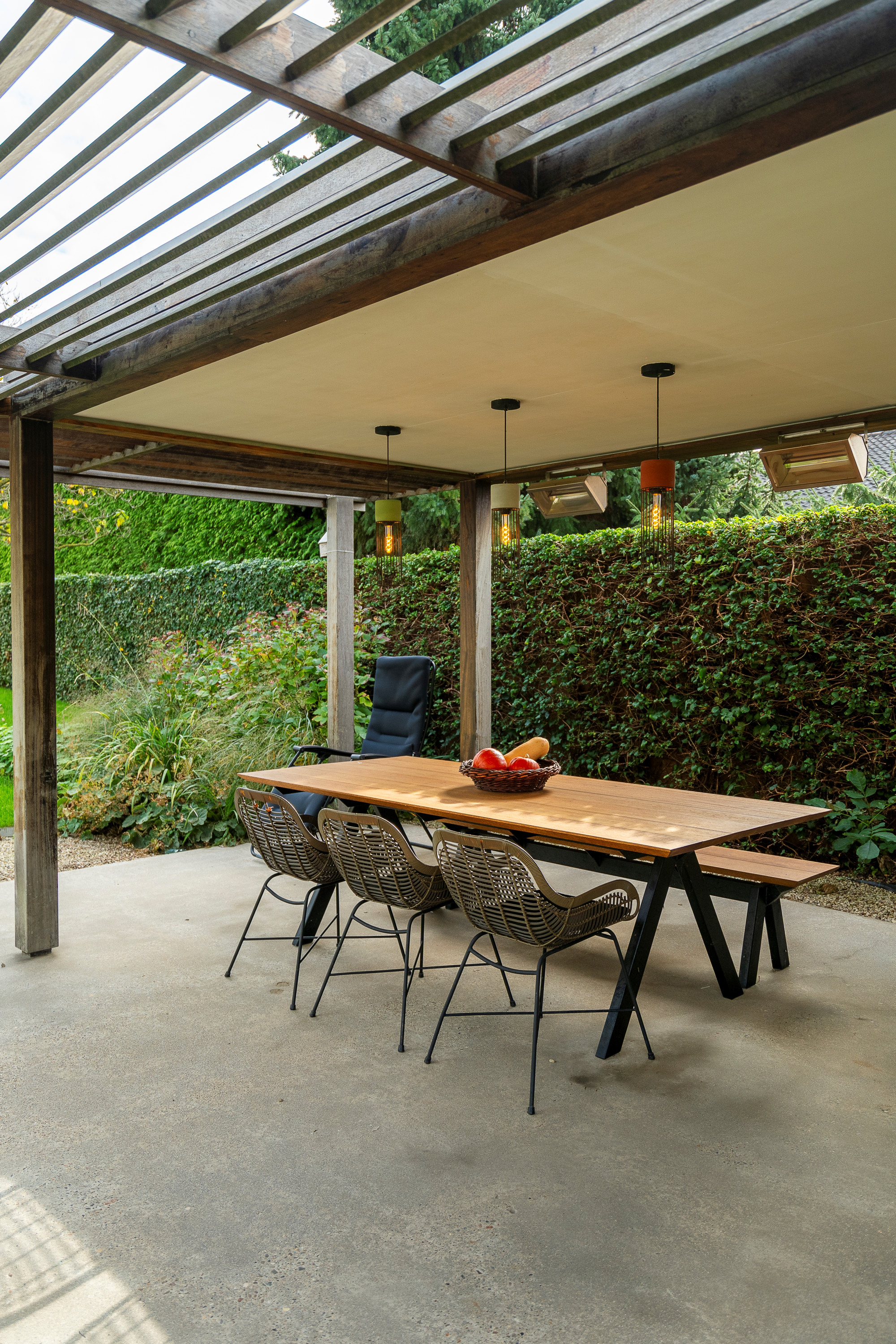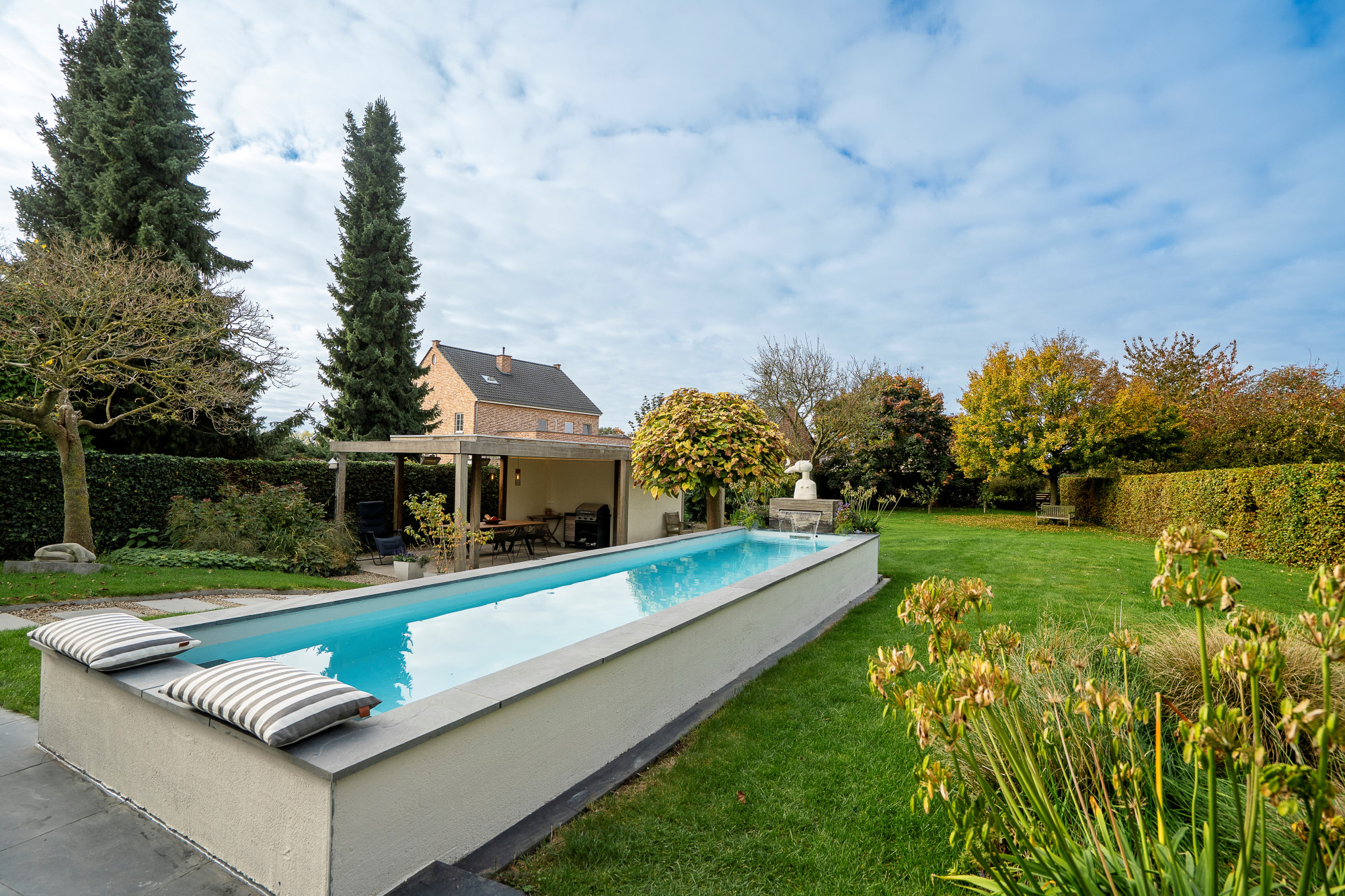 The west-facing, fully landscaped garden is completely fenced and was designed with tranquility and privacy in mind. It offers a raised terrace adjacent to the living area, a heated swimming pool with filter system, and a garden shed with an additional covered terrace with heating elements.
