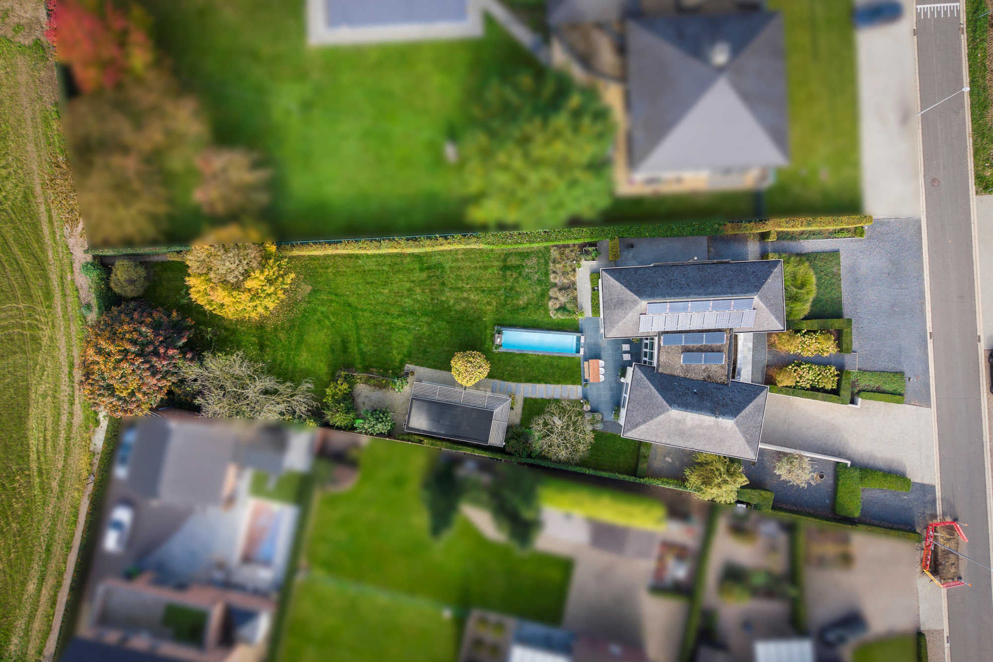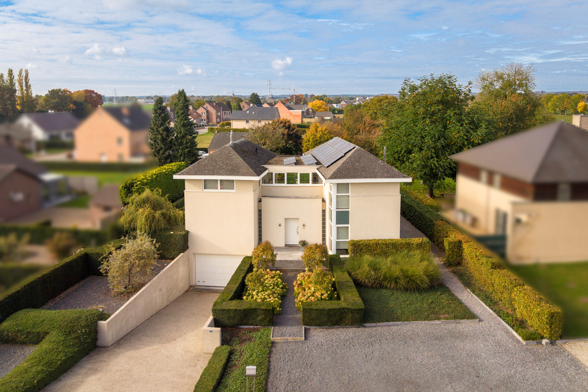 This sleek and timeless villa is located on a beautiful 1,439 m² plot in picturesque Leut (Maasmechelen). The house (1999) was designed with an eye for light, space, and living comfort: the impressive loft with large windows connects the dining area with two cozy sitting areas, separated by a stylish gas fireplace. A lot of attention was also paid to energy efficiency, and the house is very well insulated, all windows are fitted with HR glazing, and 19 solar panels have been installed. The garden is fully landscaped and is a real oasis of calm, with several terraces, an elongated swimming pool, and plenty of privacy. Thanks to the spacious office on the ground floor, this villa is also ideal for those who want to combine living with a freelance career or working from home.
