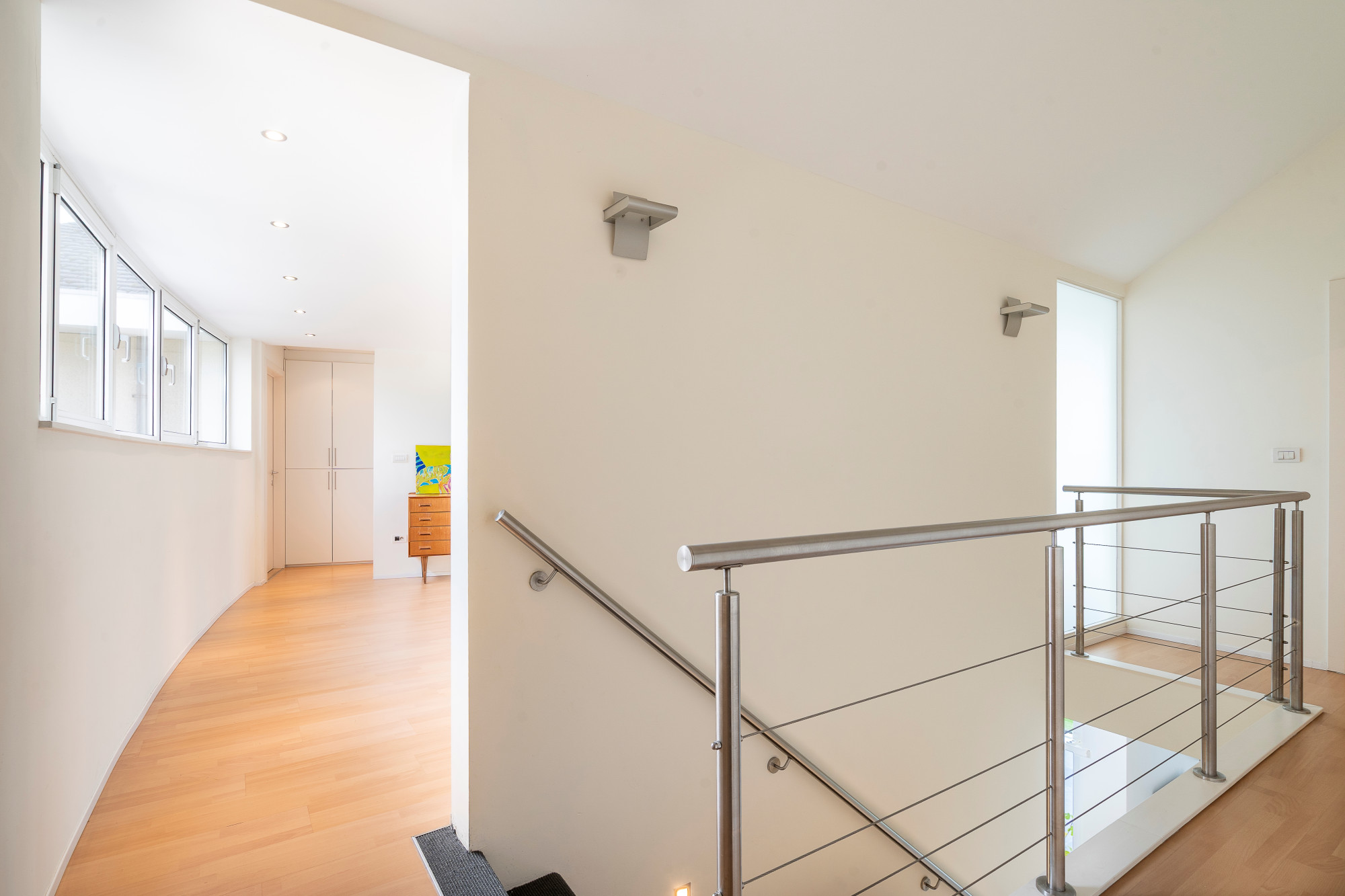 On the first floor, a spacious landing with a mezzanine connects all the rooms and creates an open, airy atmosphere. Here you will find the master bedroom with a private dressing room and en-suite bathroom. On the other side of the landing are three more full bedrooms and a second bathroom.