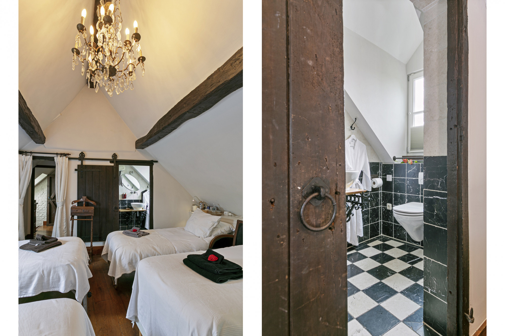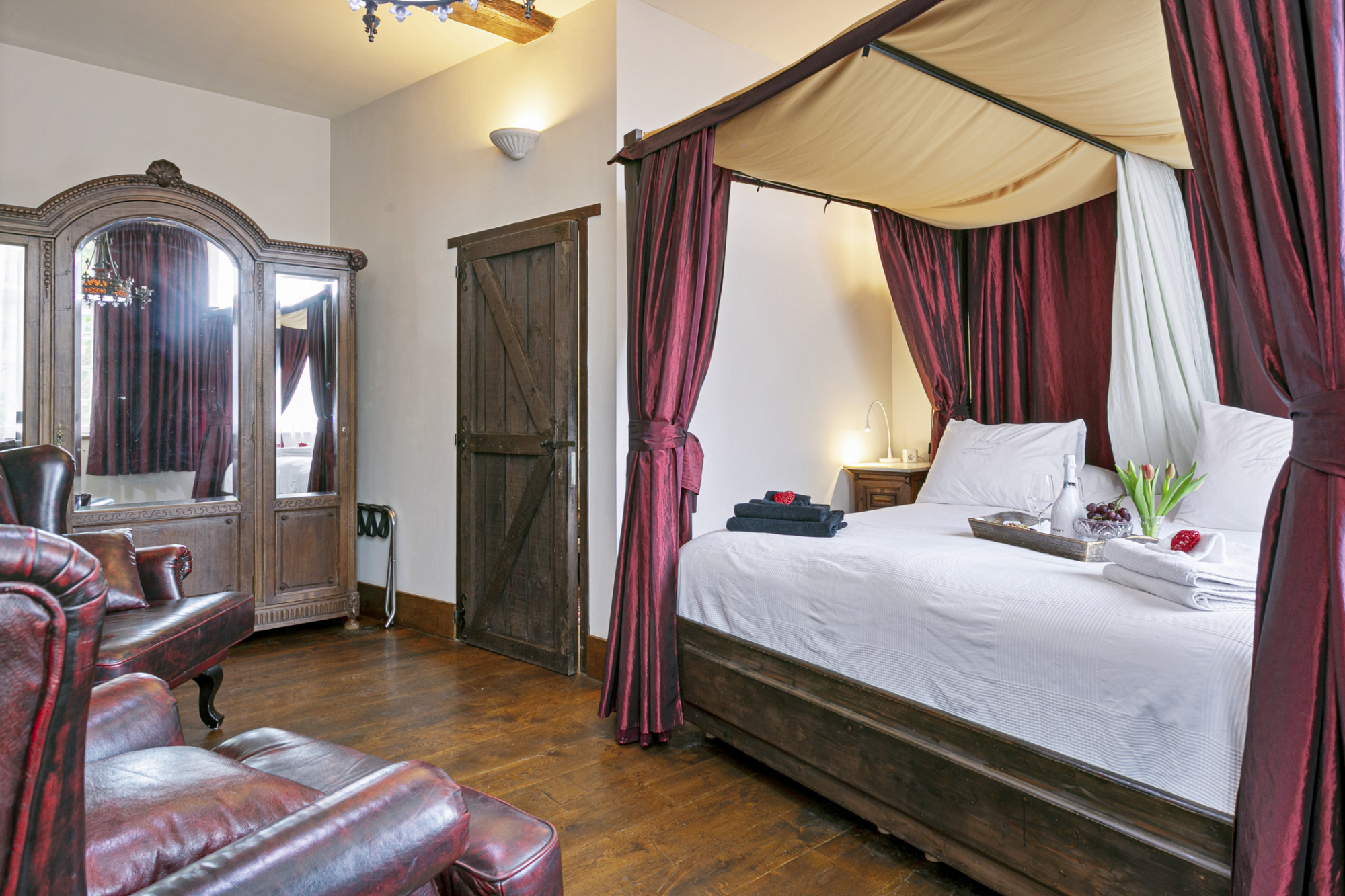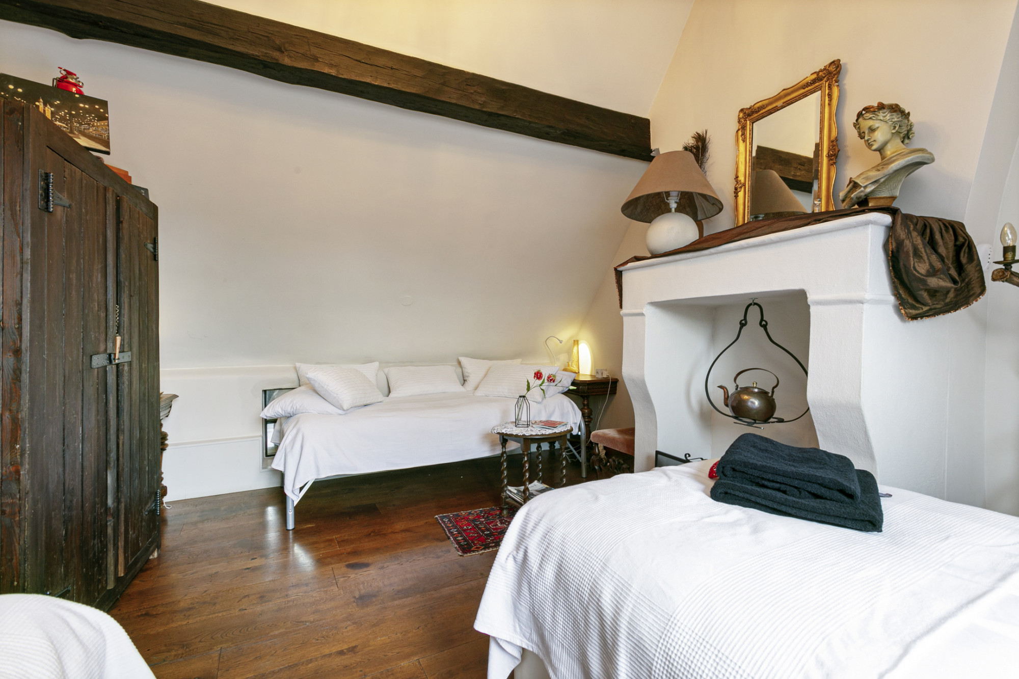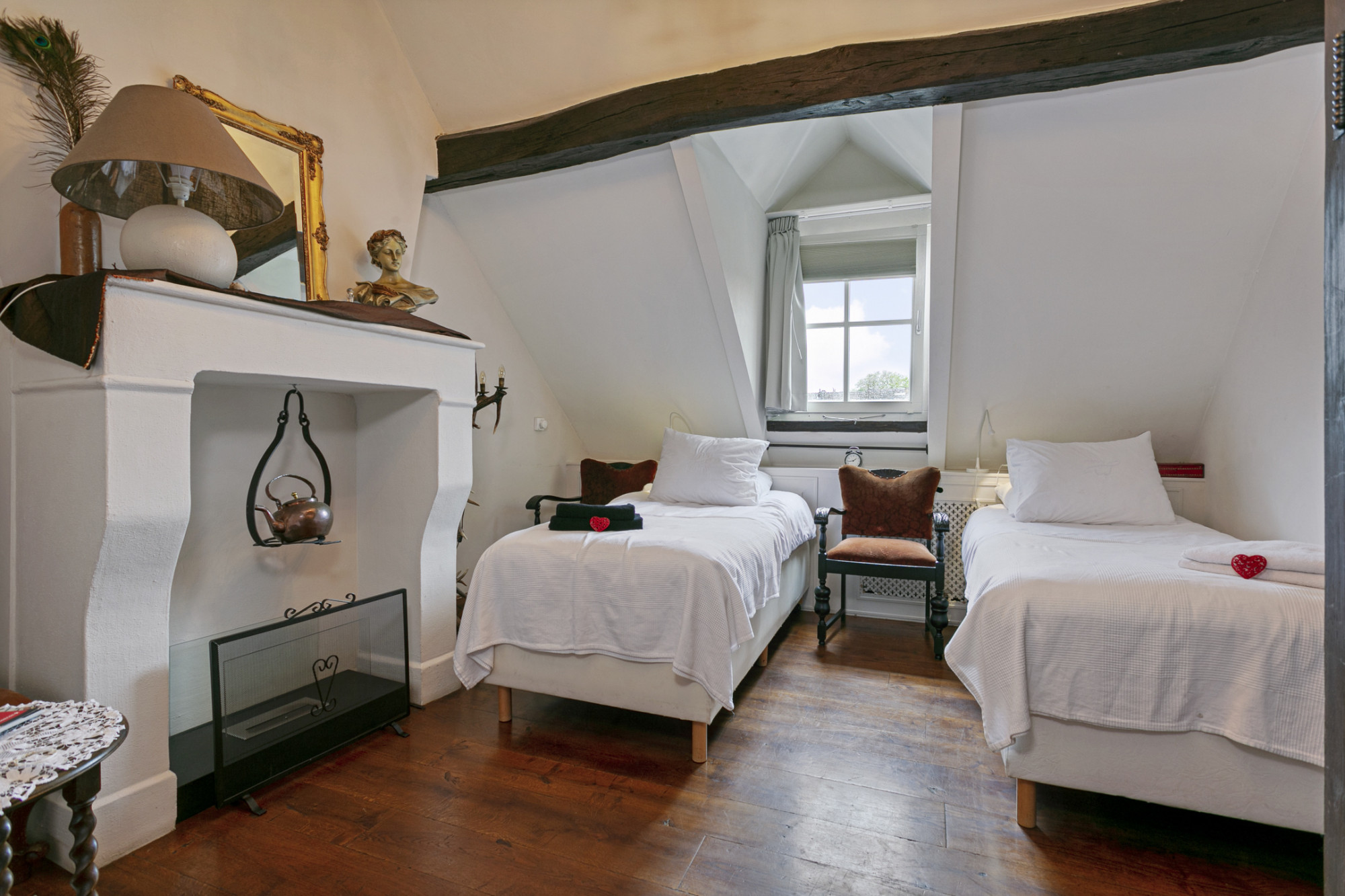 De slaapkamer achter de bibliotheek heeft 2 verdiepingen boven de poortvleugel, alwaar een kantoor ingericht kan worden.