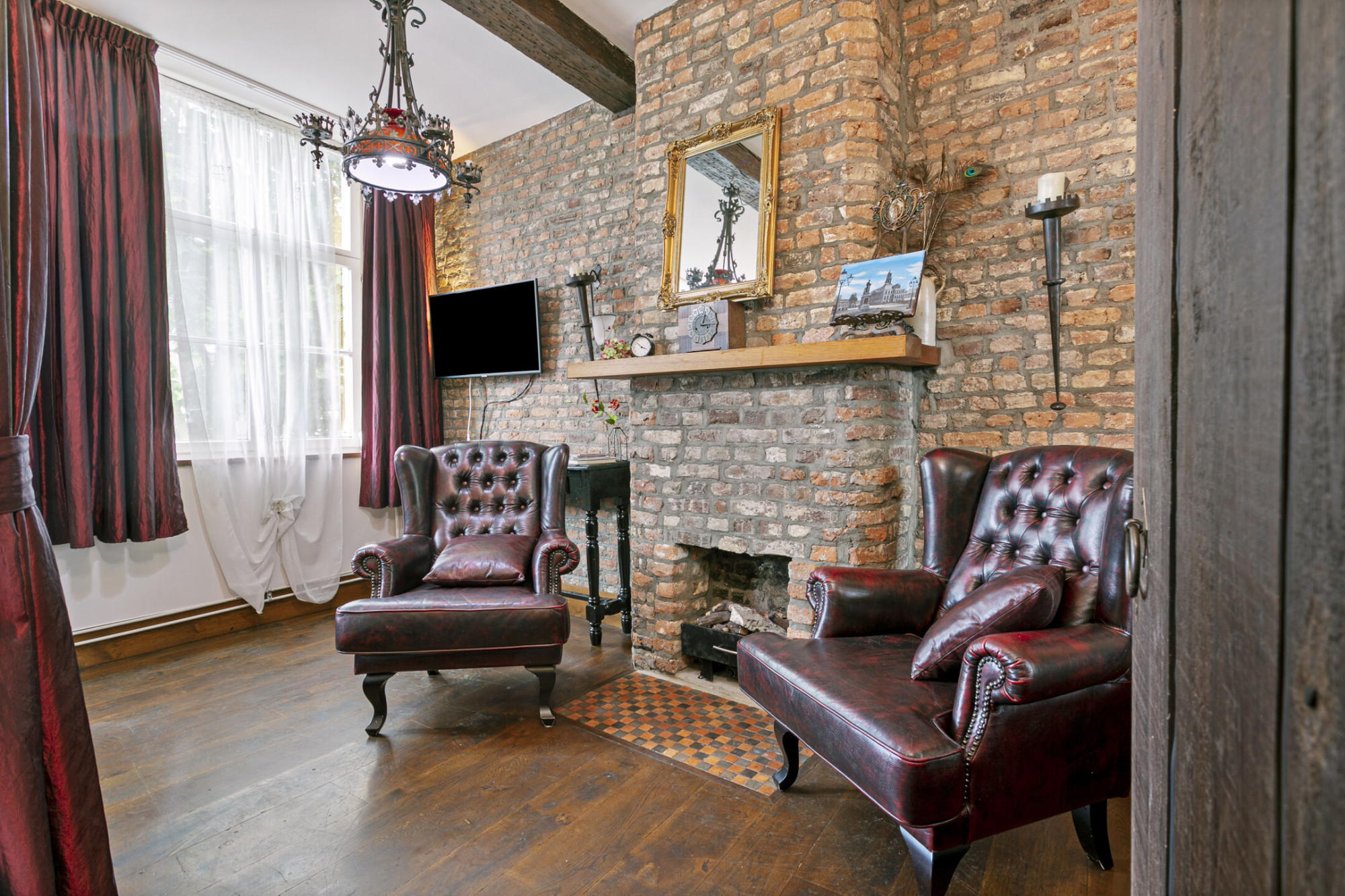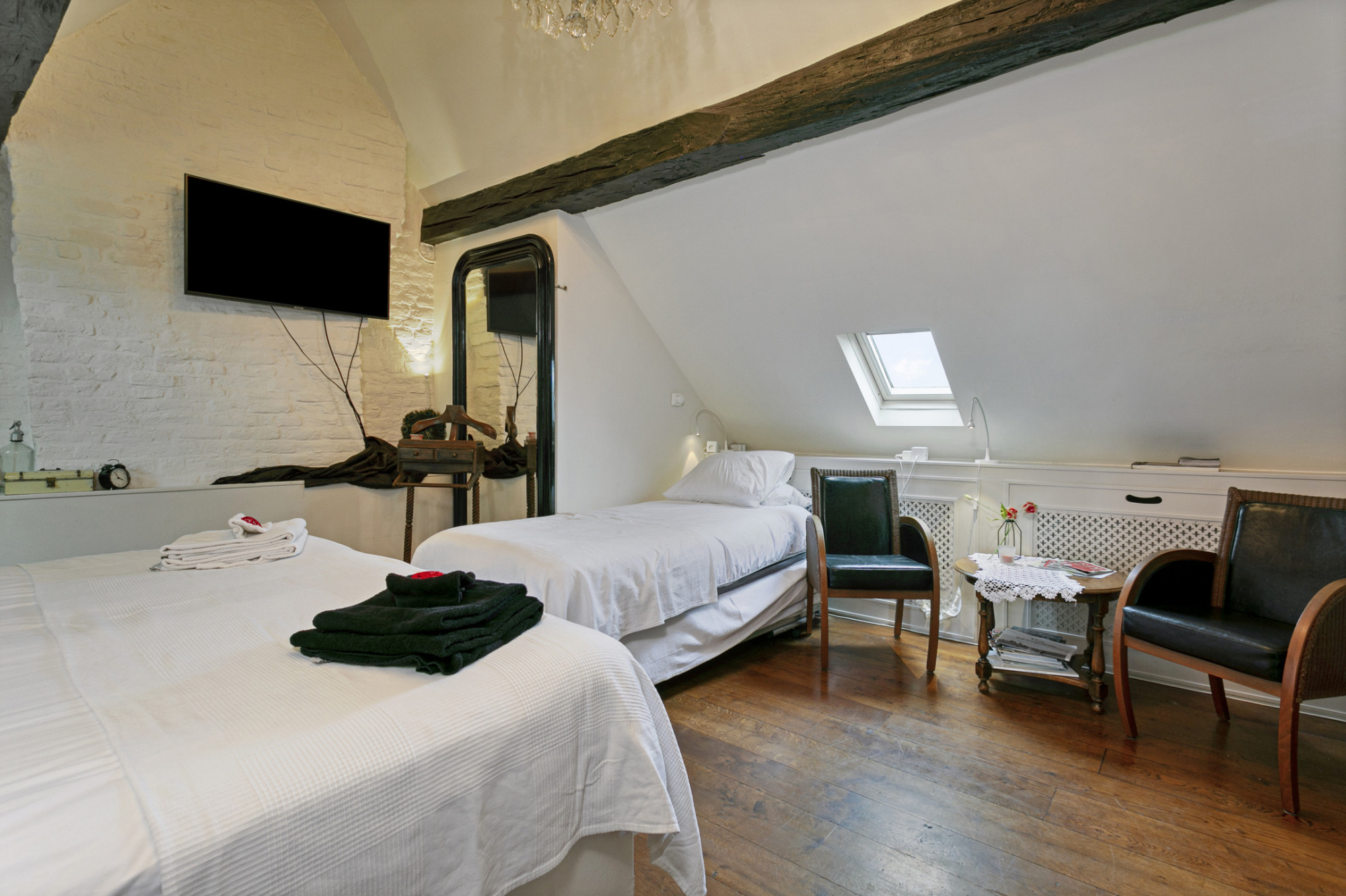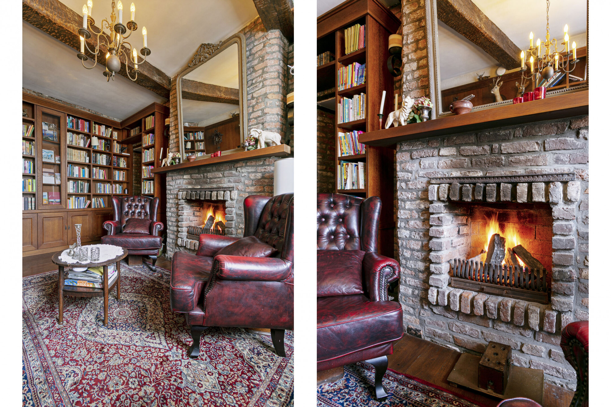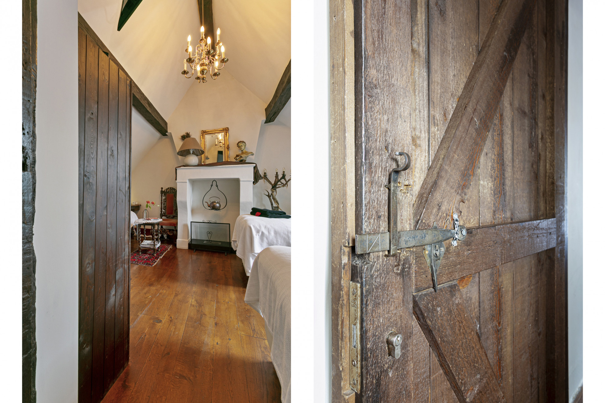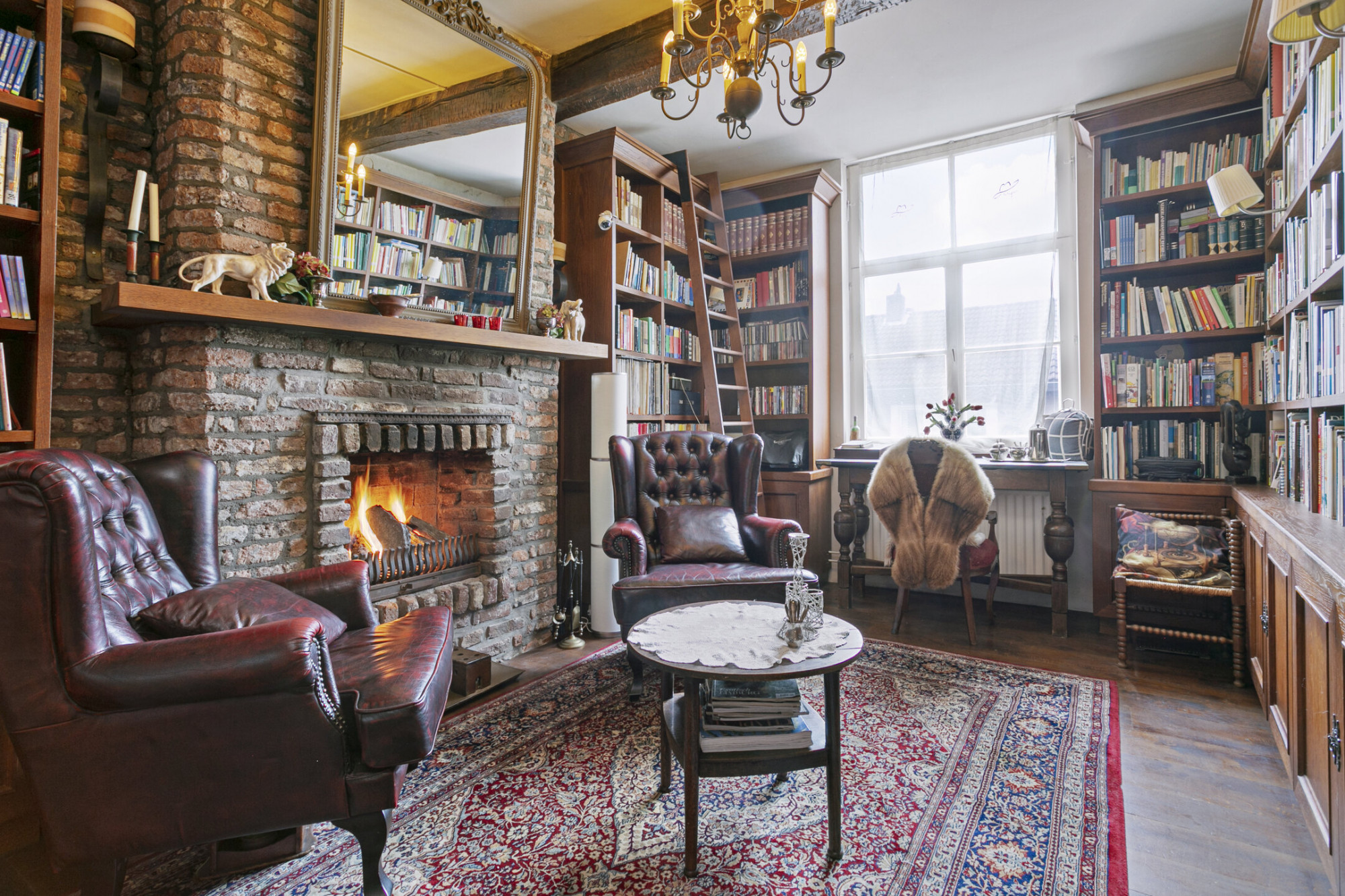 De slaapkamer achter de bibliotheek heeft 2 verdiepingen boven de poortvleugel, alwaar een kantoor ingericht kan worden.