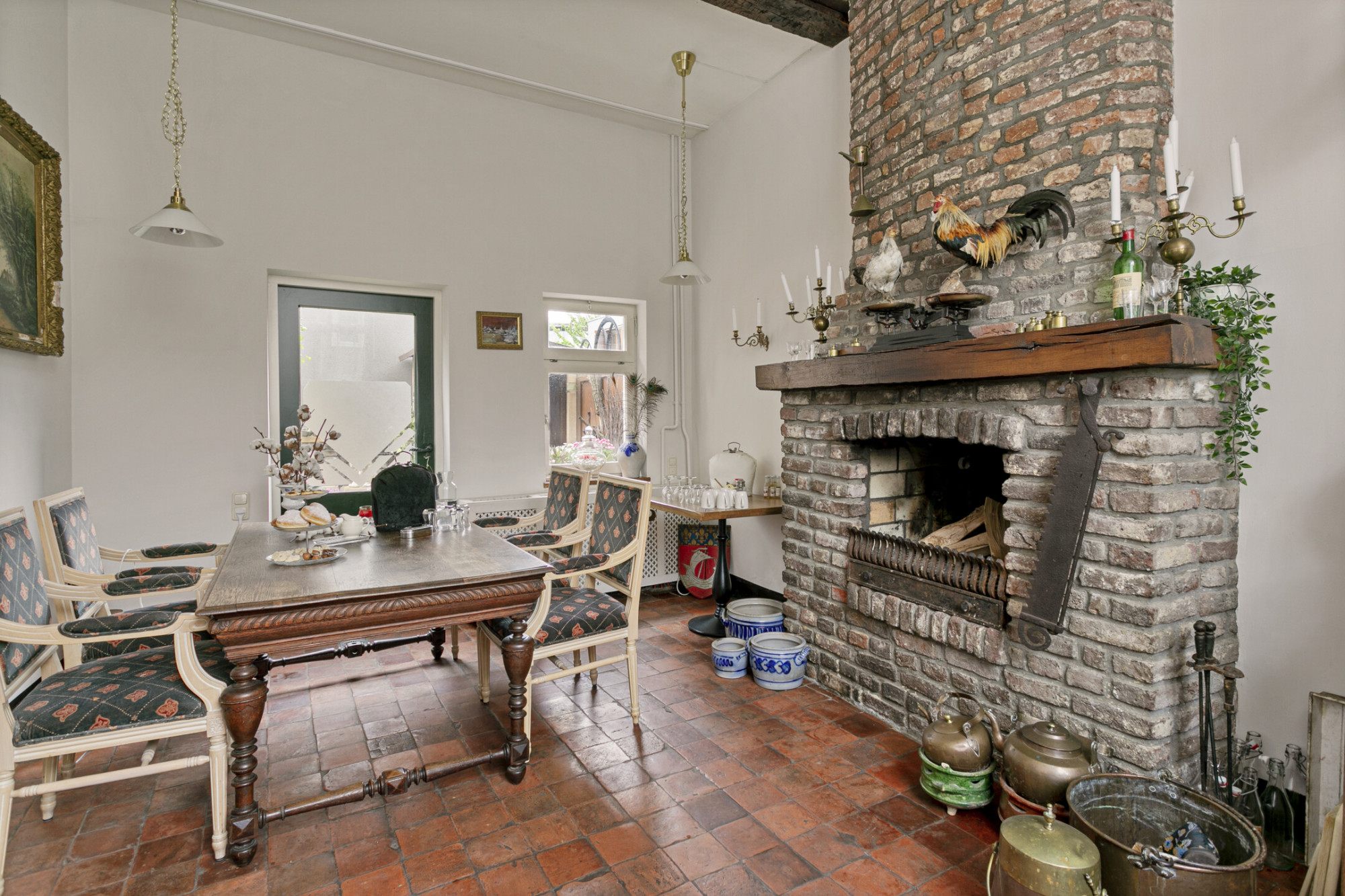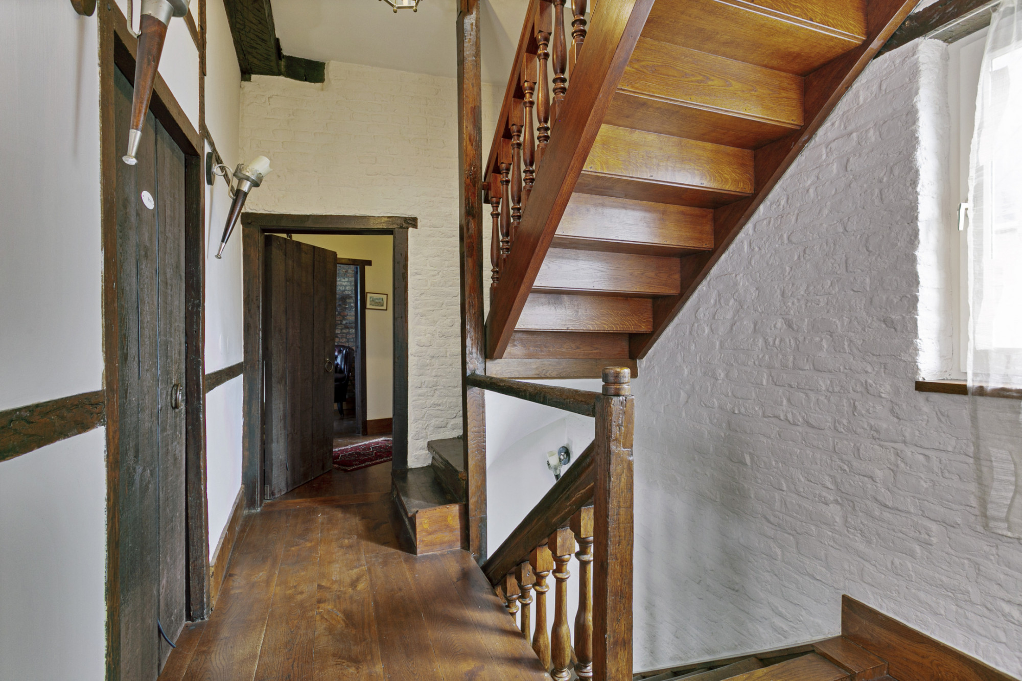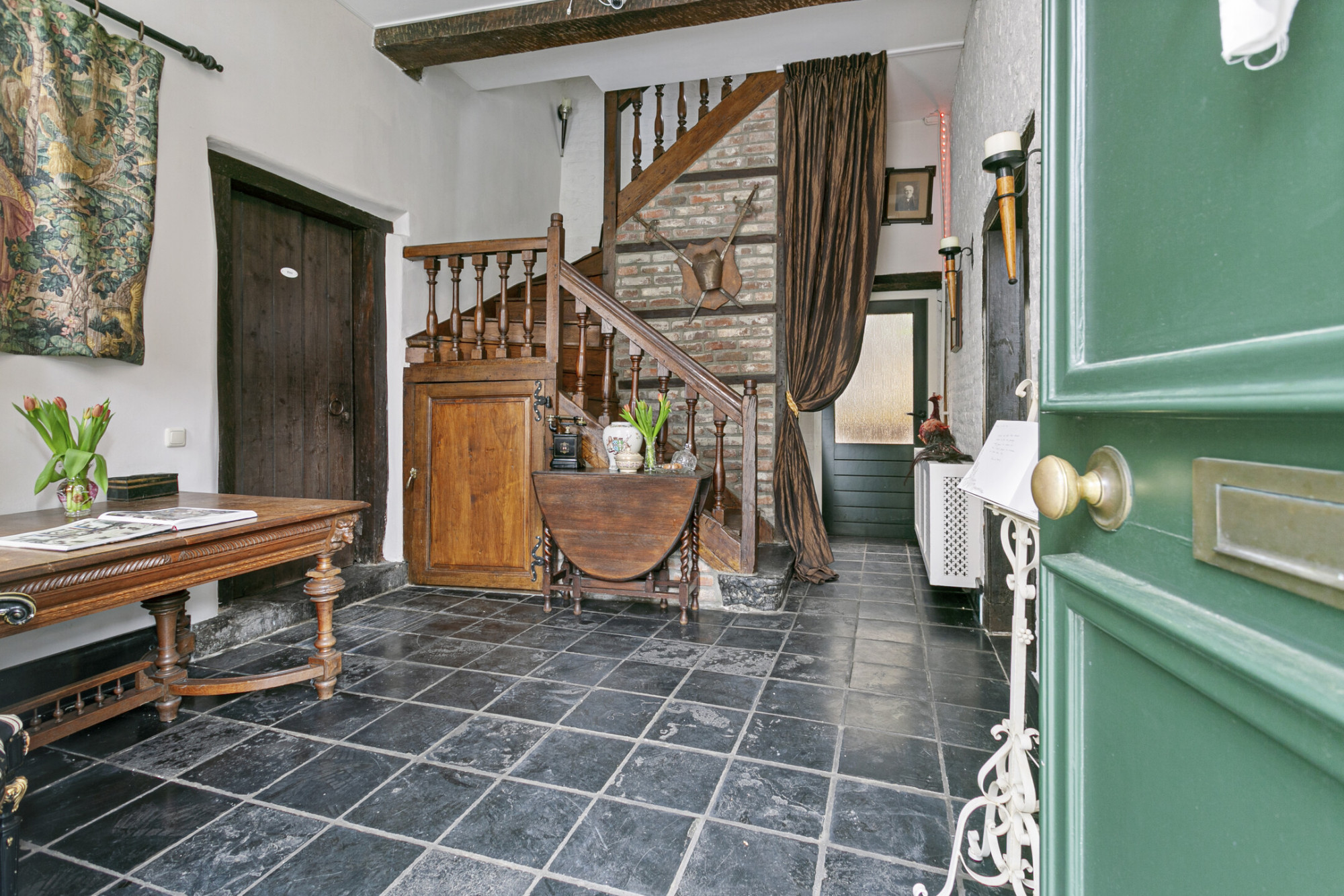 Bij binnenkomst ademt de ruimte direct sfeer. De trappartij, waarbij het originele houtwerk nog te zien is, springt direct in het oog. Onder de trappartij bevindt zich het gastentoilet met klassiek fonteintje. Middels nieuwe doch authentieke deuren komt u rechts in de keuken voorzien van alle denkbare gemakken. De antieke boeren plavuizenvloer is voorzien van vloerverwarming en er is tevens een haardpartij aanwezig. Aan de linkerzijde van de entree bevindt zich de living met openslaande deuren naar de patiotuin. Ook hier is een haardpartij en zijn er authentieke elementen zichtbaar zoals de balkenstructuur. Tevens is de kelder vanuit de living bereikbaar.